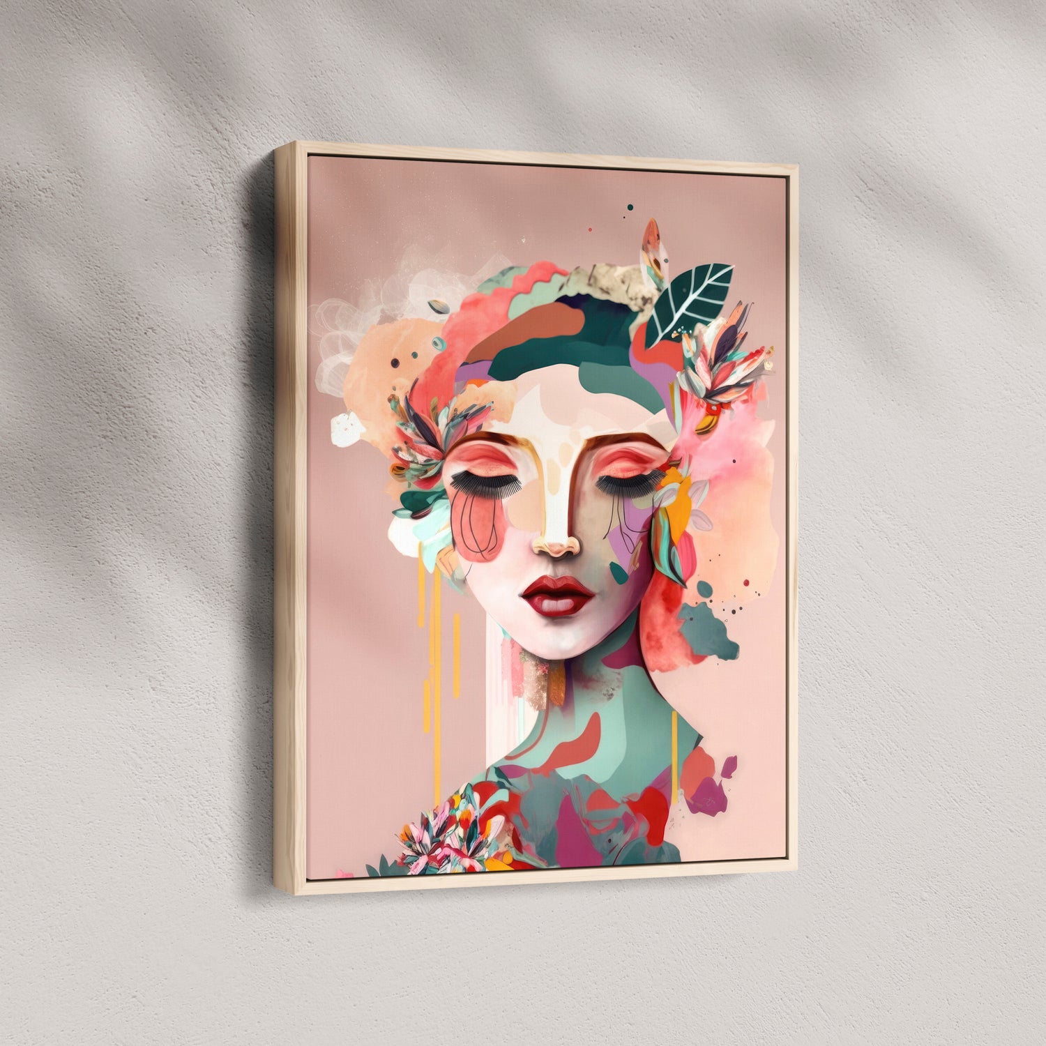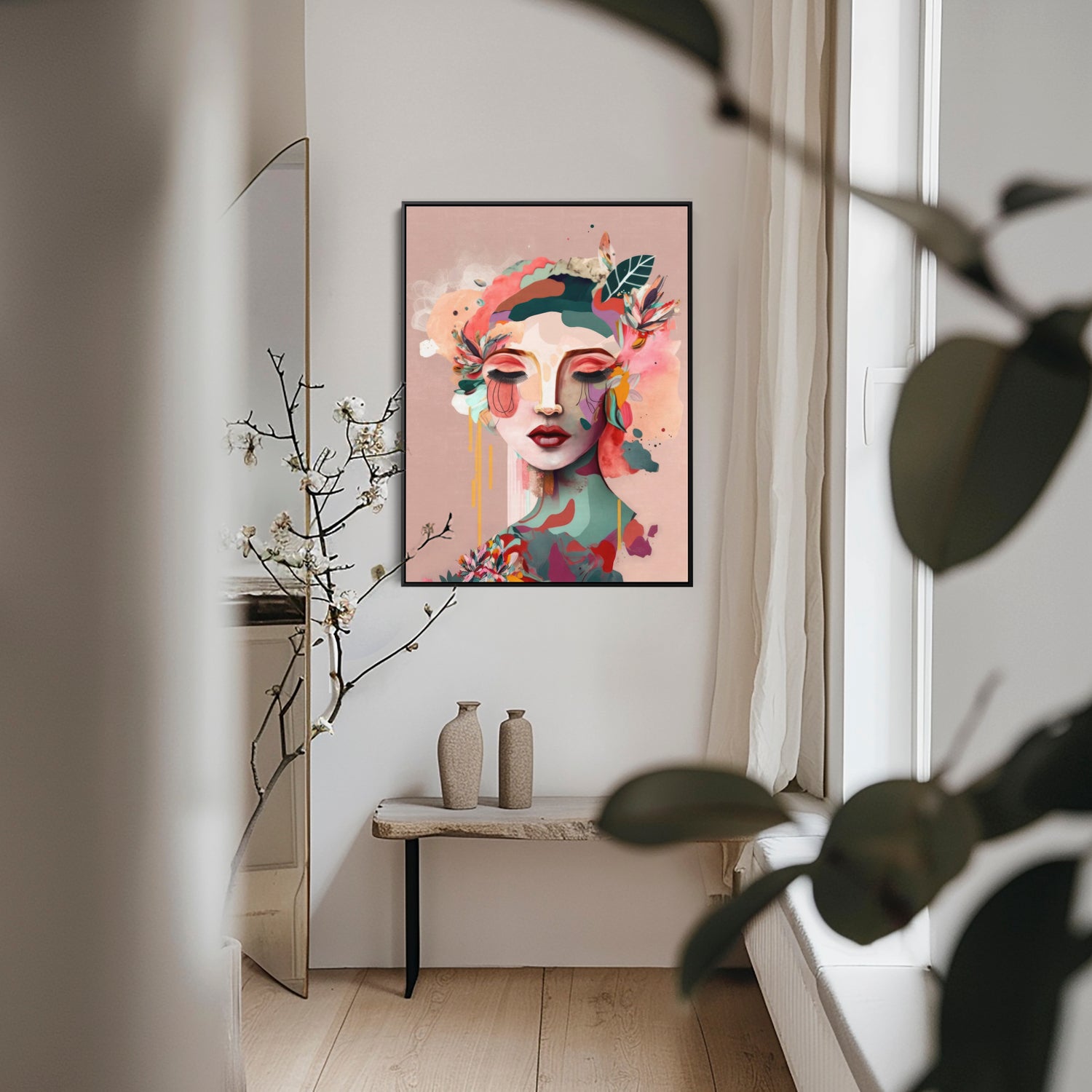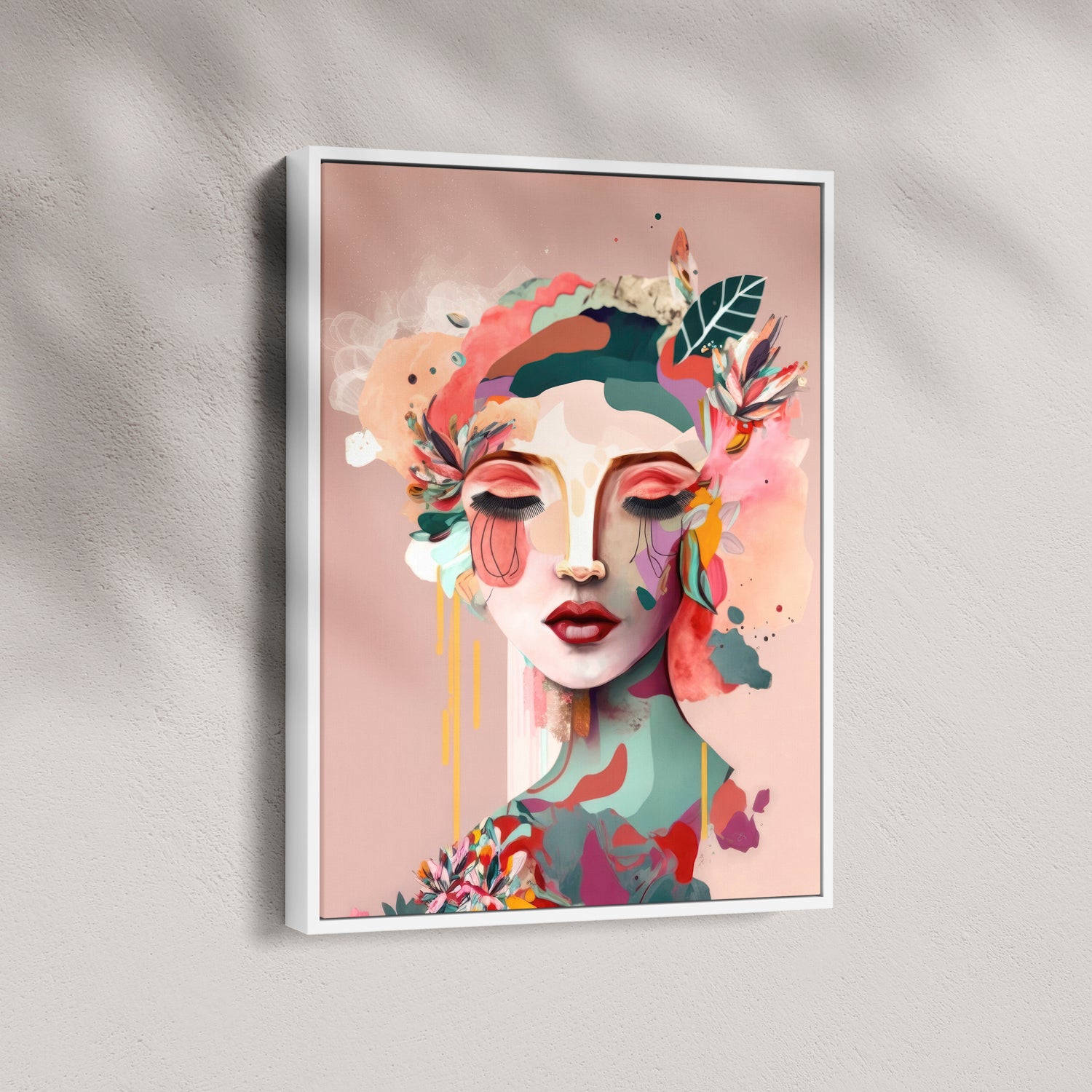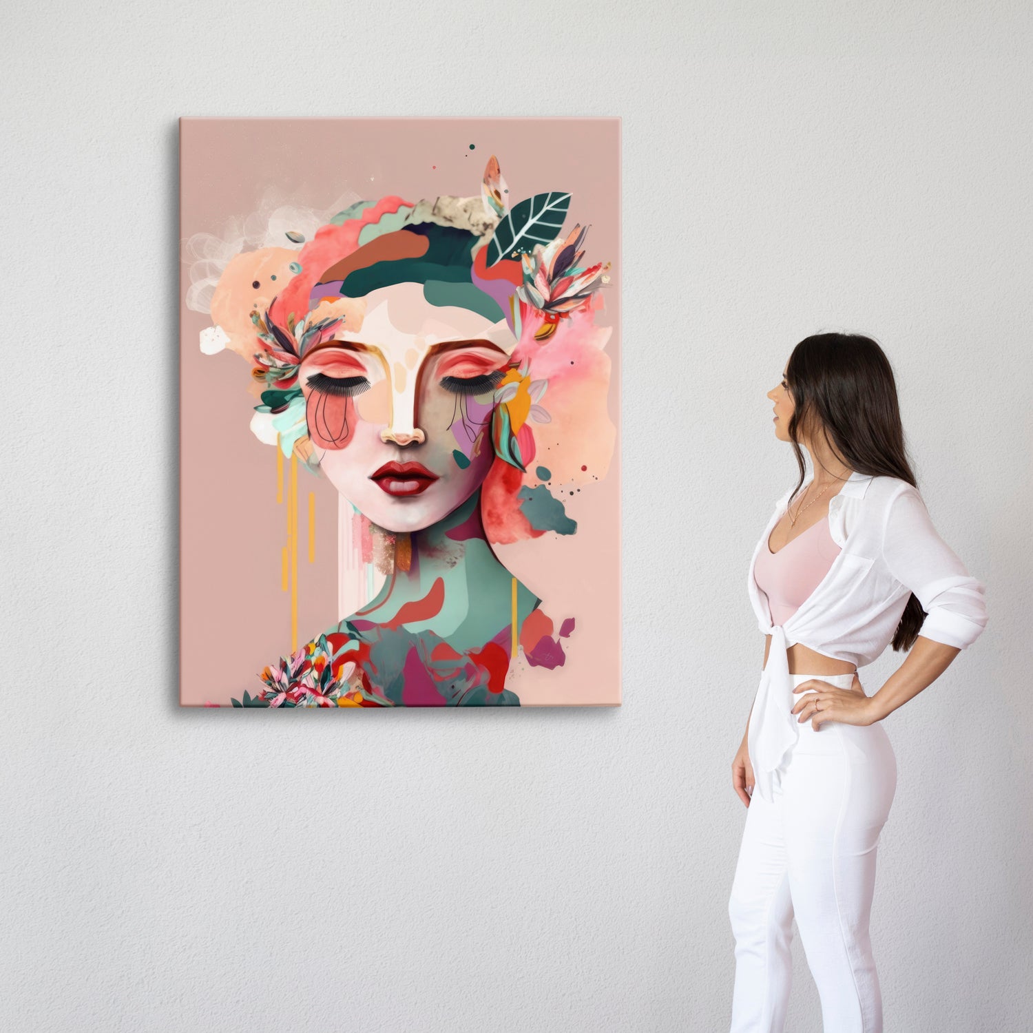 Bettina is a celebration of fierce beauty and untamed colour. With her eyes gently closed and bold tones blooming across her form, she feels like a daydream painted with fire and florals.