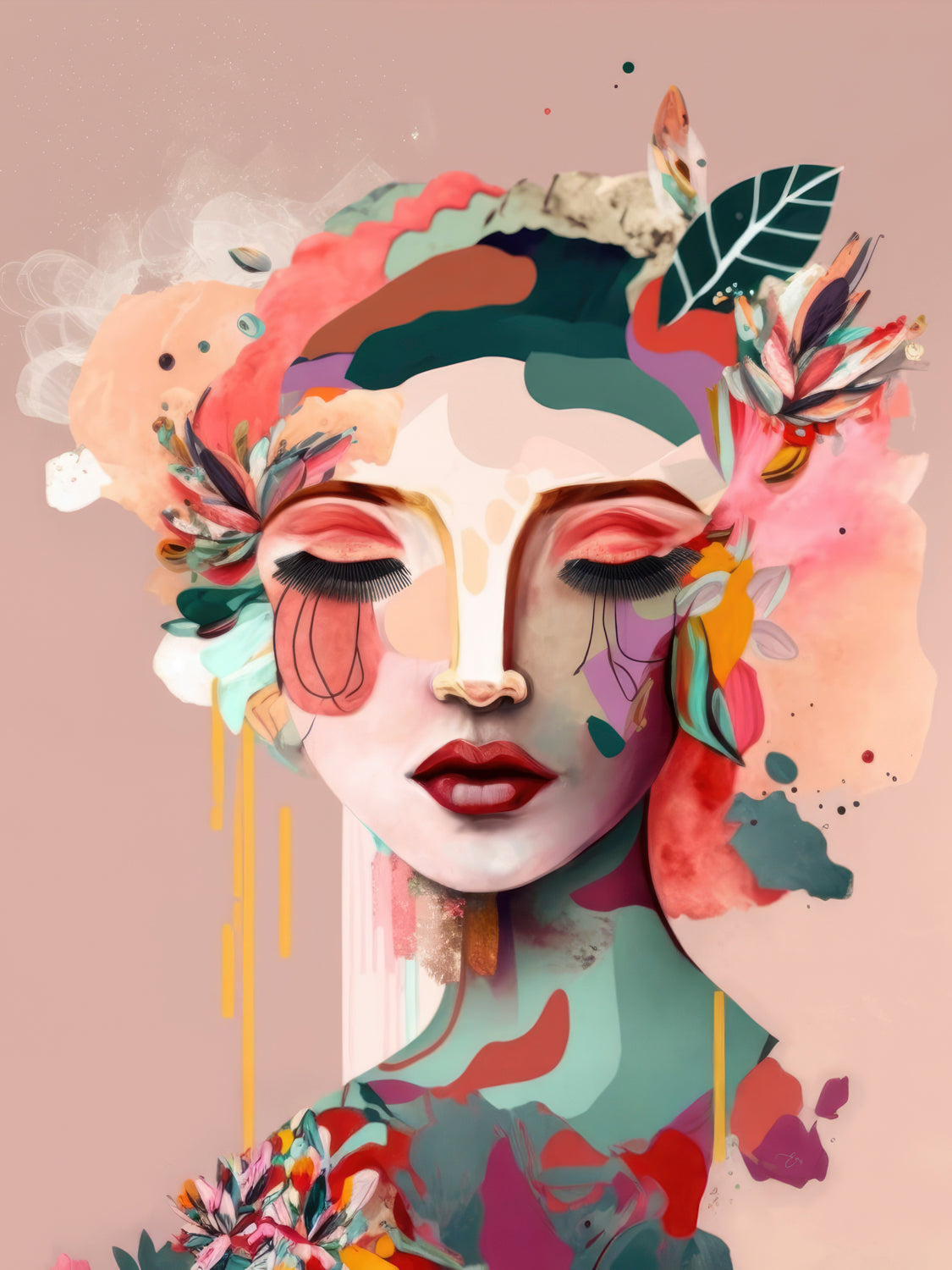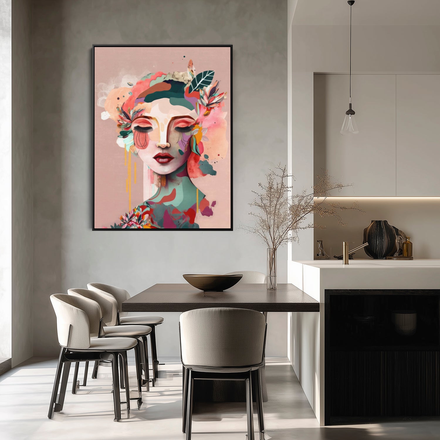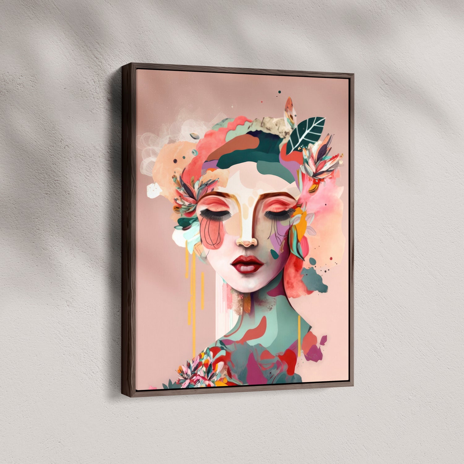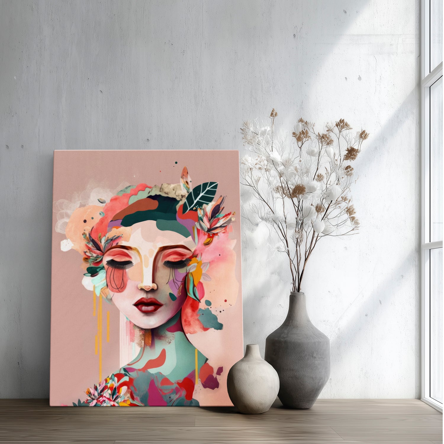 Bettina is a celebration of fierce beauty and untamed colour. With her eyes gently closed and bold tones blooming across her form, she feels like a daydream painted with fire and florals.