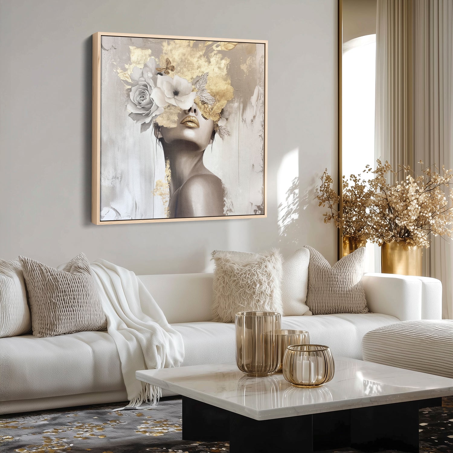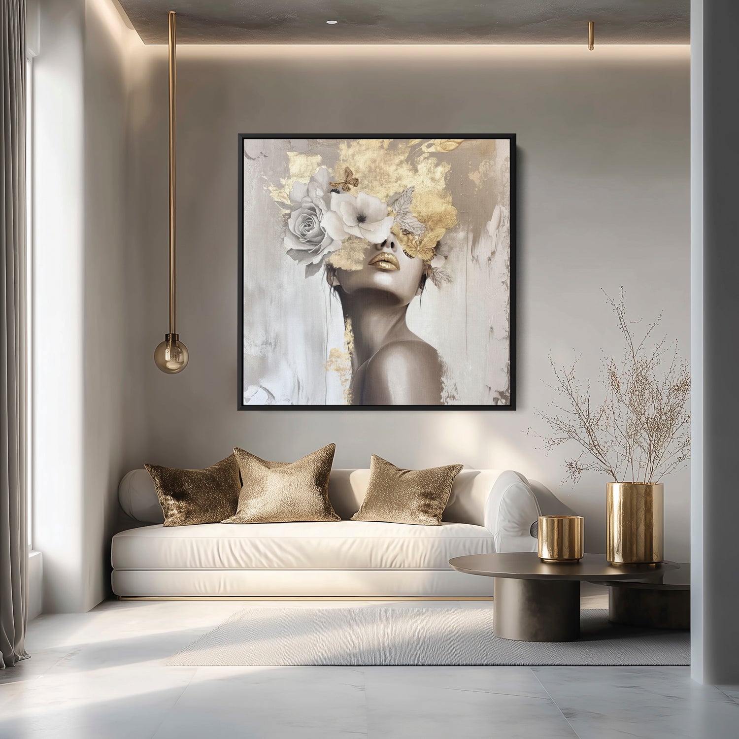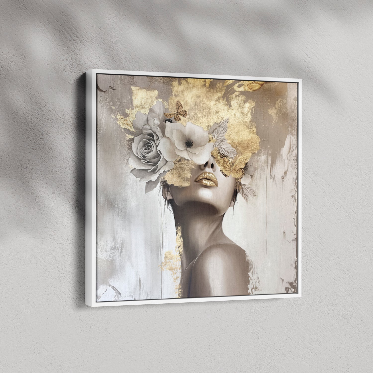 A portrait of golden stillness, Butterfluer blends softness and opulence in a single, striking glance. Gilded butterflies and florals crown her gaze, while gold-brushed lips elevate the elegance with quiet confidence.