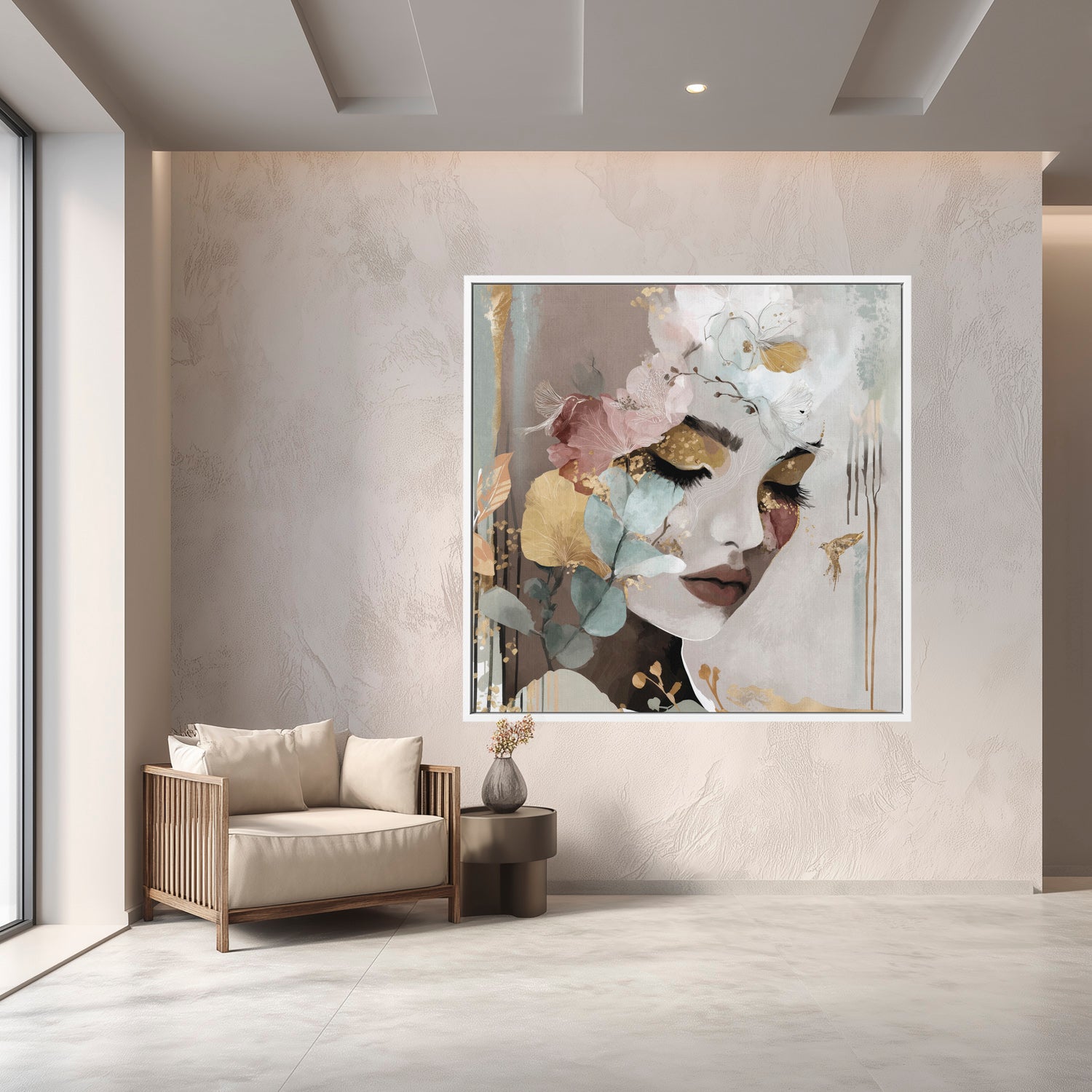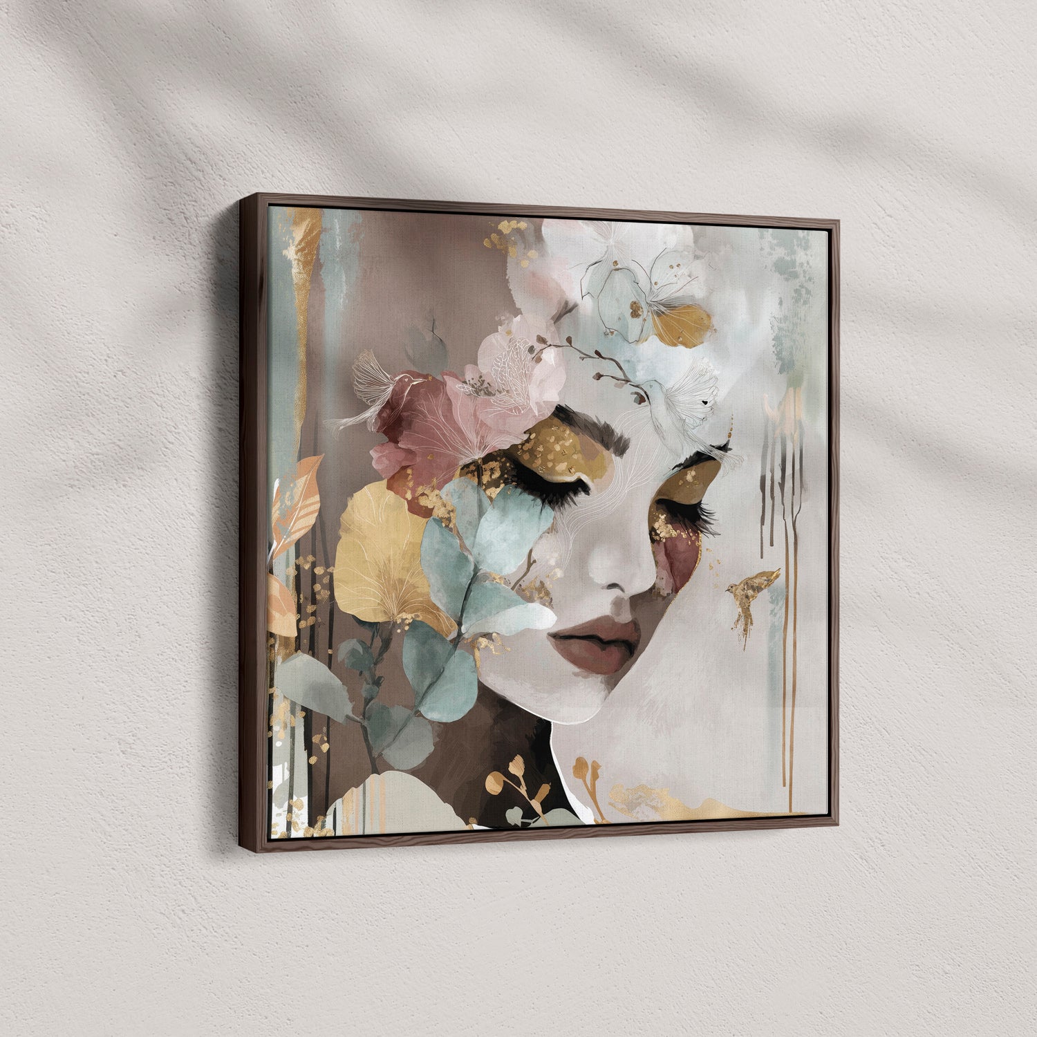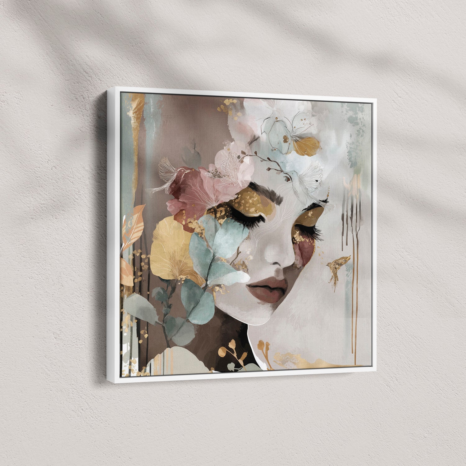 Her eyes fall closed as if listening to the hush of flowers and the flutter of wings. Gold leaf drifts across her skin like sunlight breaking through clouds, while pastel petals weave a dreamlike softness around her.