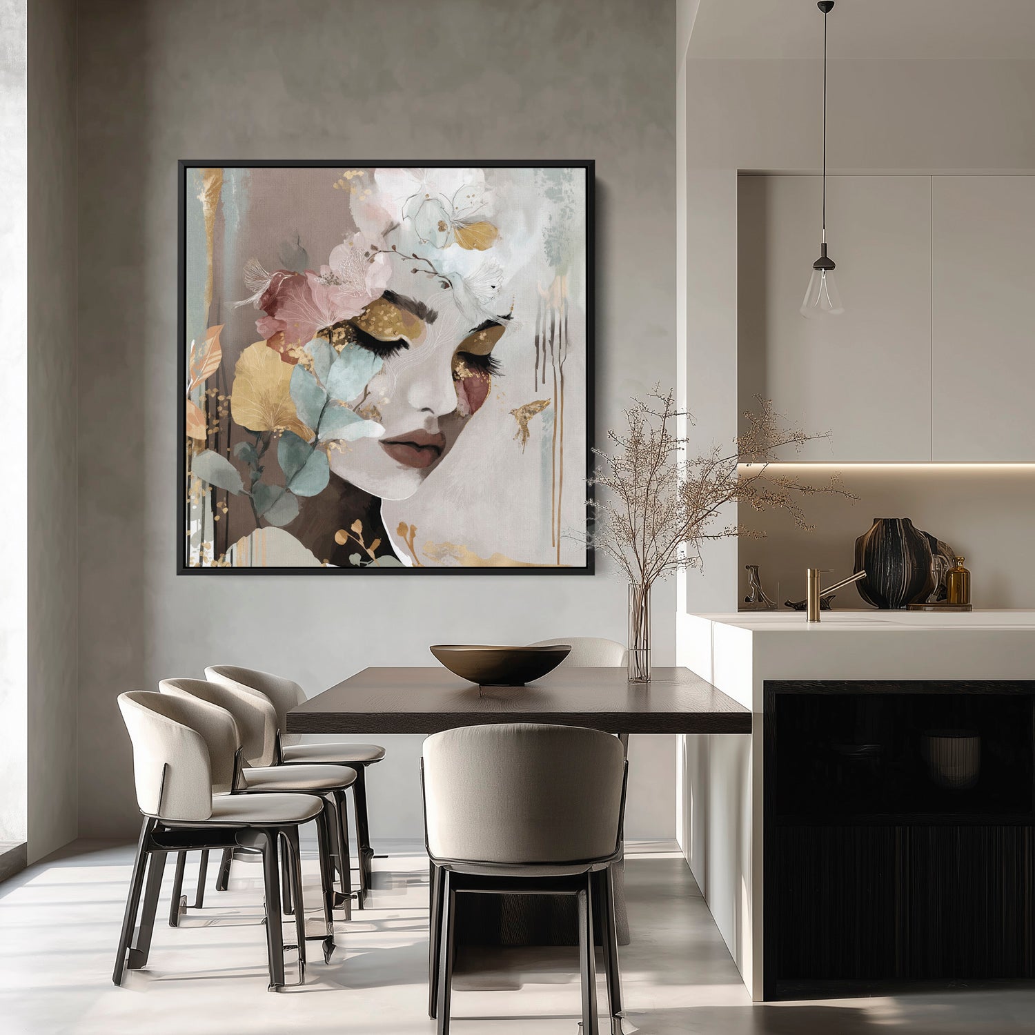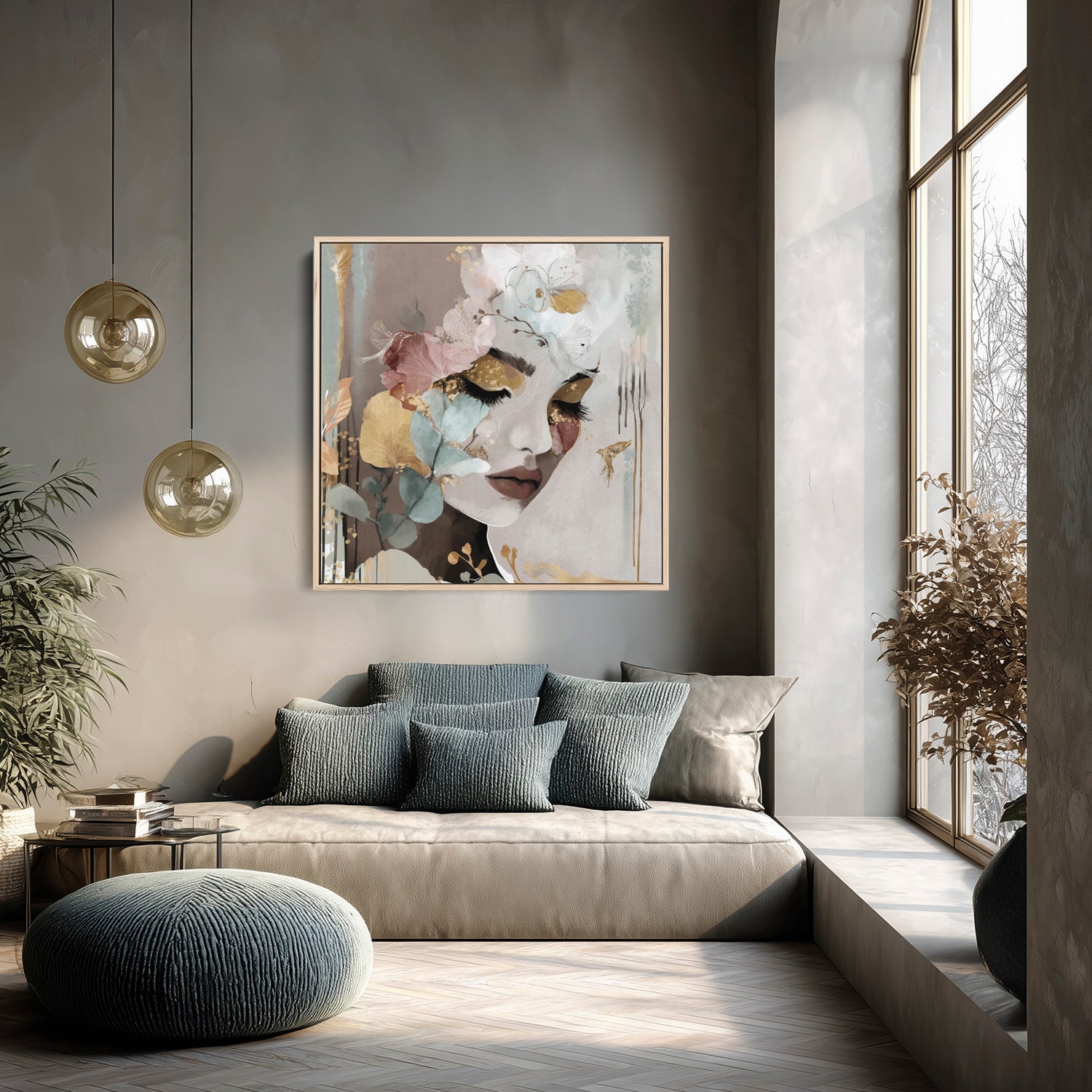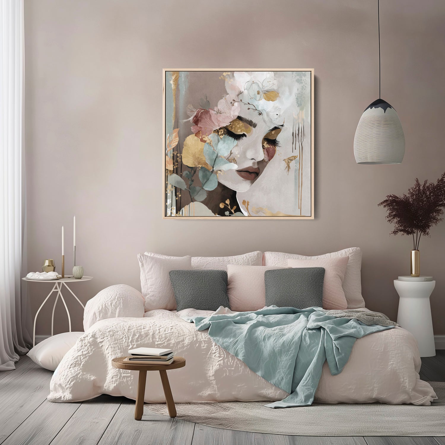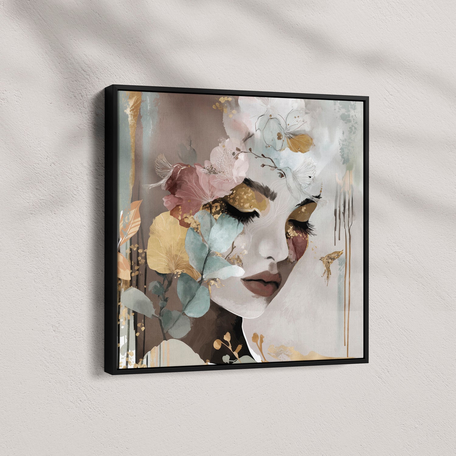 Her eyes fall closed as if listening to the hush of flowers and the flutter of wings. Gold leaf drifts across her skin like sunlight breaking through clouds, while pastel petals weave a dreamlike softness around her.