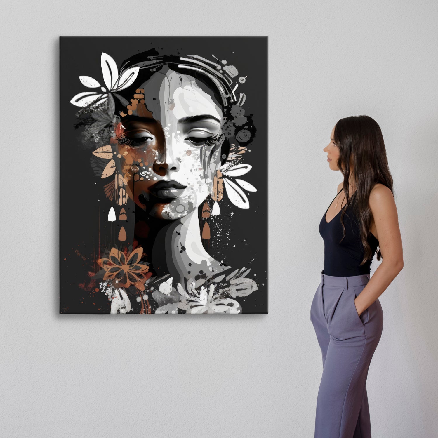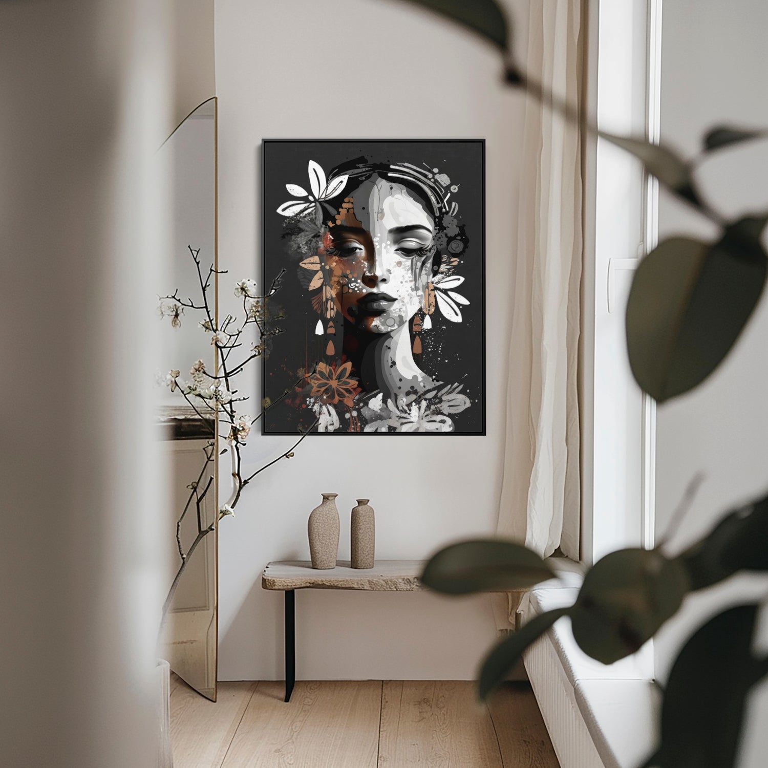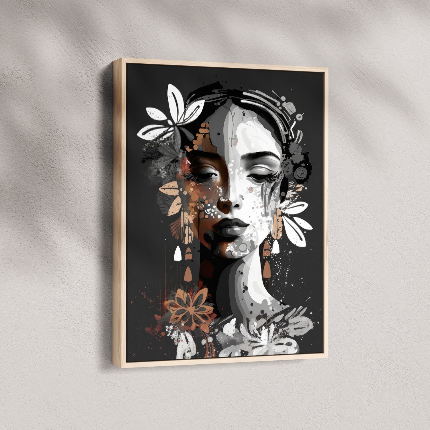 Rooted in mystery and strength, Cedar Claire is a vision of quiet power. Her expression is calm but commanding, woven with earthy tones, bold florals, and delicate white ink work that contrasts against deep shadow. A soulful piece that embodies elegance, contrast, and quiet resilience.