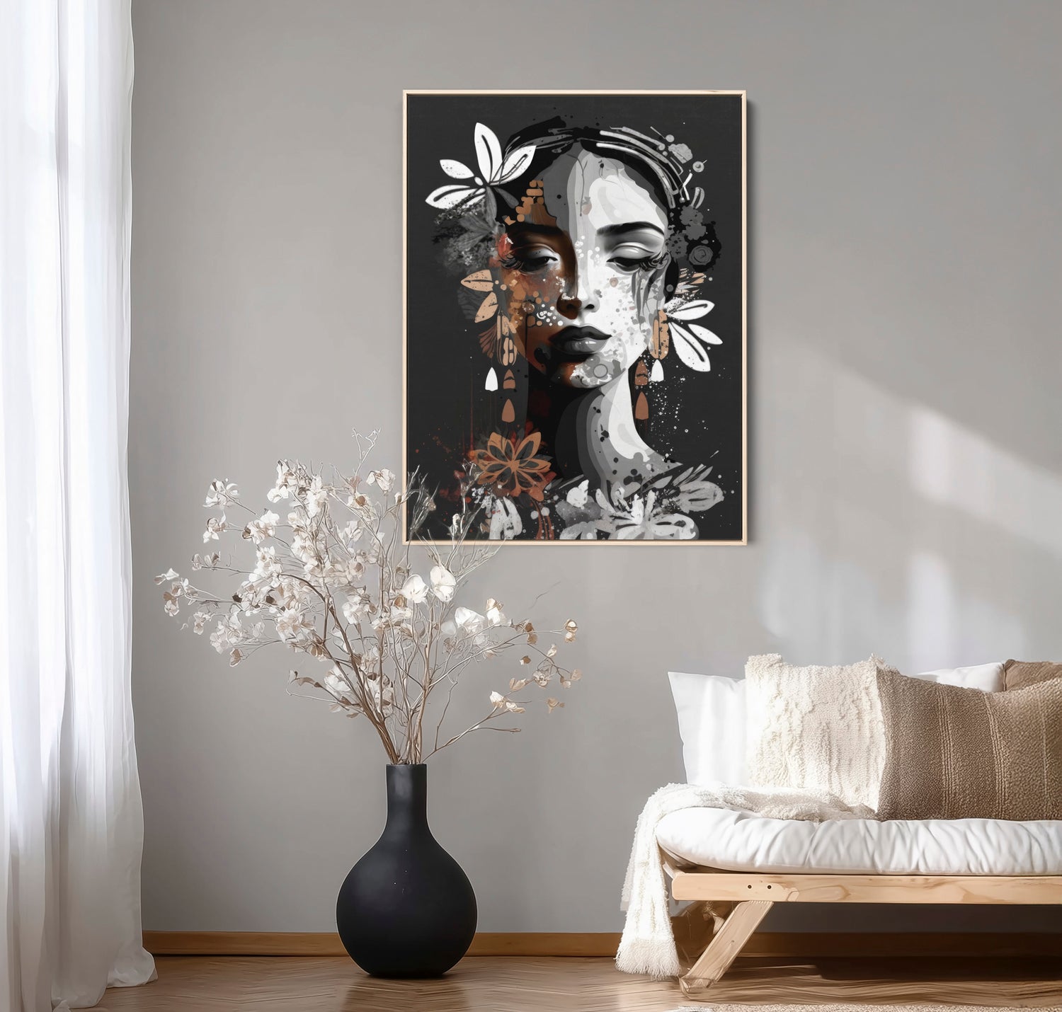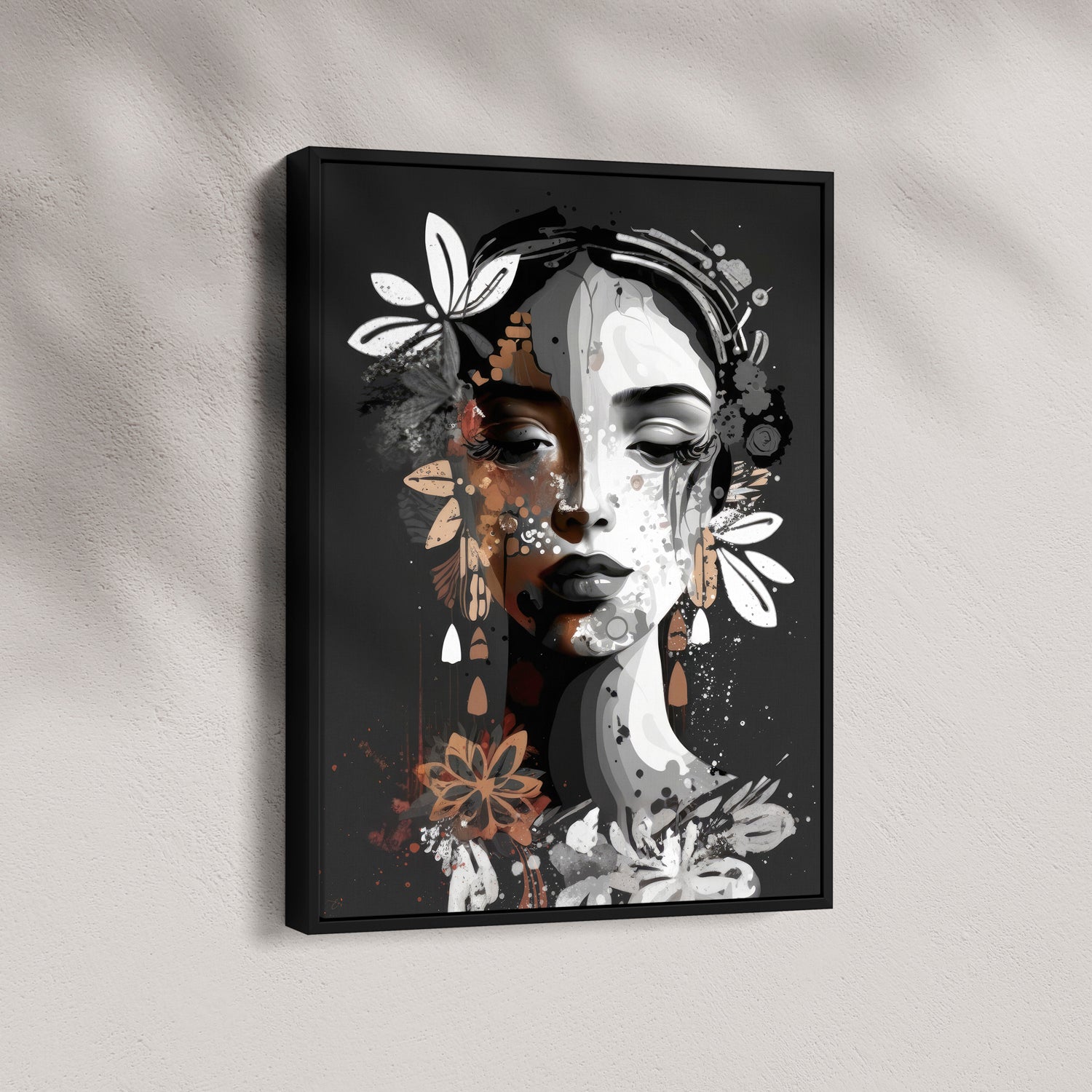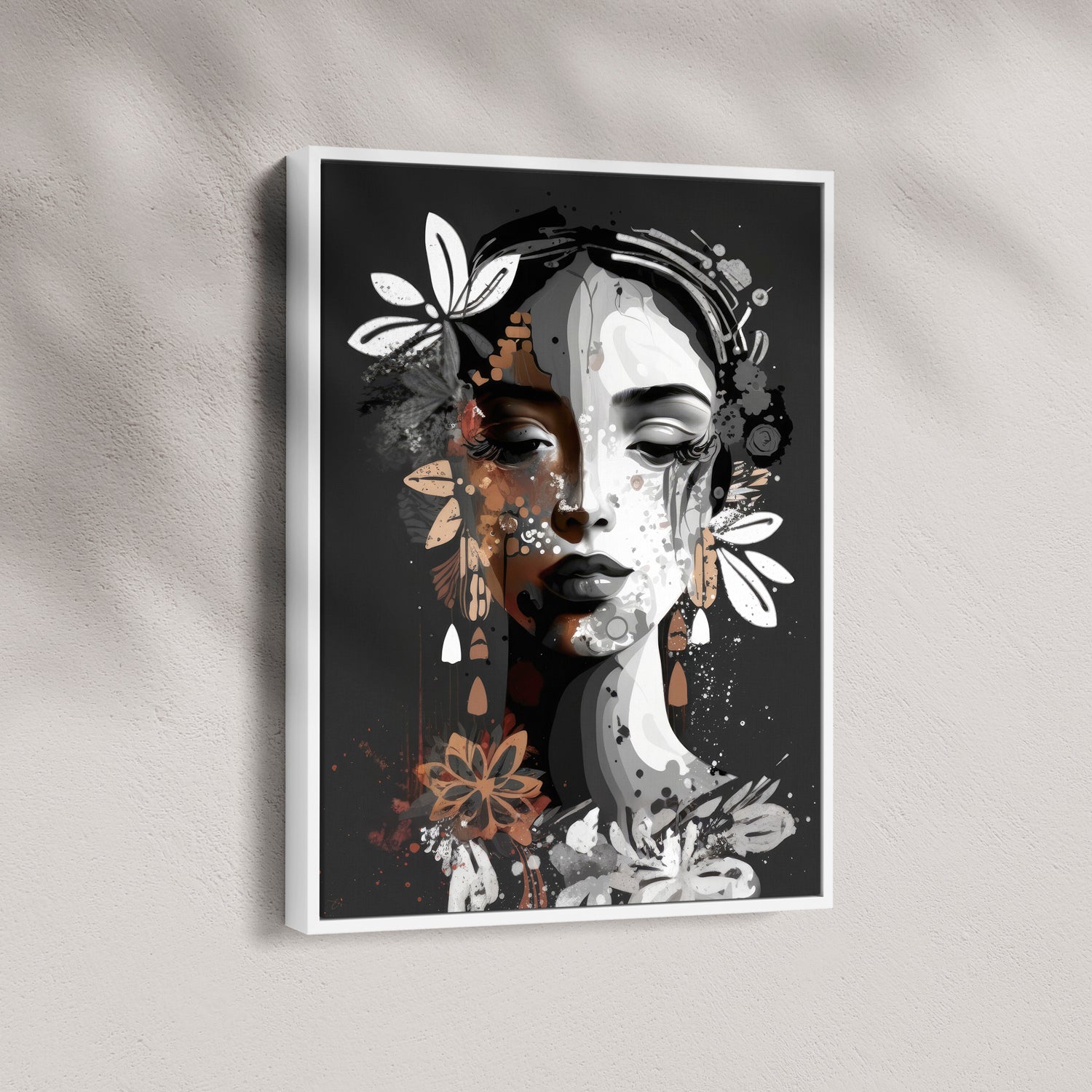 Rooted in mystery and strength, Cedar Claire is a vision of quiet power. Her expression is calm but commanding, woven with earthy tones, bold florals, and delicate white ink work that contrasts against deep shadow. A soulful piece that embodies elegance, contrast, and quiet resilience.