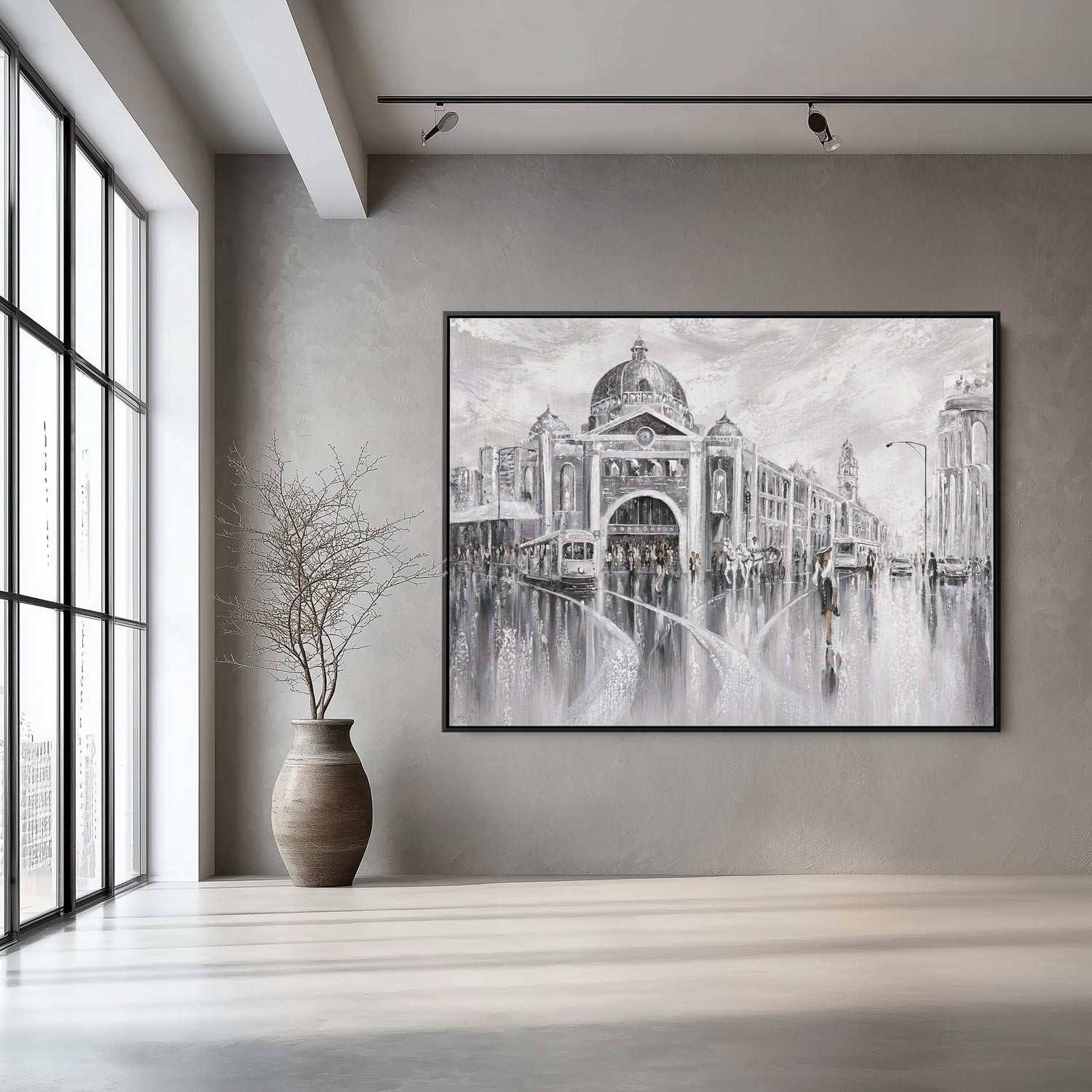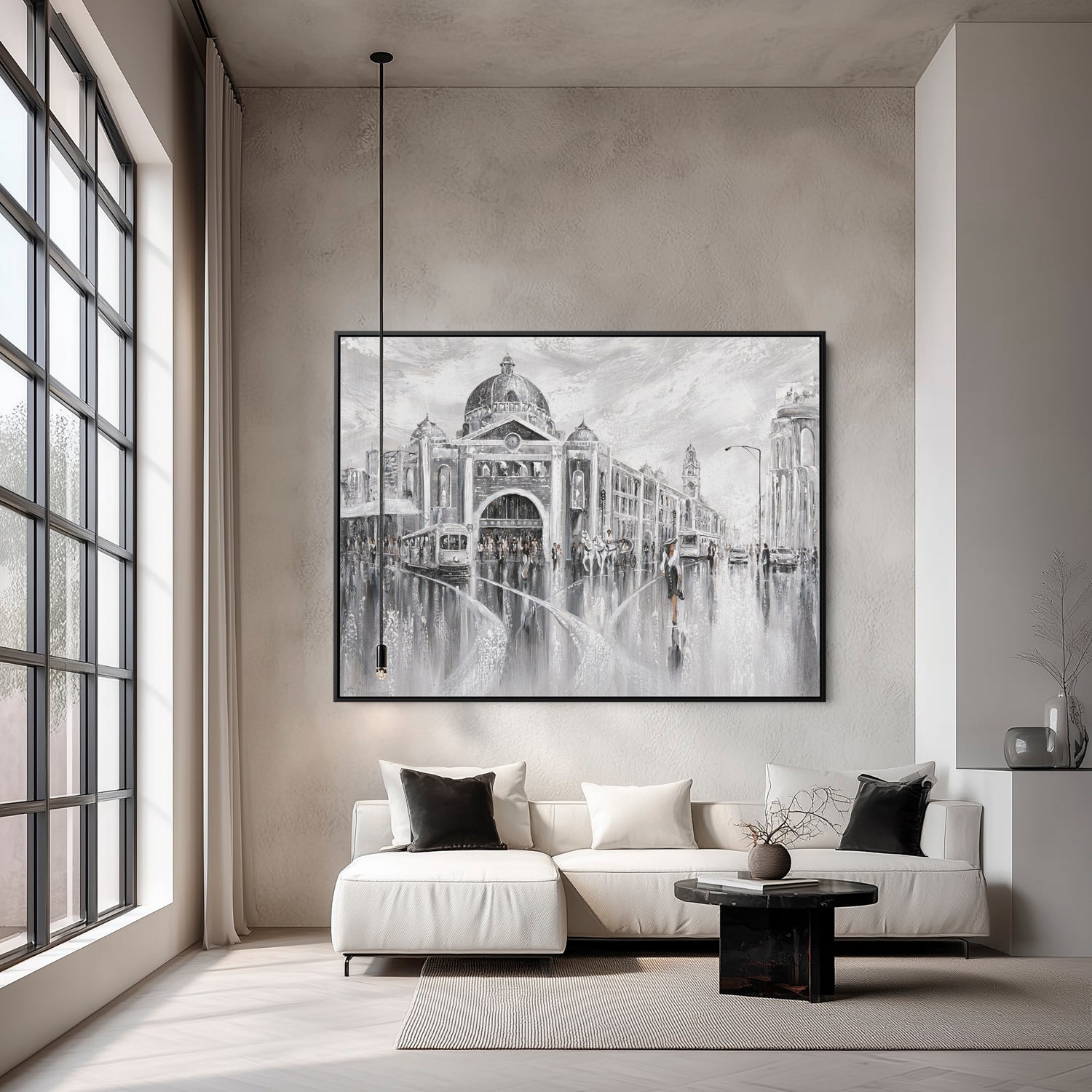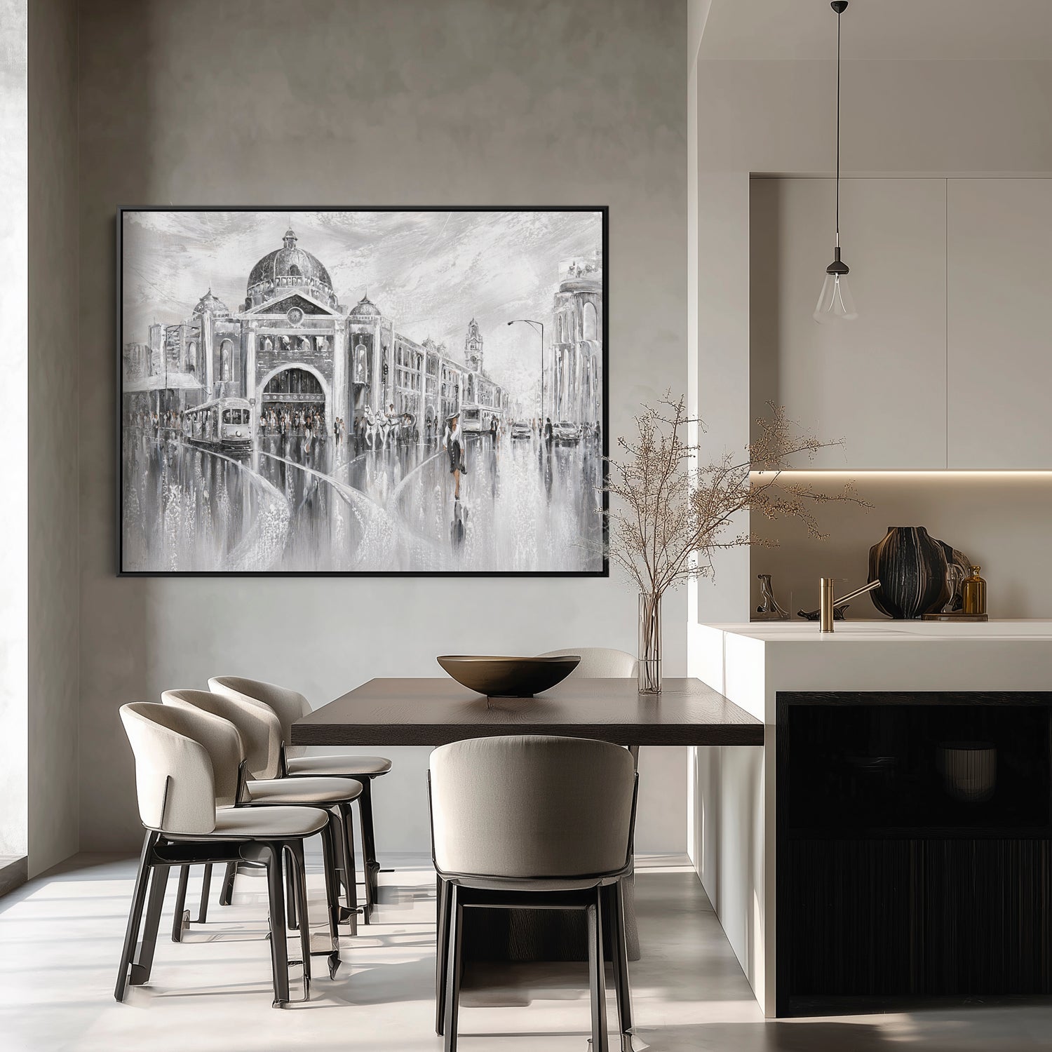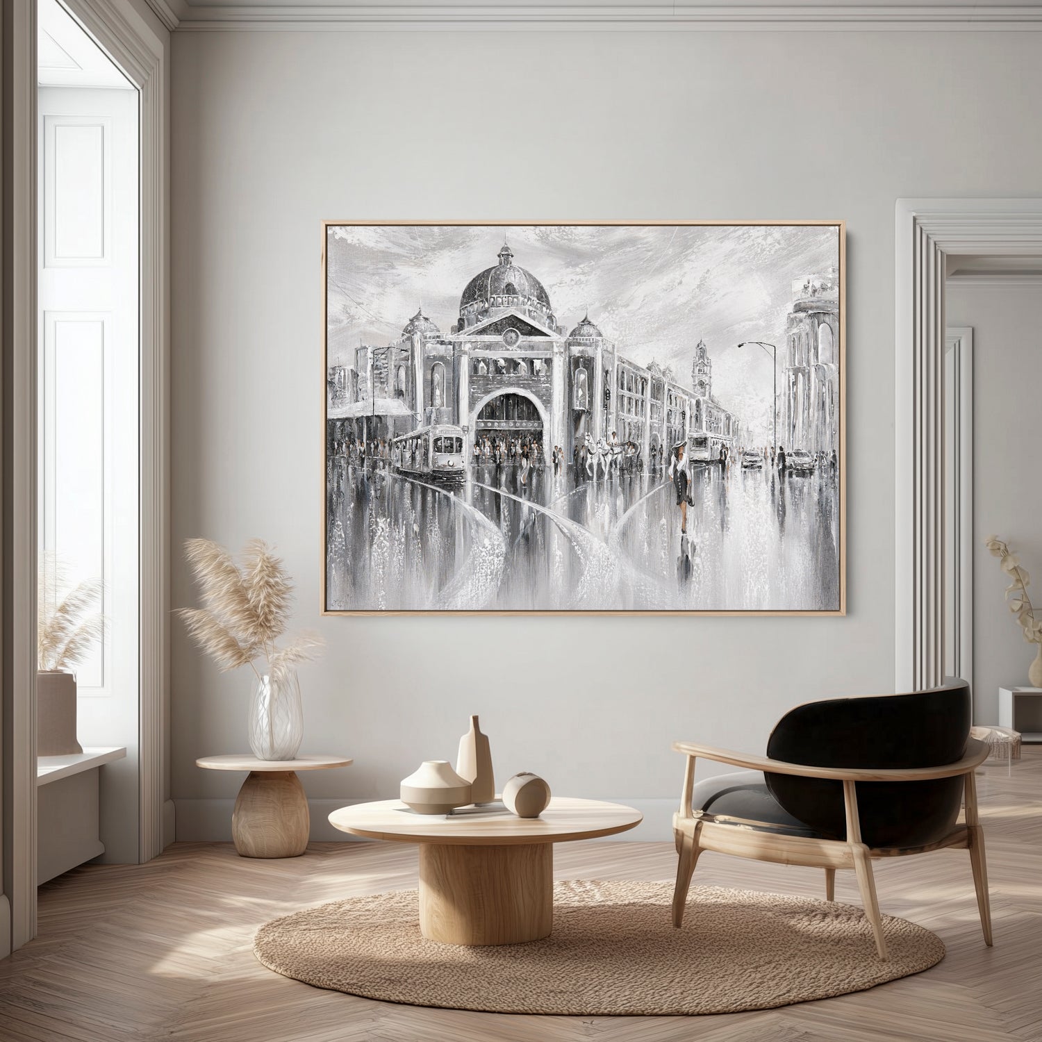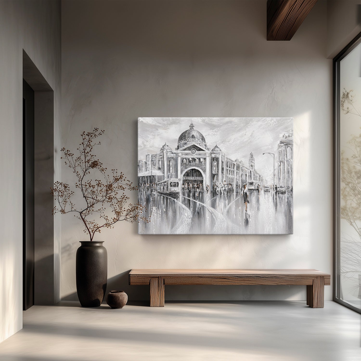 Timeless and cinematic, this piece captures Melbourne’s iconic Flinders Street in shades of elegance. The tram hums, footsteps echo, and the city pulses with layered stories. The past and the present merging in a beautiful reflection.
