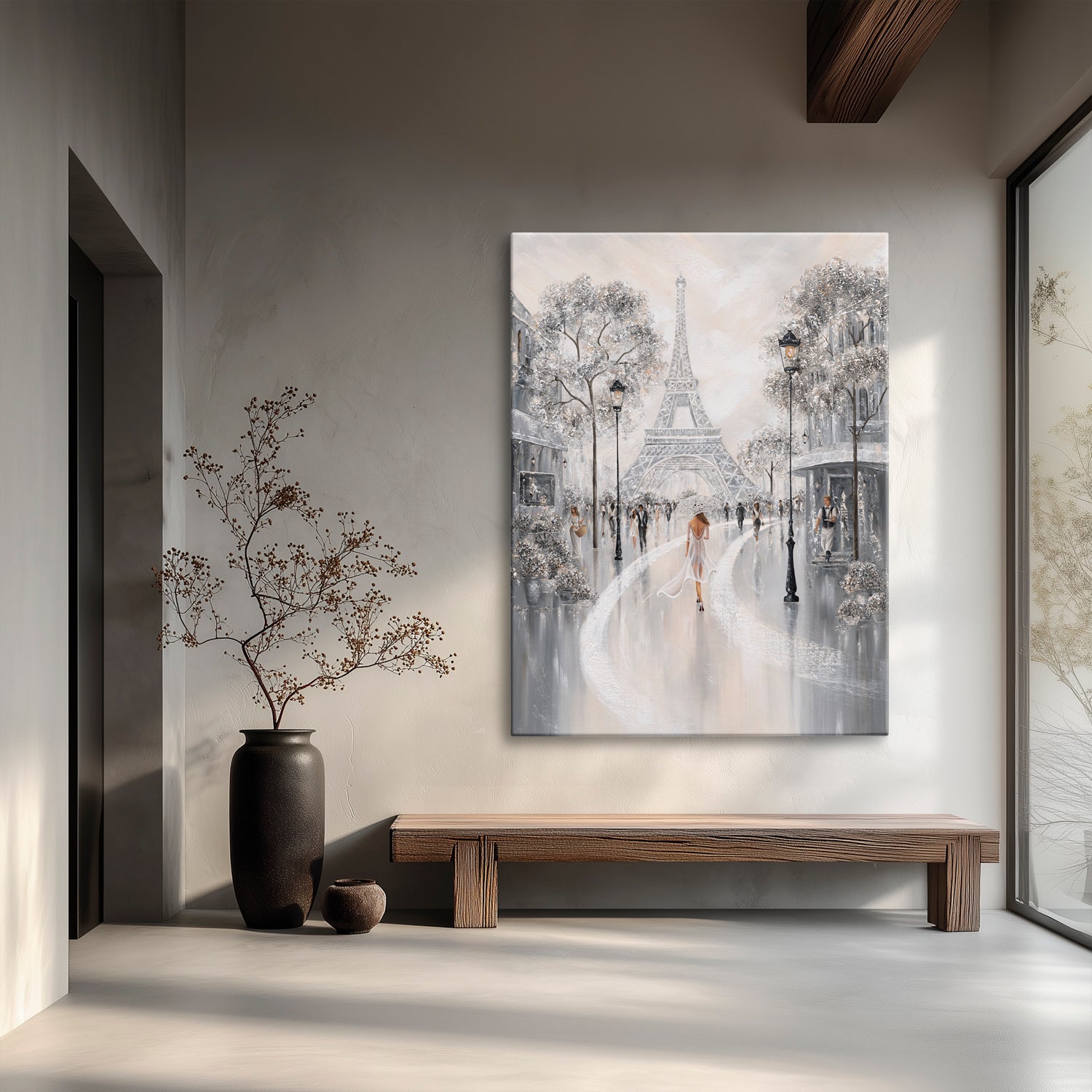 She moves with quiet confidence through the heart of Paris, her veil dancing in the breeze. The Eiffel Tower rises behind her as soft light, grey tones, and blooming trees create a scene of timeless romance and effortless elegance.
