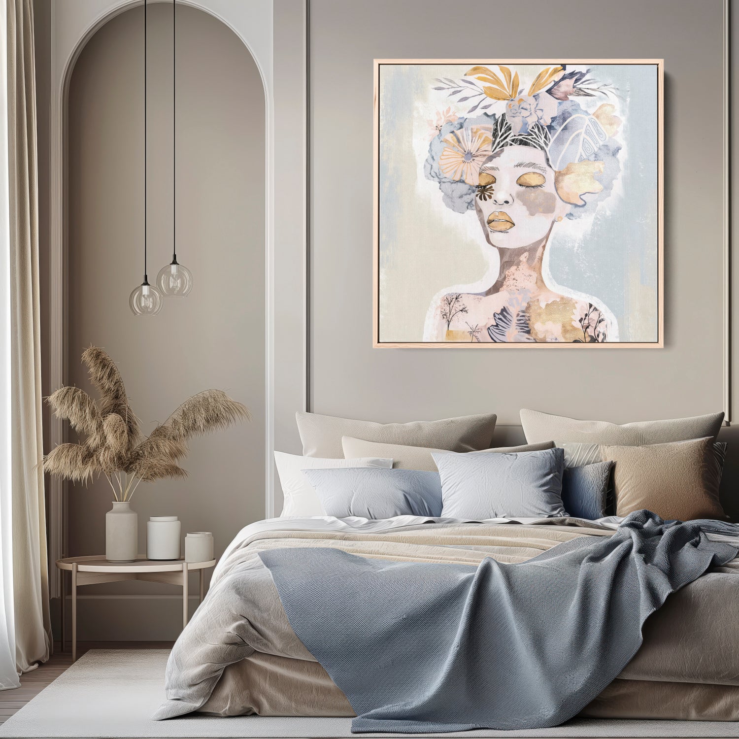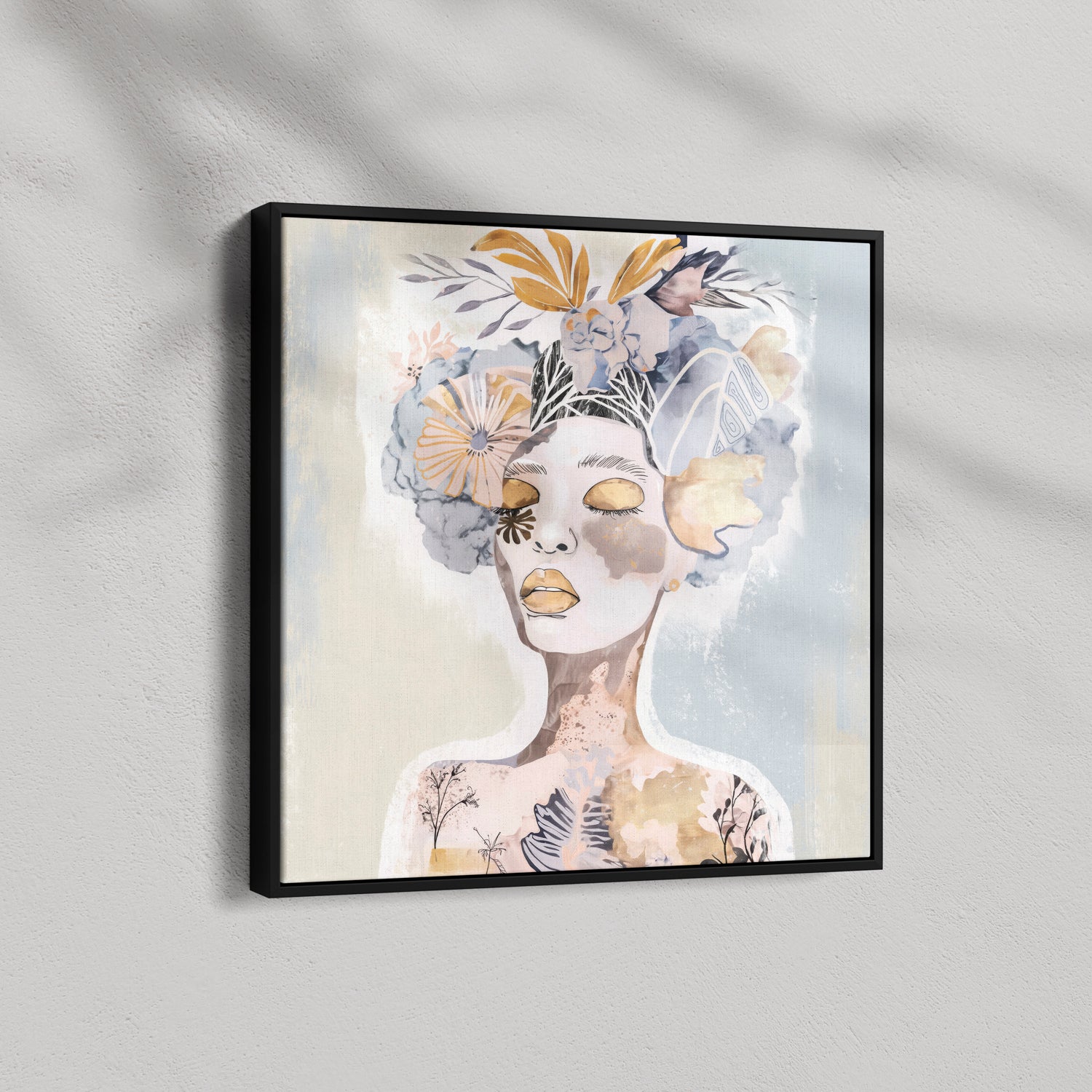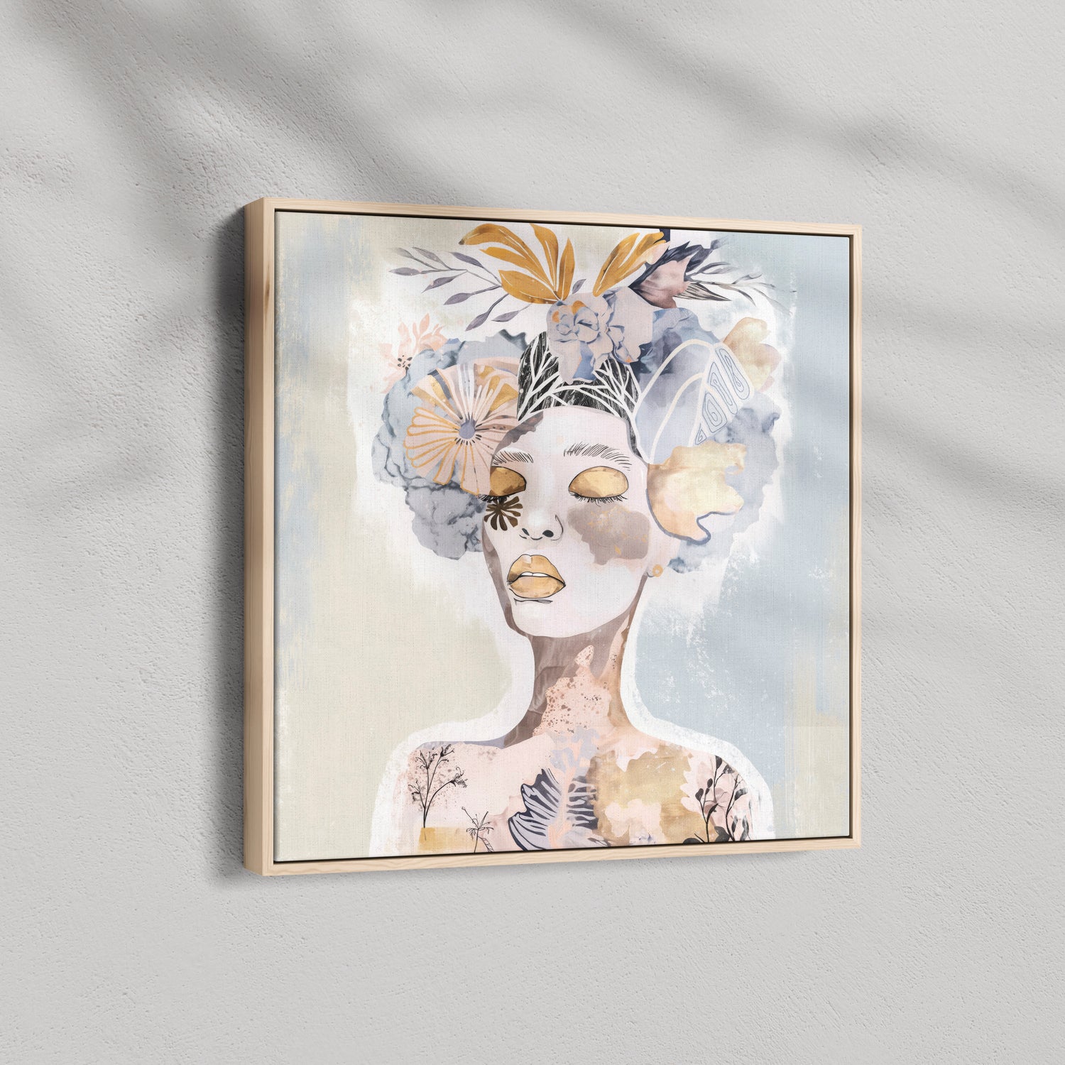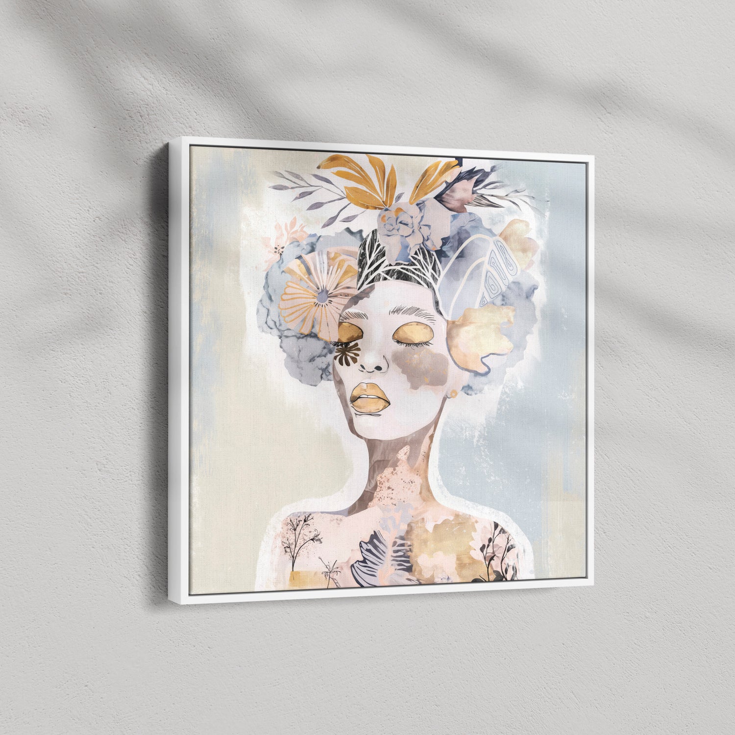 With golden lids closed and a crown of oversized blooms, she looks like she just stepped out of a dream. Splashes of pastel blue and sage, buttery gold, and whimsical florals turn her into a statement that feels both artful and a little cheeky.