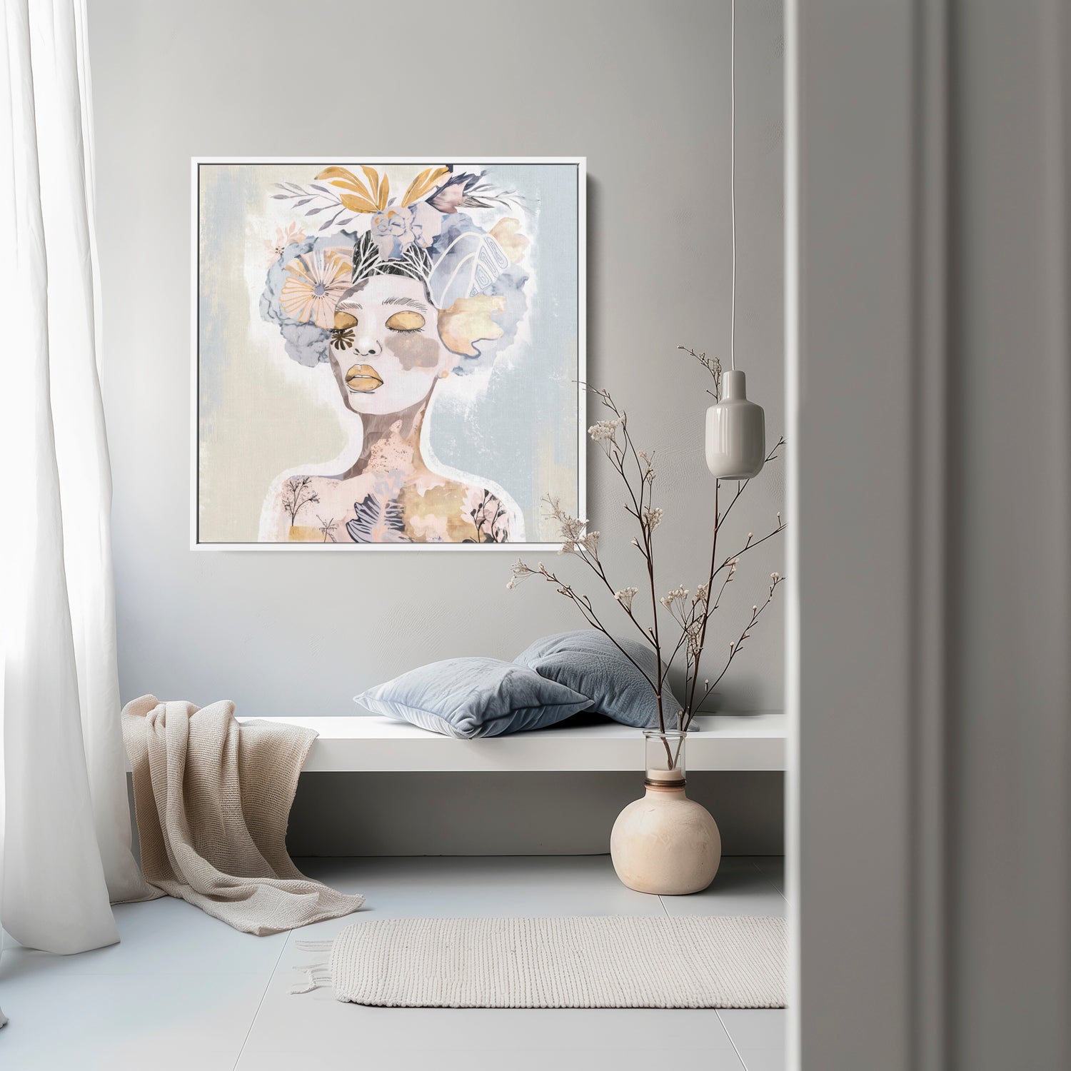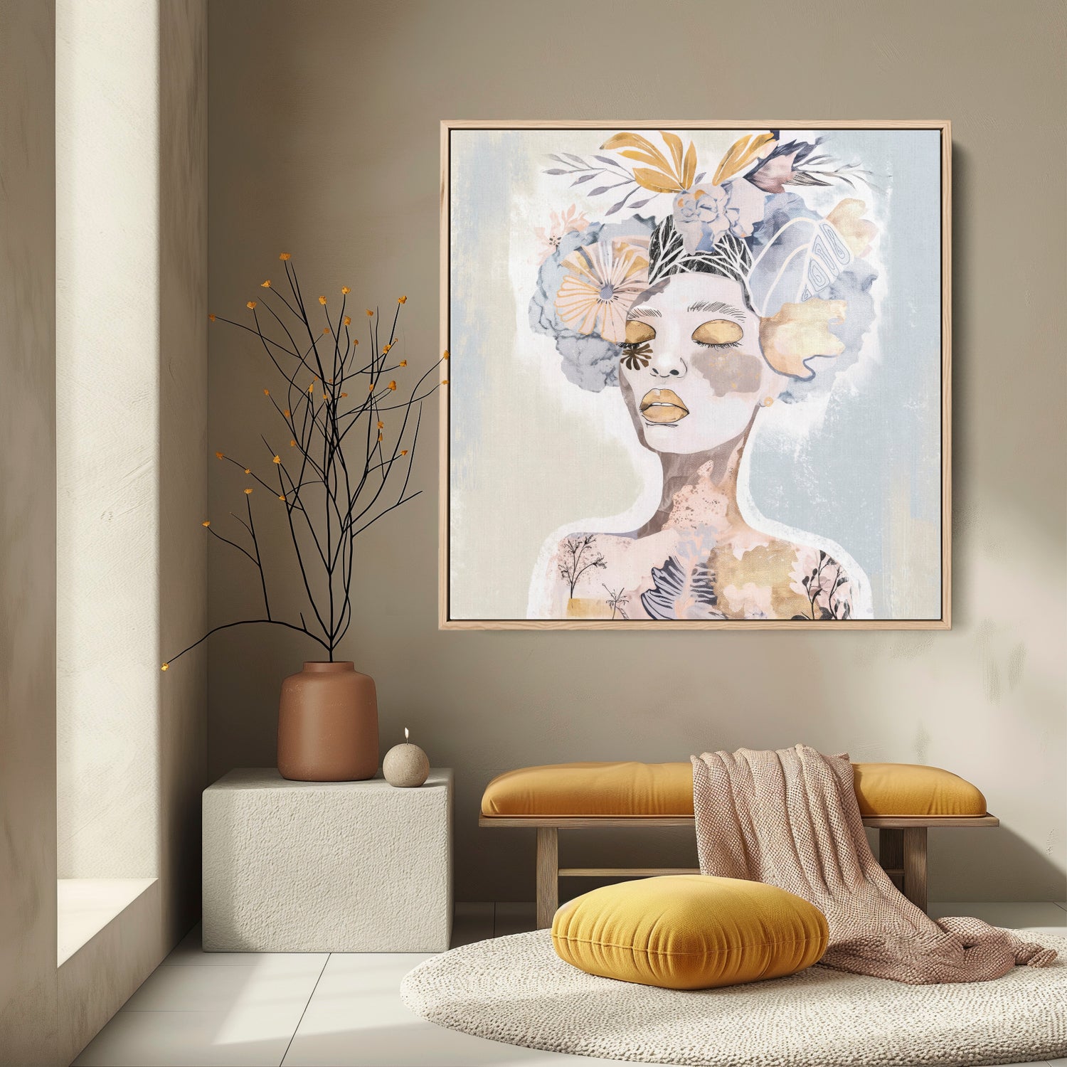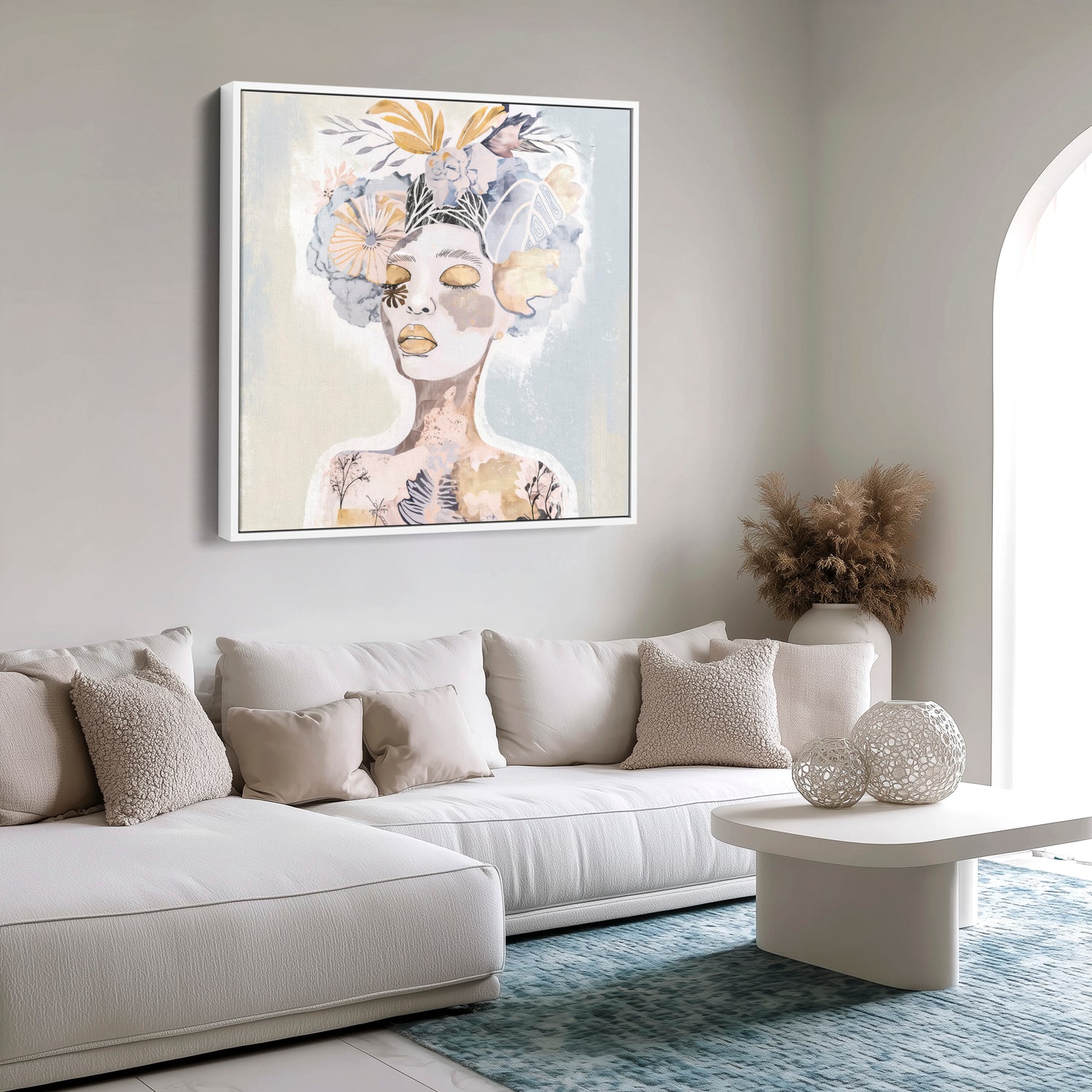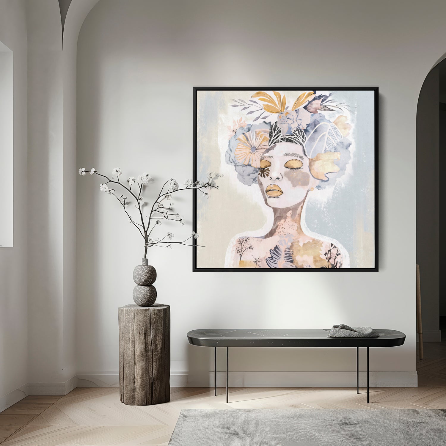 With golden lids closed and a crown of oversized blooms, she looks like she just stepped out of a dream. Splashes of pastel blue and sage, buttery gold, and whimsical florals turn her into a statement that feels both artful and a little cheeky.