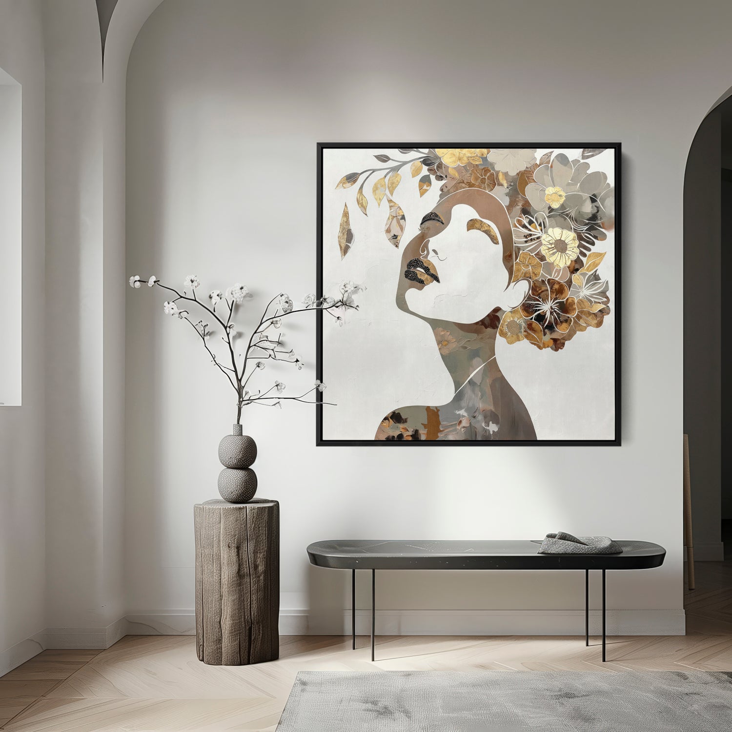 Head lifted, crowned in blooms, she carries her story with quiet pride. Gold and earth tones trace the rhythm of heritage, while flowers bloom like memories passed down.