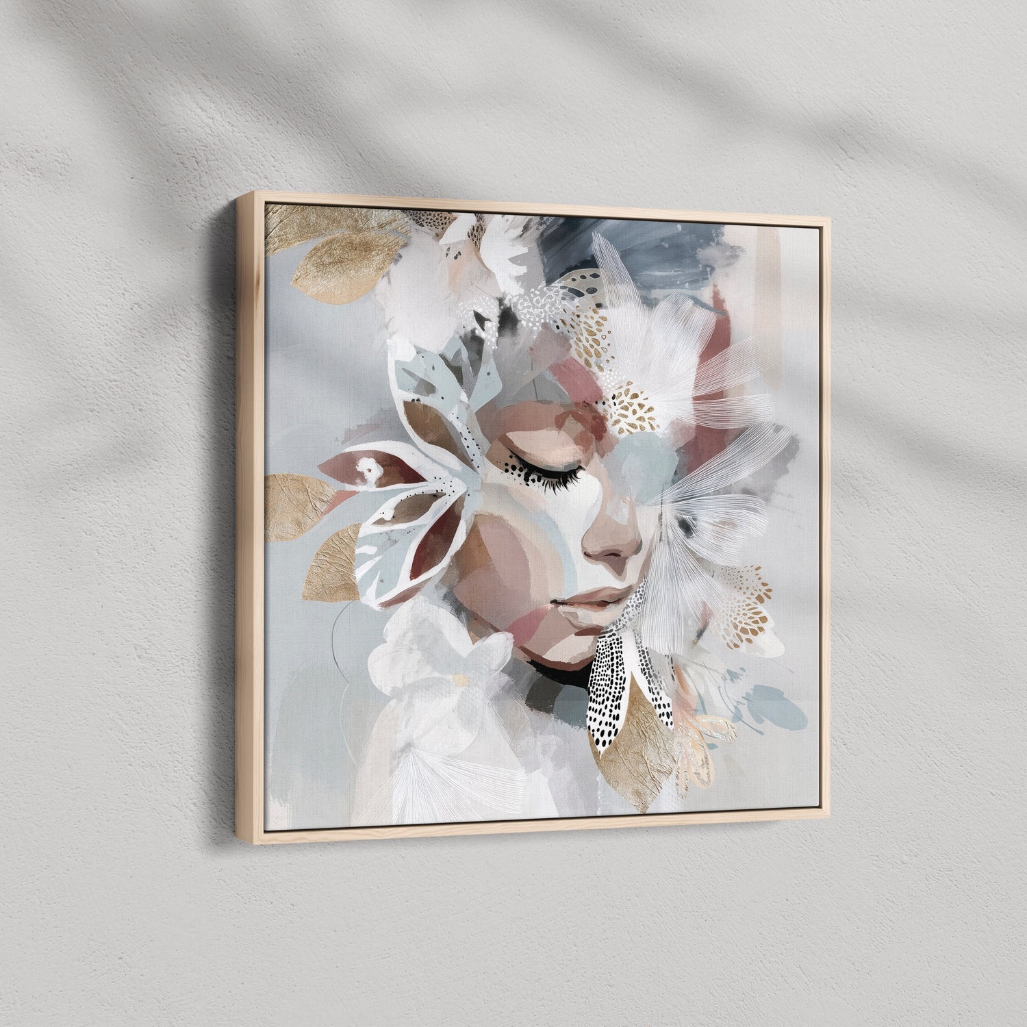 She rests in a quiet dream, wrapped in soft petals and delicate feathers that drift across. Pale tones of ivory, blush, and gold shimmer like a whispering lullaby, carrying both fragility and strength.