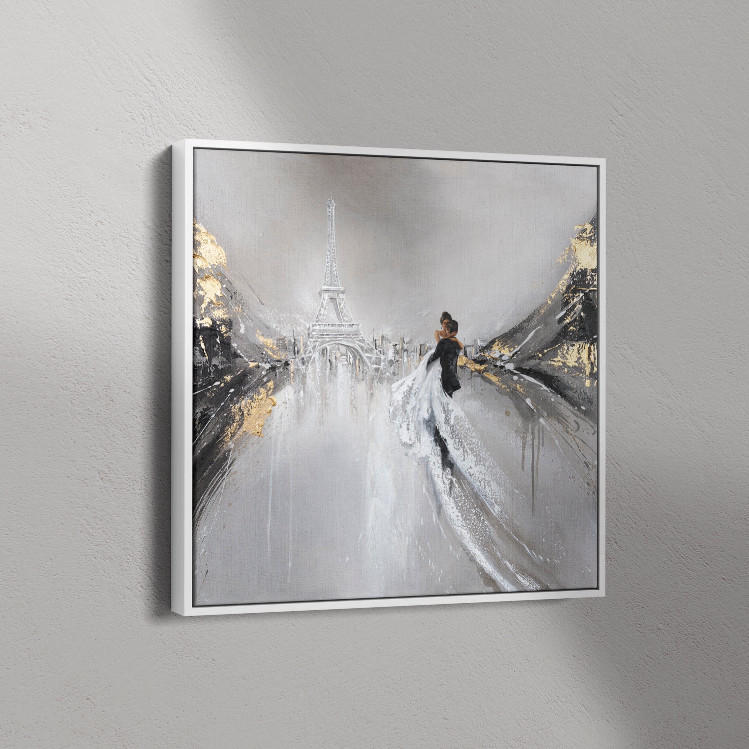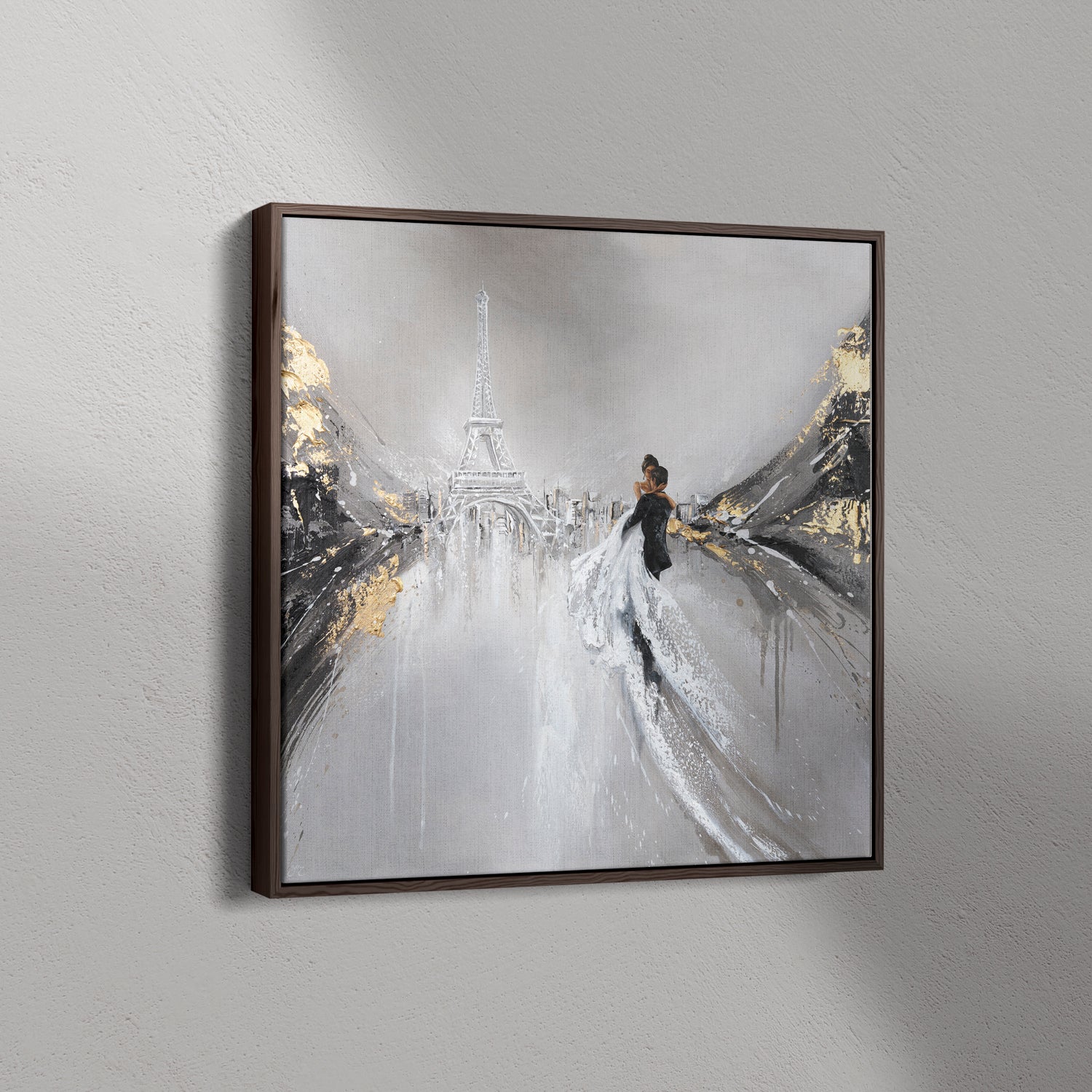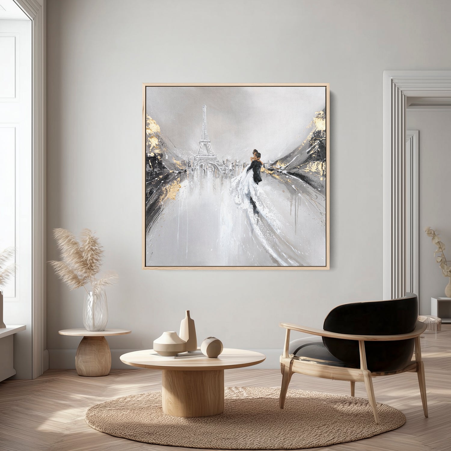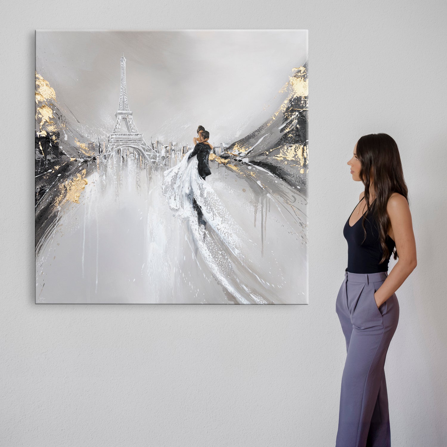 A timeless embrace beneath the Parisian skyline. Fluid brushstrokes and gilded accents capture the passion of a couple lost in their own world, as the Eiffel Tower stands in elegant witness. This piece speaks to enduring love which is bold, graceful, and forever in motion.