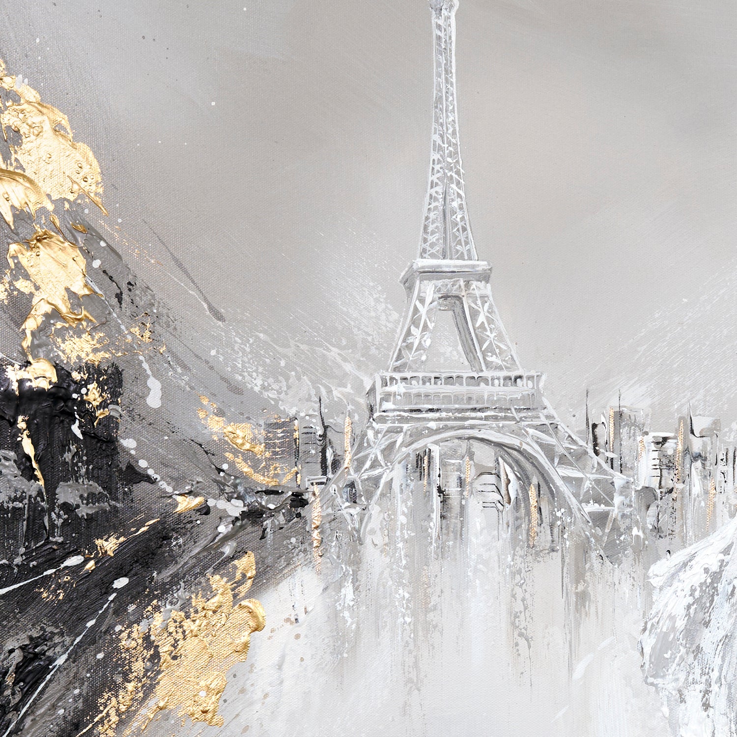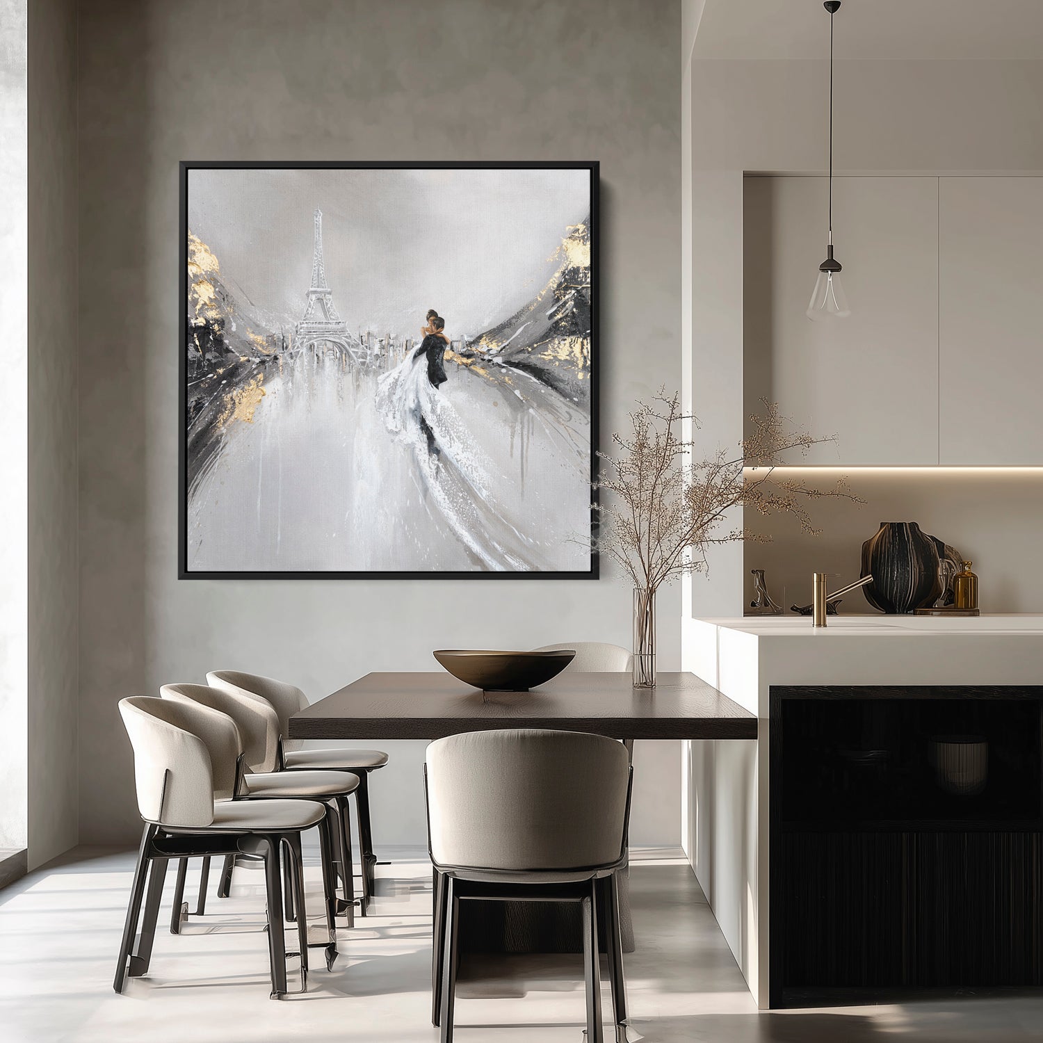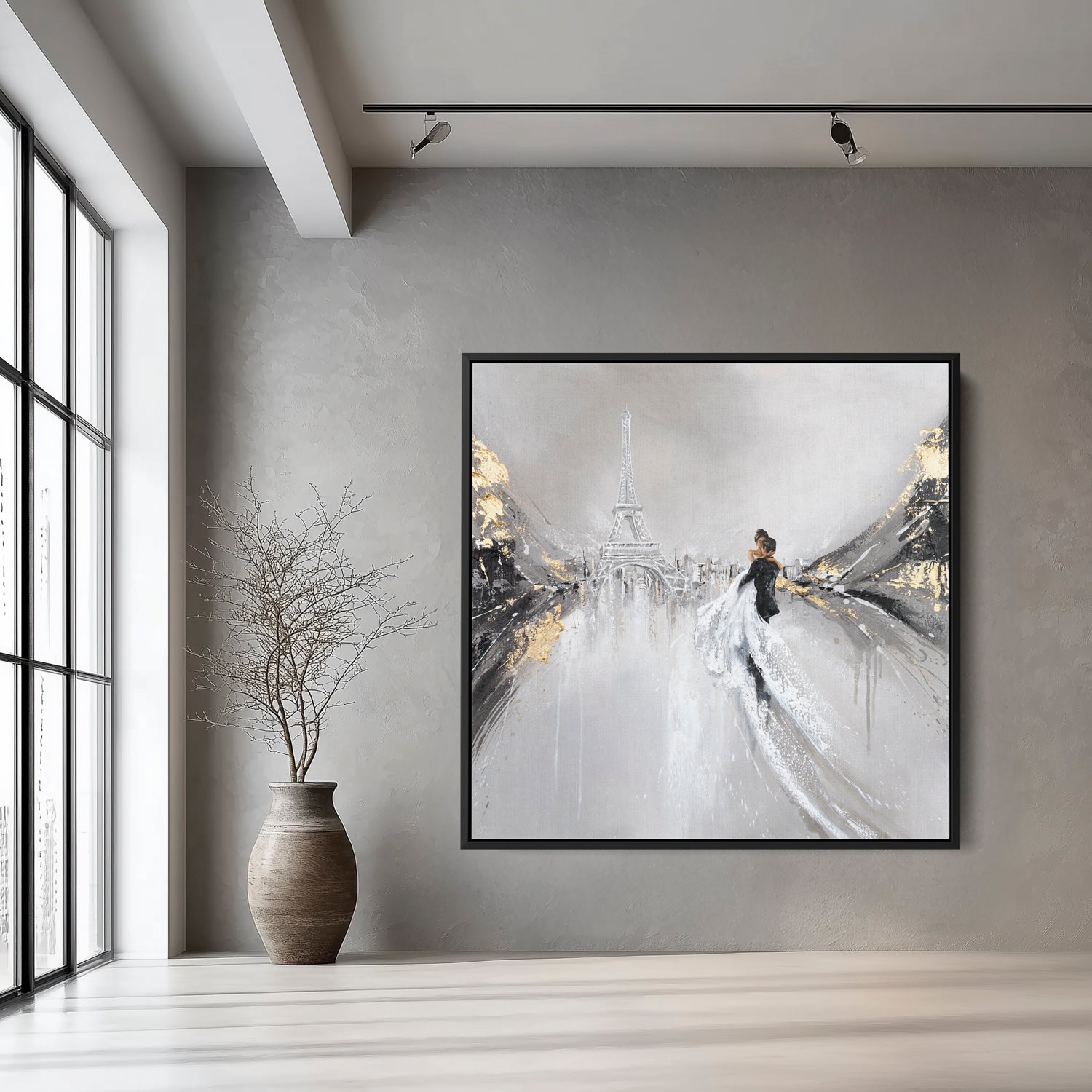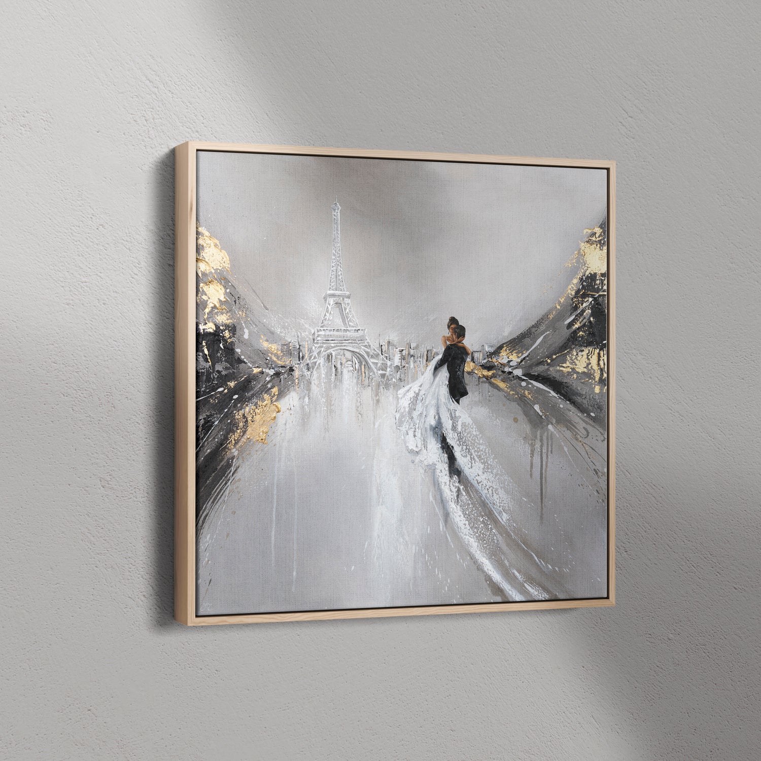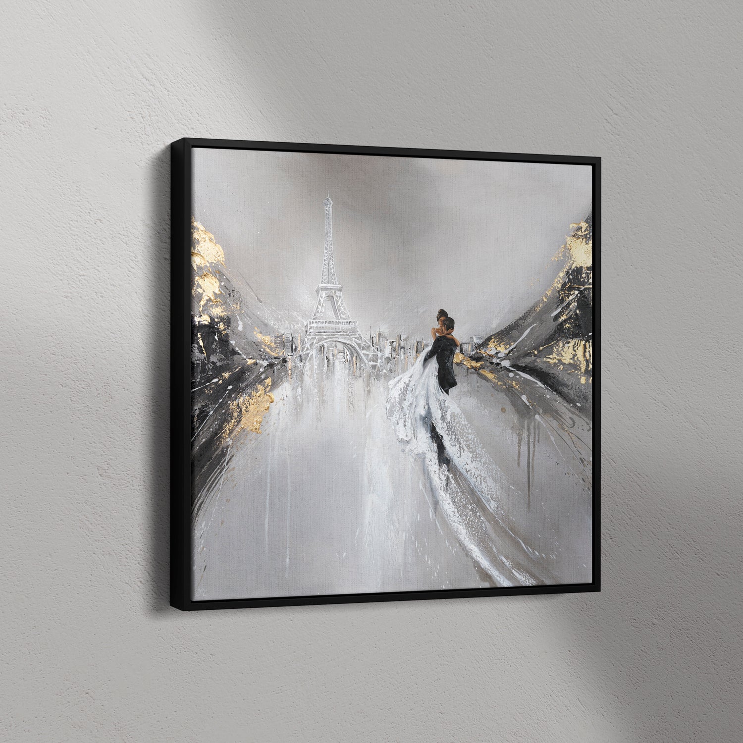 A timeless embrace beneath the Parisian skyline. Fluid brushstrokes and gilded accents capture the passion of a couple lost in their own world, as the Eiffel Tower stands in elegant witness. This piece speaks to enduring love which is bold, graceful, and forever in motion.