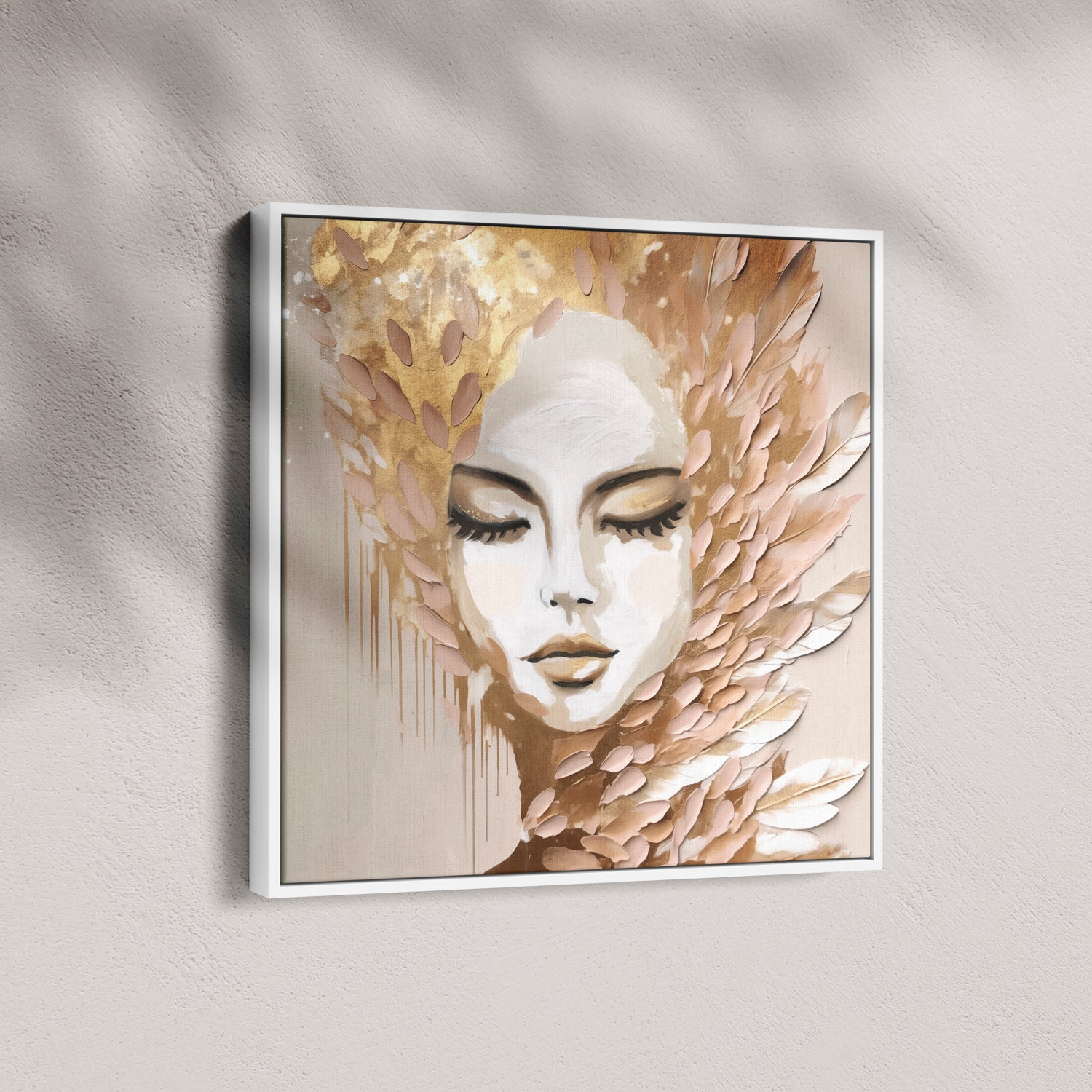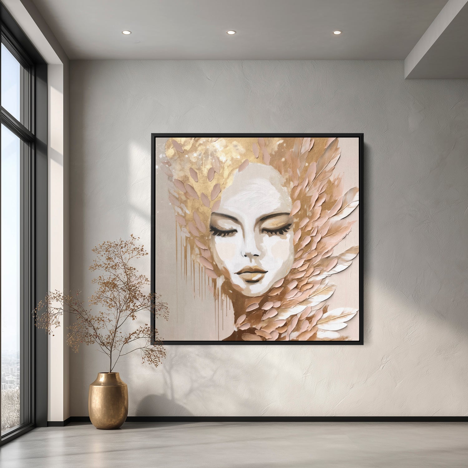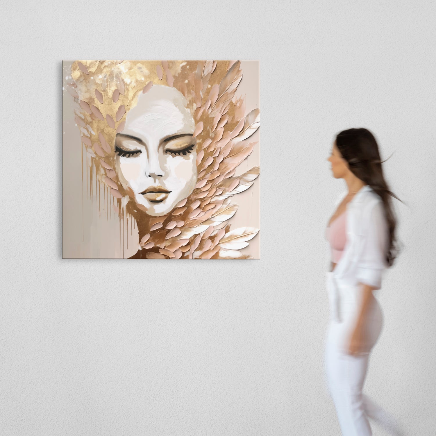 Halo is a luminous portrait that radiates calm, strength, and quiet power. Her sculpted feathers and softened gold tones evoke lightness, divinity, and the stillness of grace.