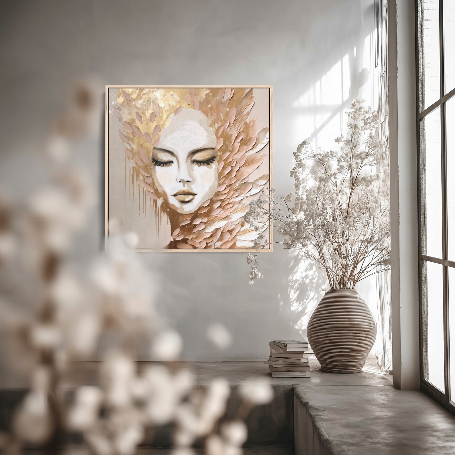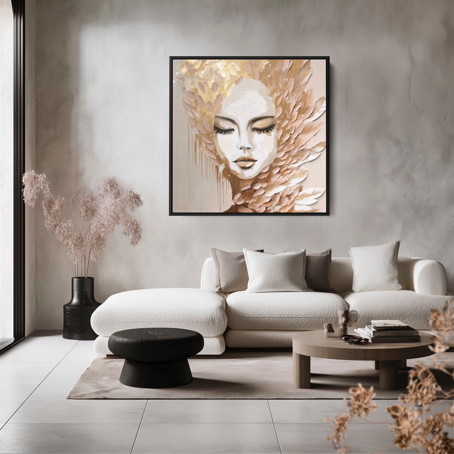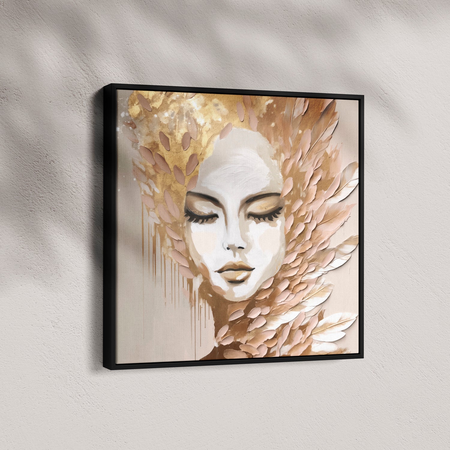 Halo is a luminous portrait that radiates calm, strength, and quiet power. Her sculpted feathers and softened gold tones evoke lightness, divinity, and the stillness of grace.