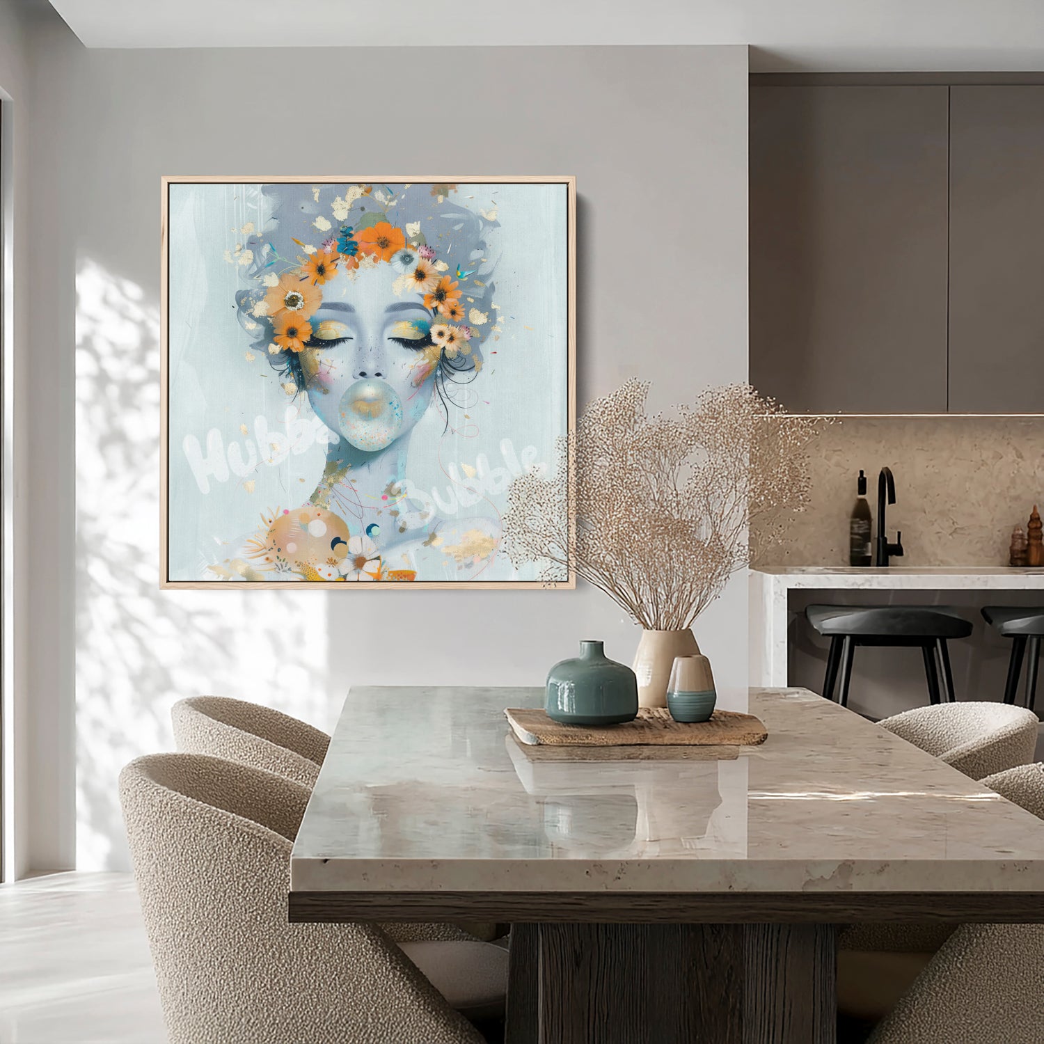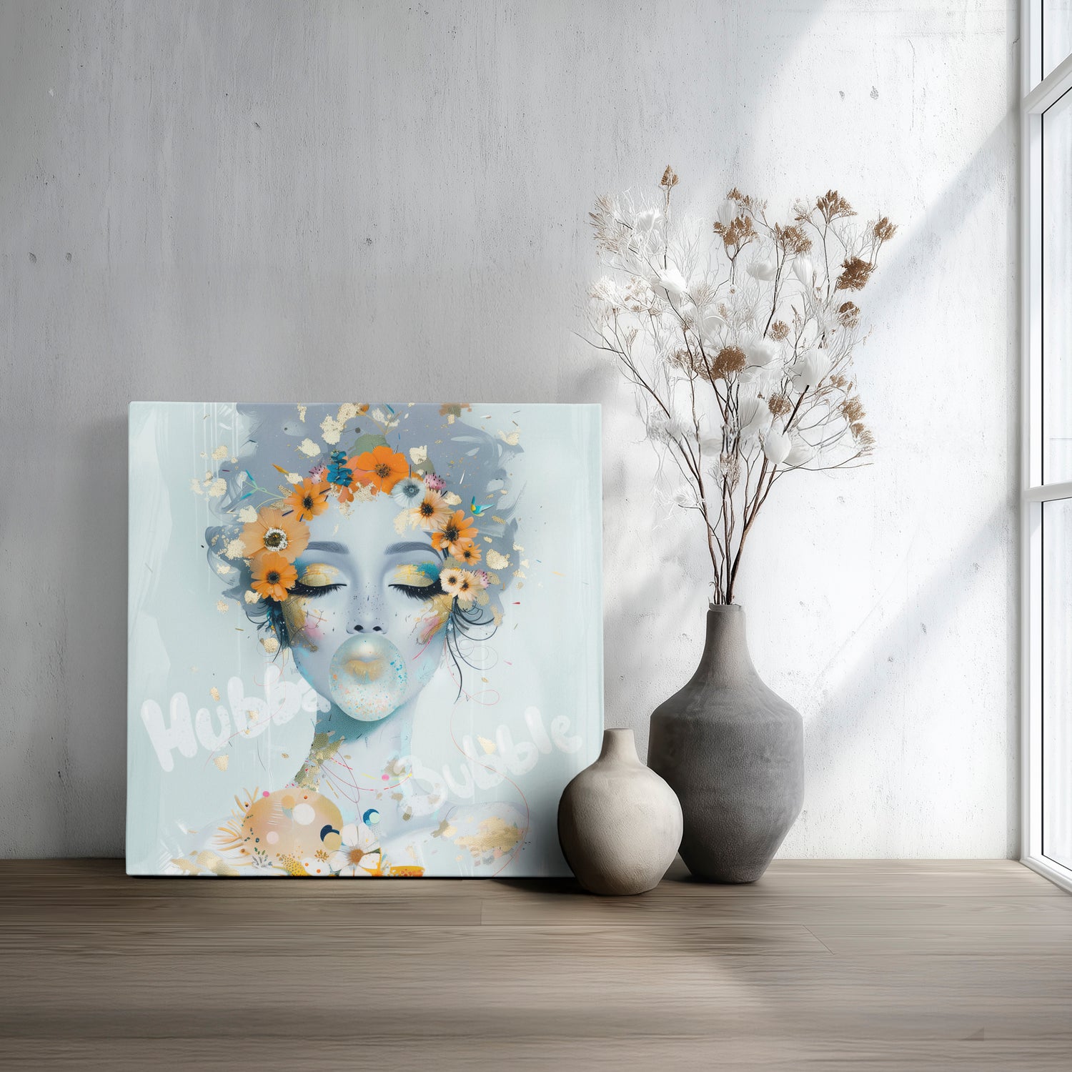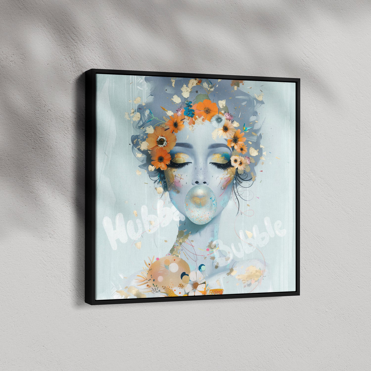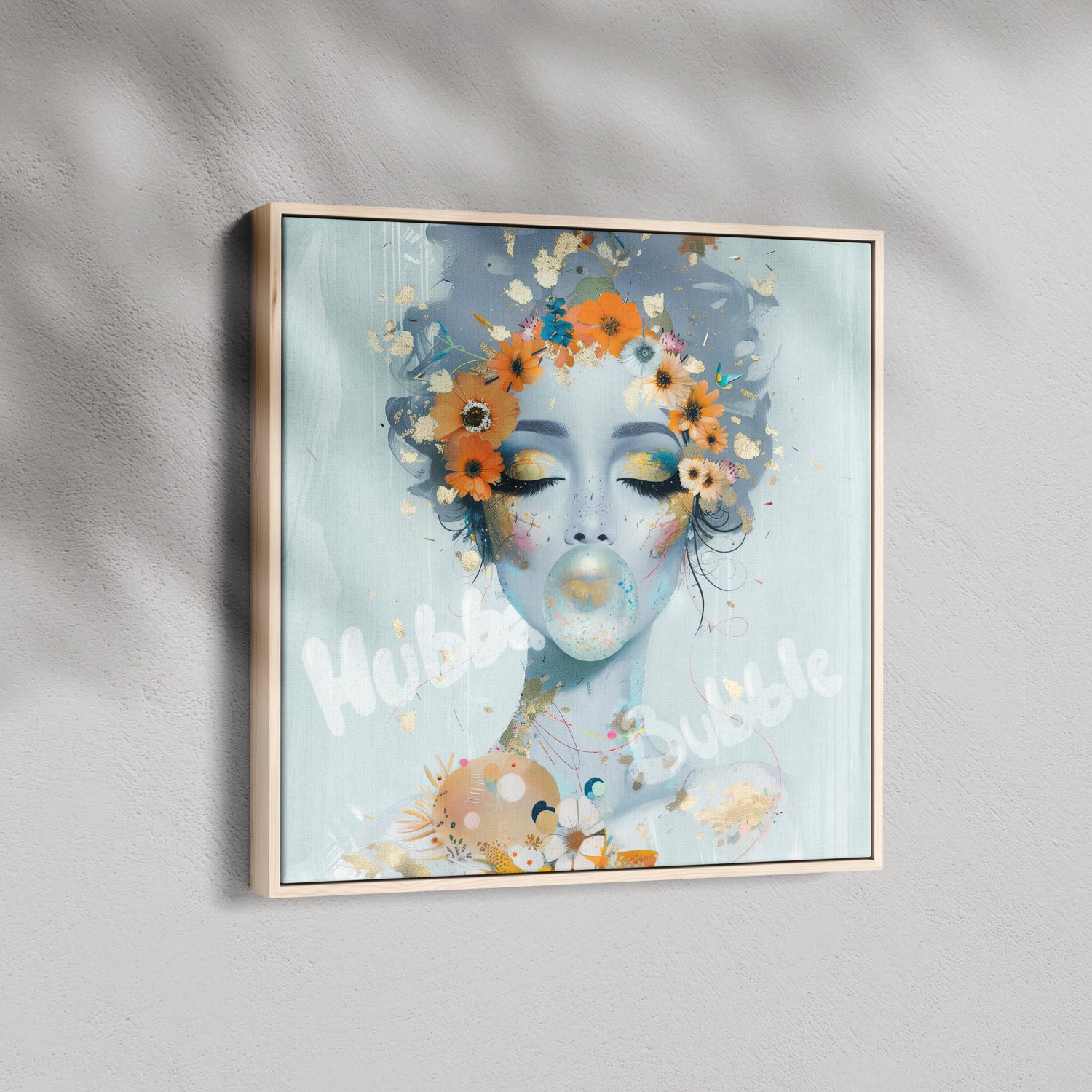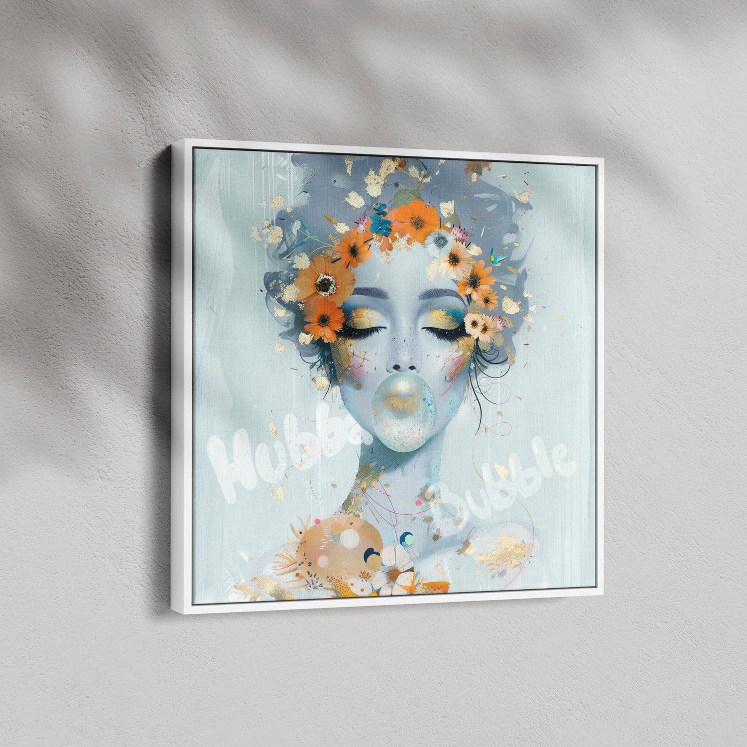 Hubba Bubble is a whimsical burst of colour and nostalgia. A playful explosion of colour and cheeky charm. Her dreamy gaze and bubblegum pop capture the joy of light-hearted rebellion, wrapped in florals, gold flecks, and unfiltered fun.