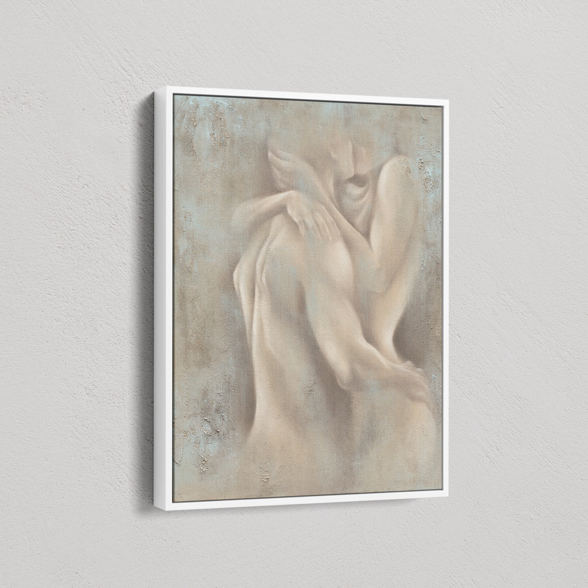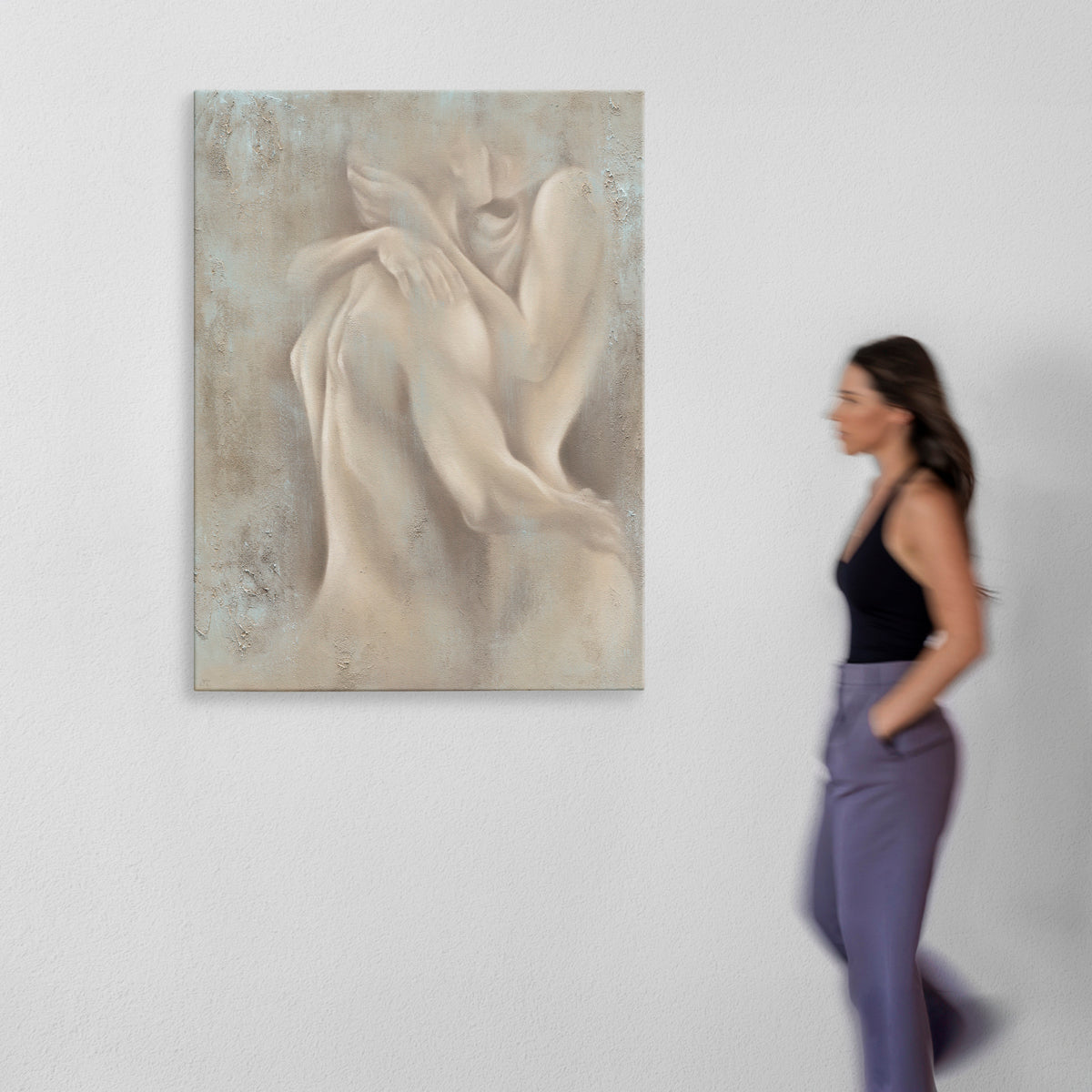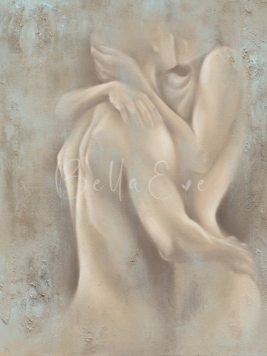 A quiet spark. A shared breath. Ignite captures a moment of closeness.. where bodies speak without words and boundaries dissolve into soft shadows. This piece doesn’t shout passion, it whispers it. Painted in earthy tones with diffused edges, it brings a sense of connection that’s raw yet refined.