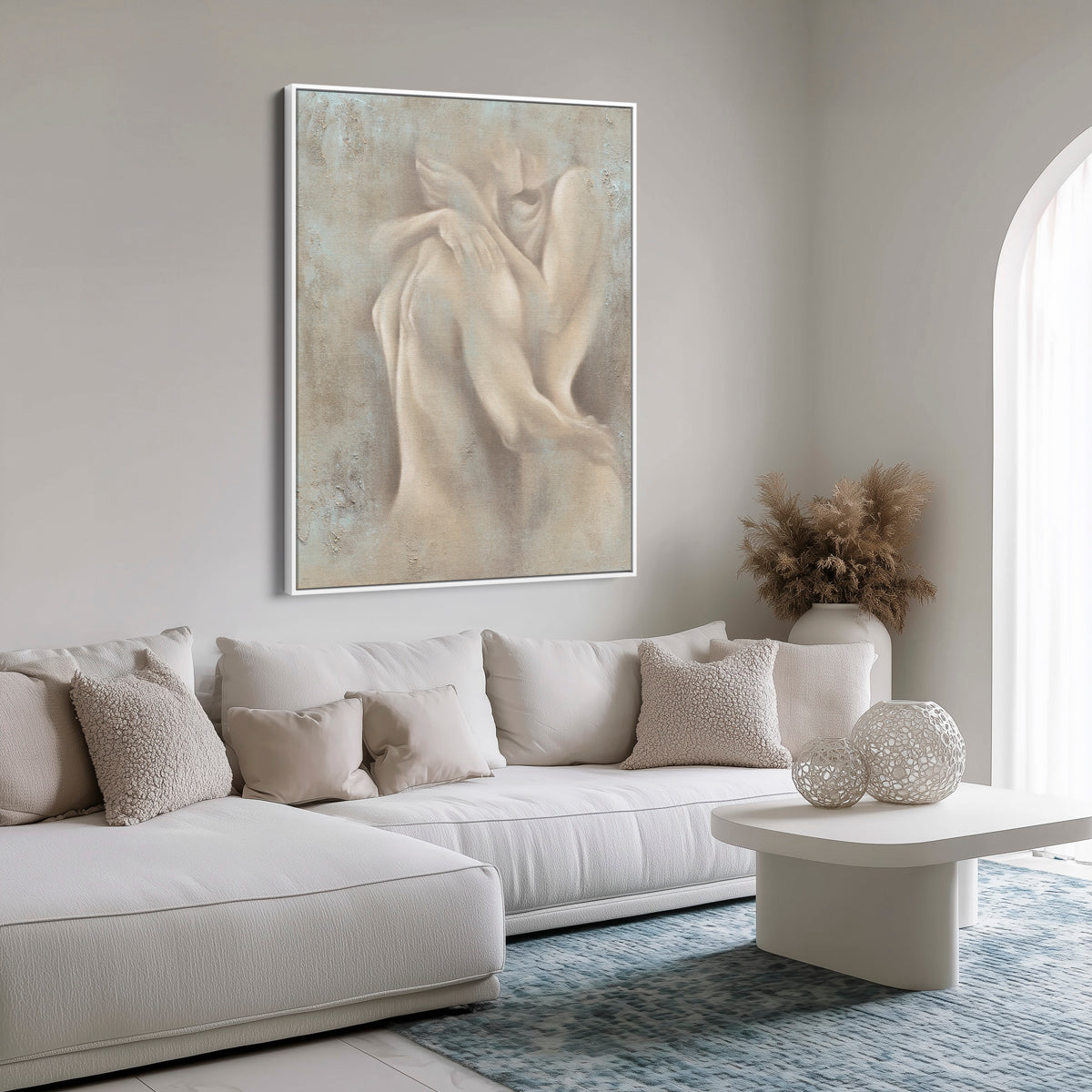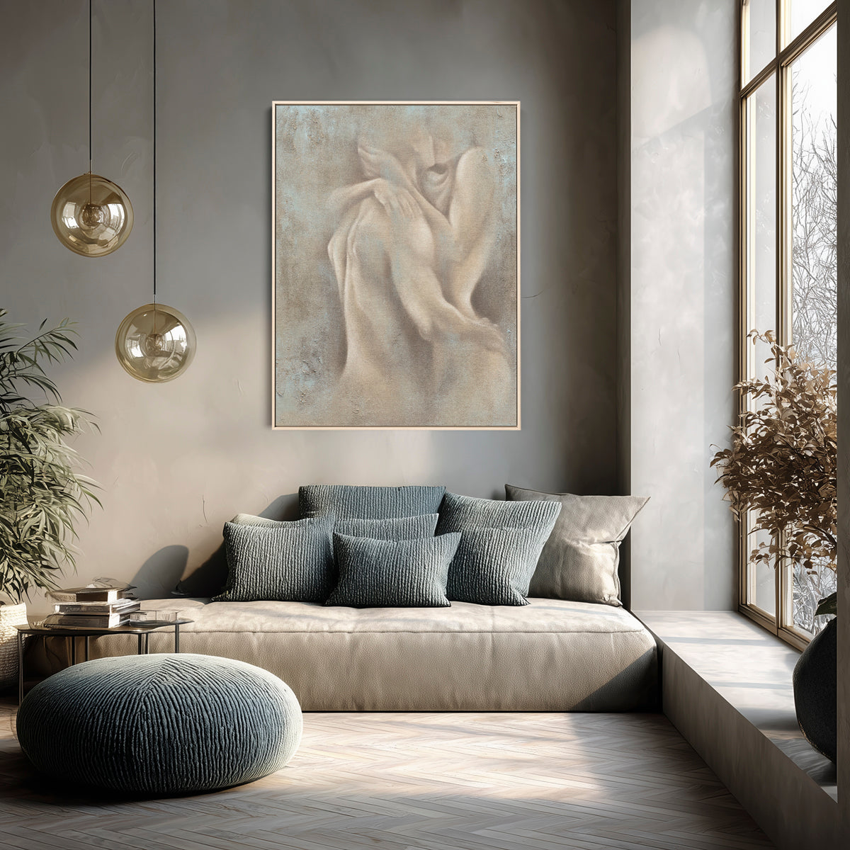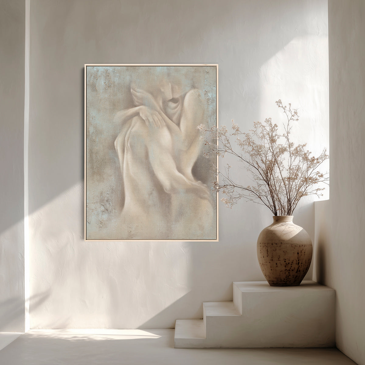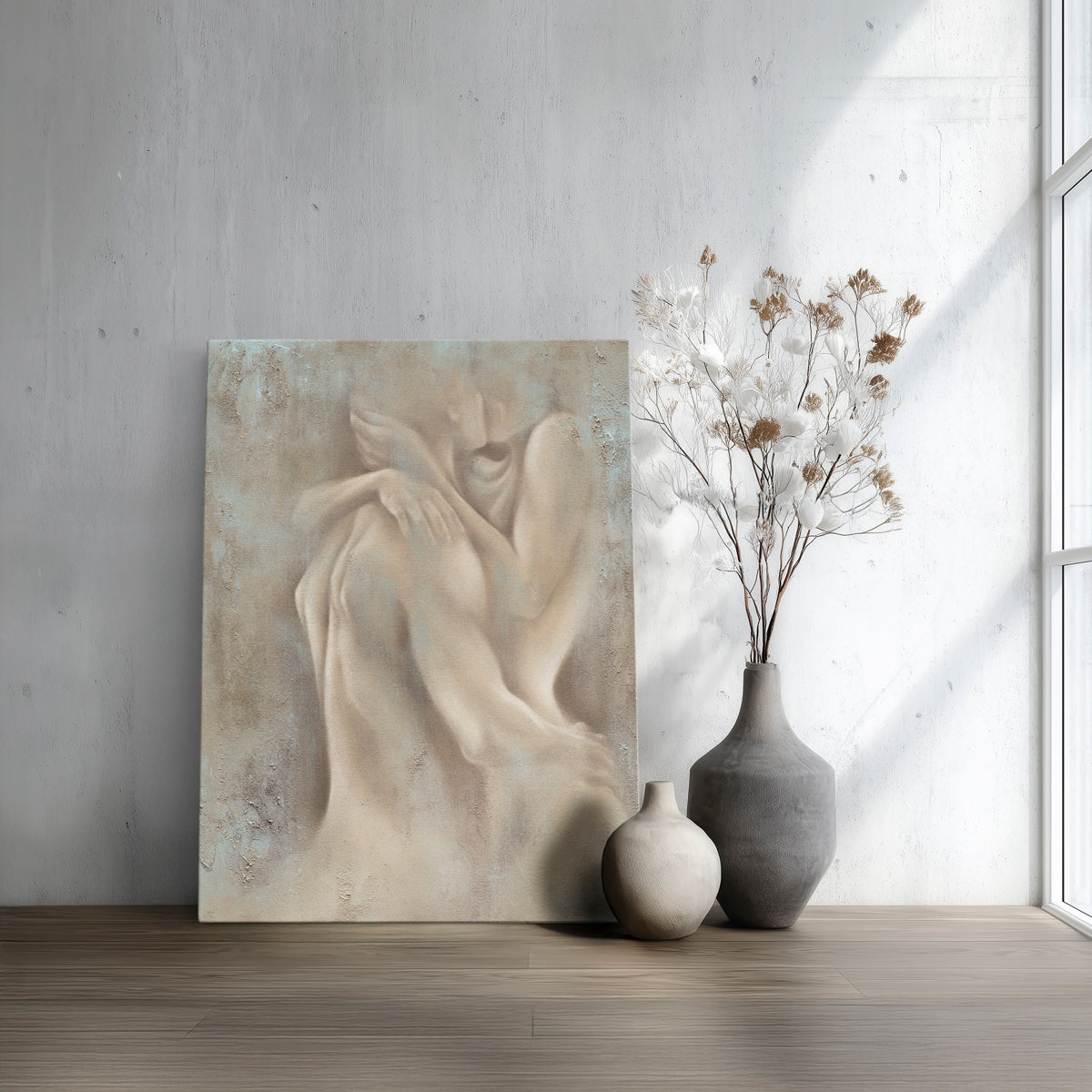 A quiet spark. A shared breath. Ignite captures a moment of closeness.. where bodies speak without words and boundaries dissolve into soft shadows. This piece doesn’t shout passion, it whispers it. Painted in earthy tones with diffused edges, it brings a sense of connection that’s raw yet refined.