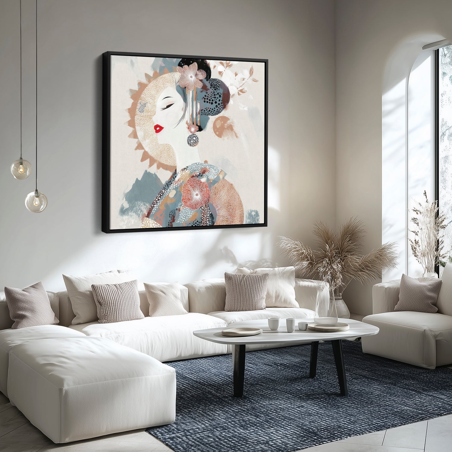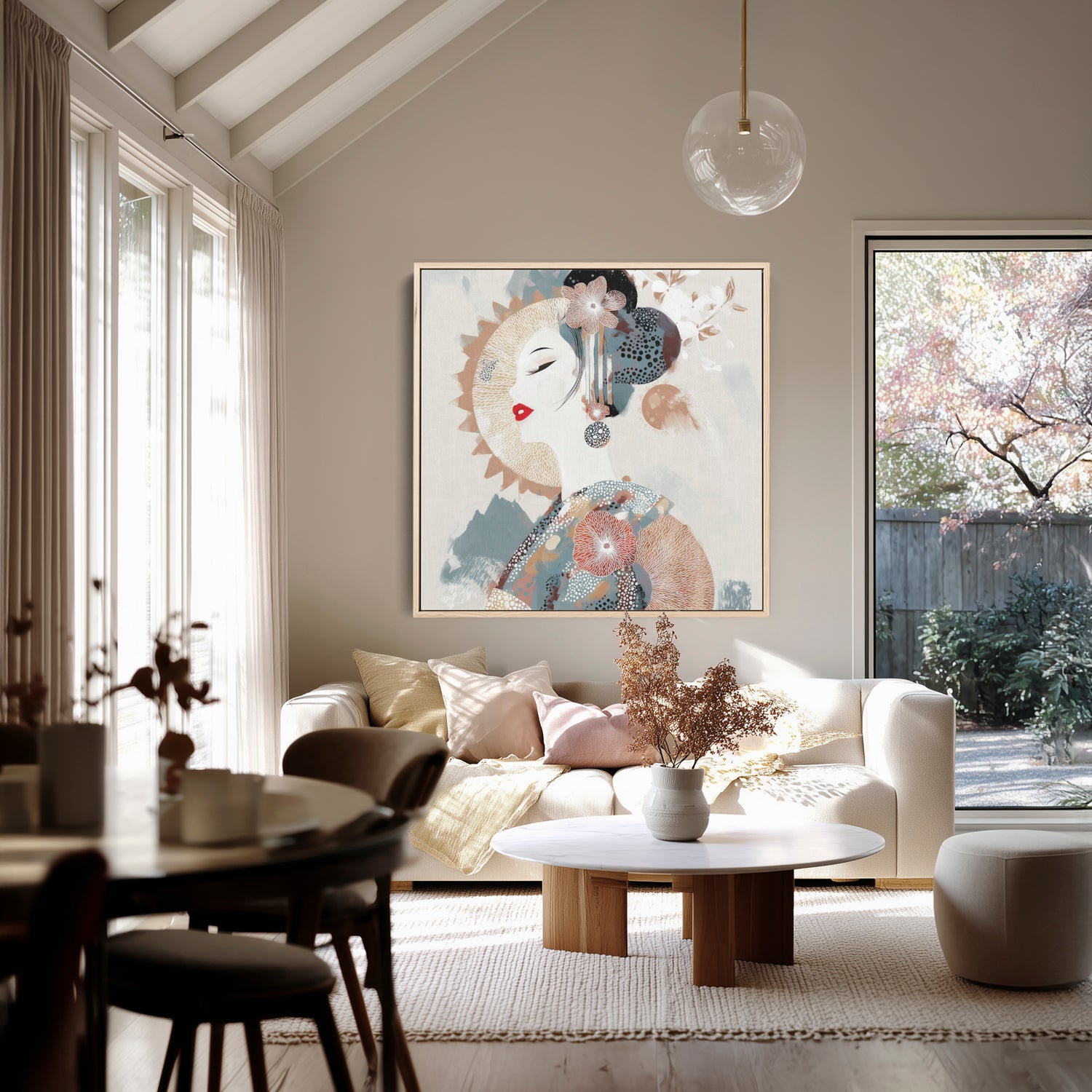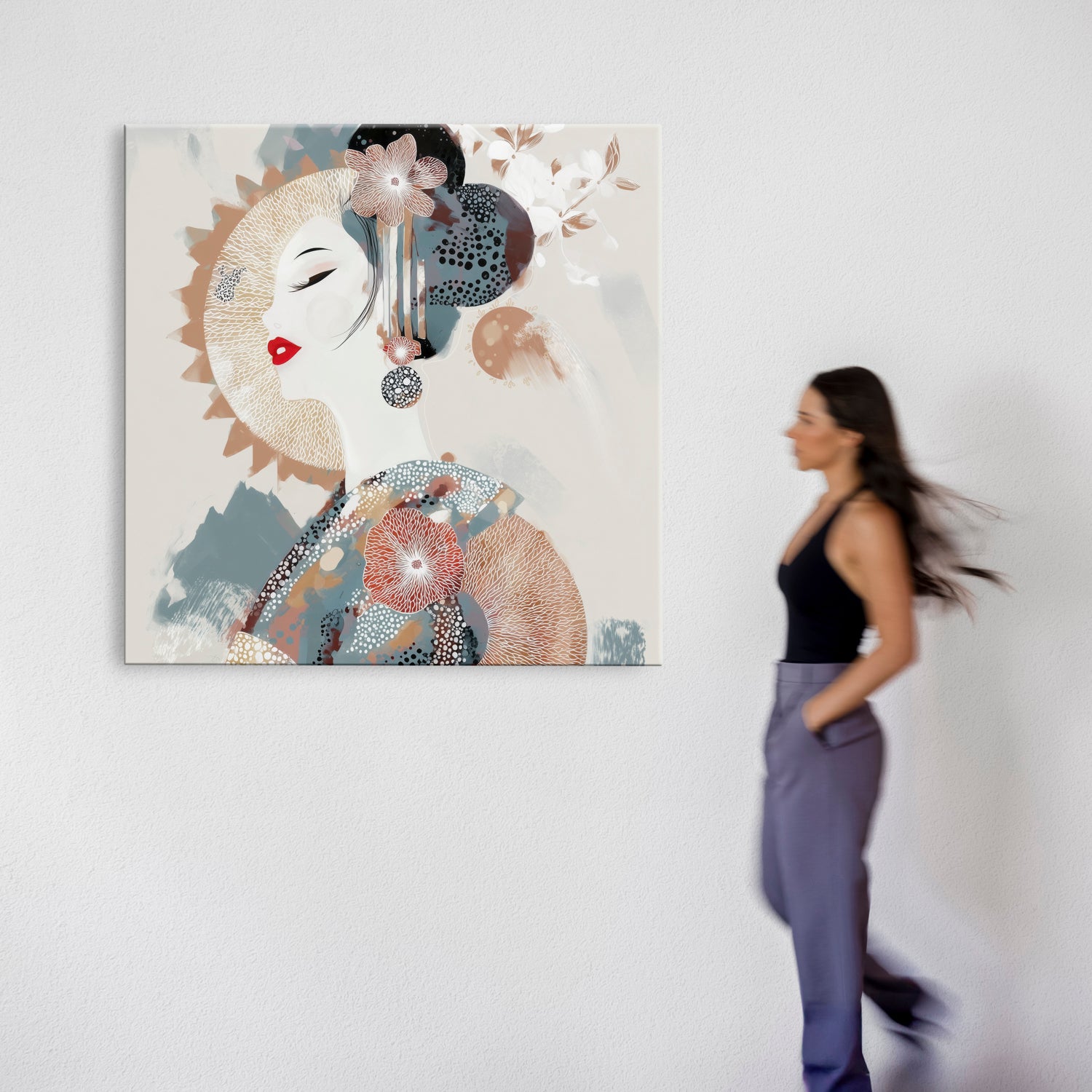 From her vivid red lips to the intricate folds of her kimono, every detail radiates grace and refinement. A striking choice for refined spaces that honour both heritage and modernity.
