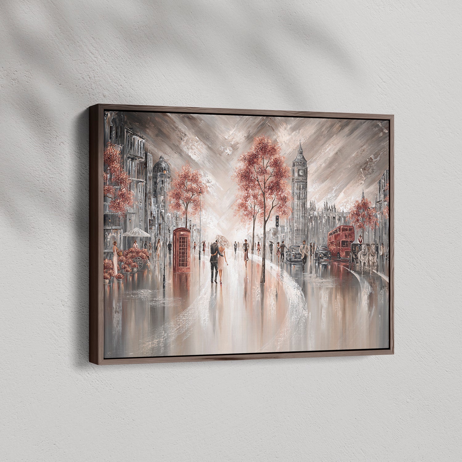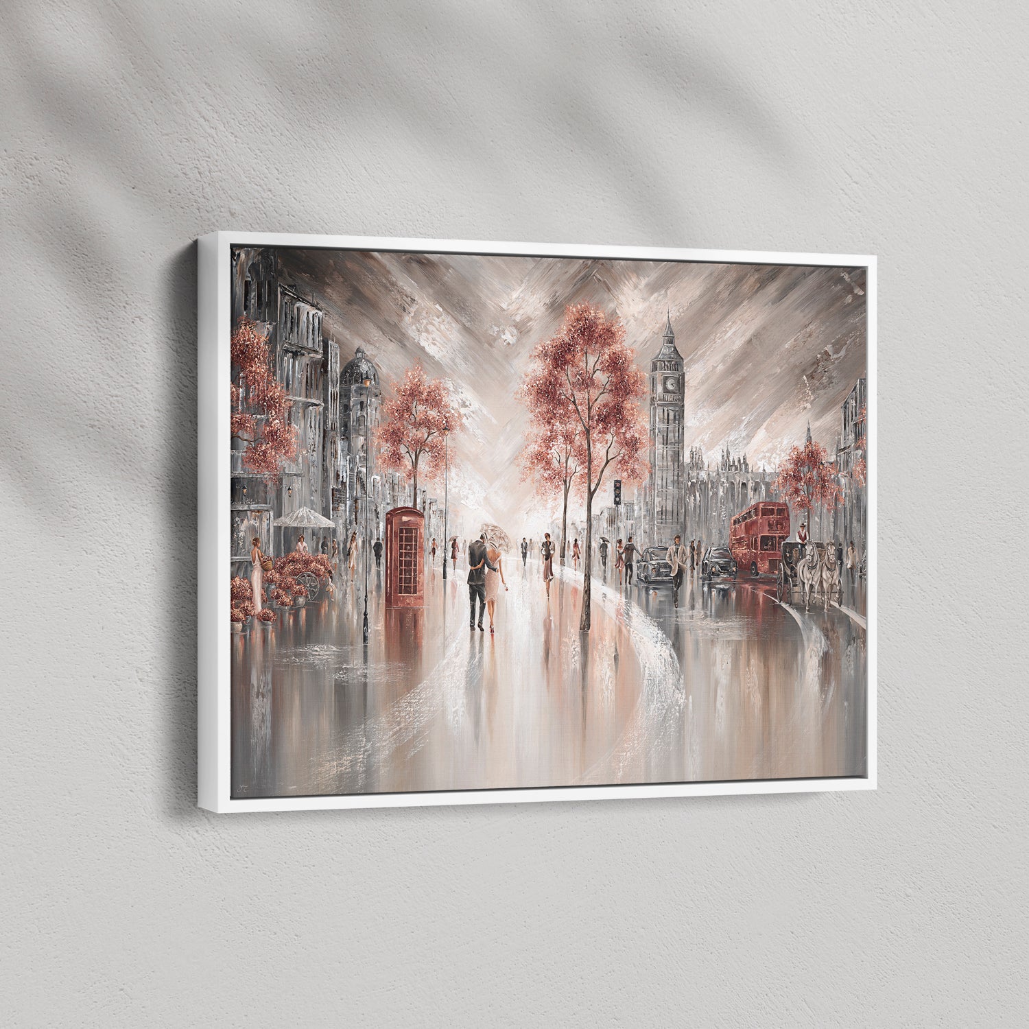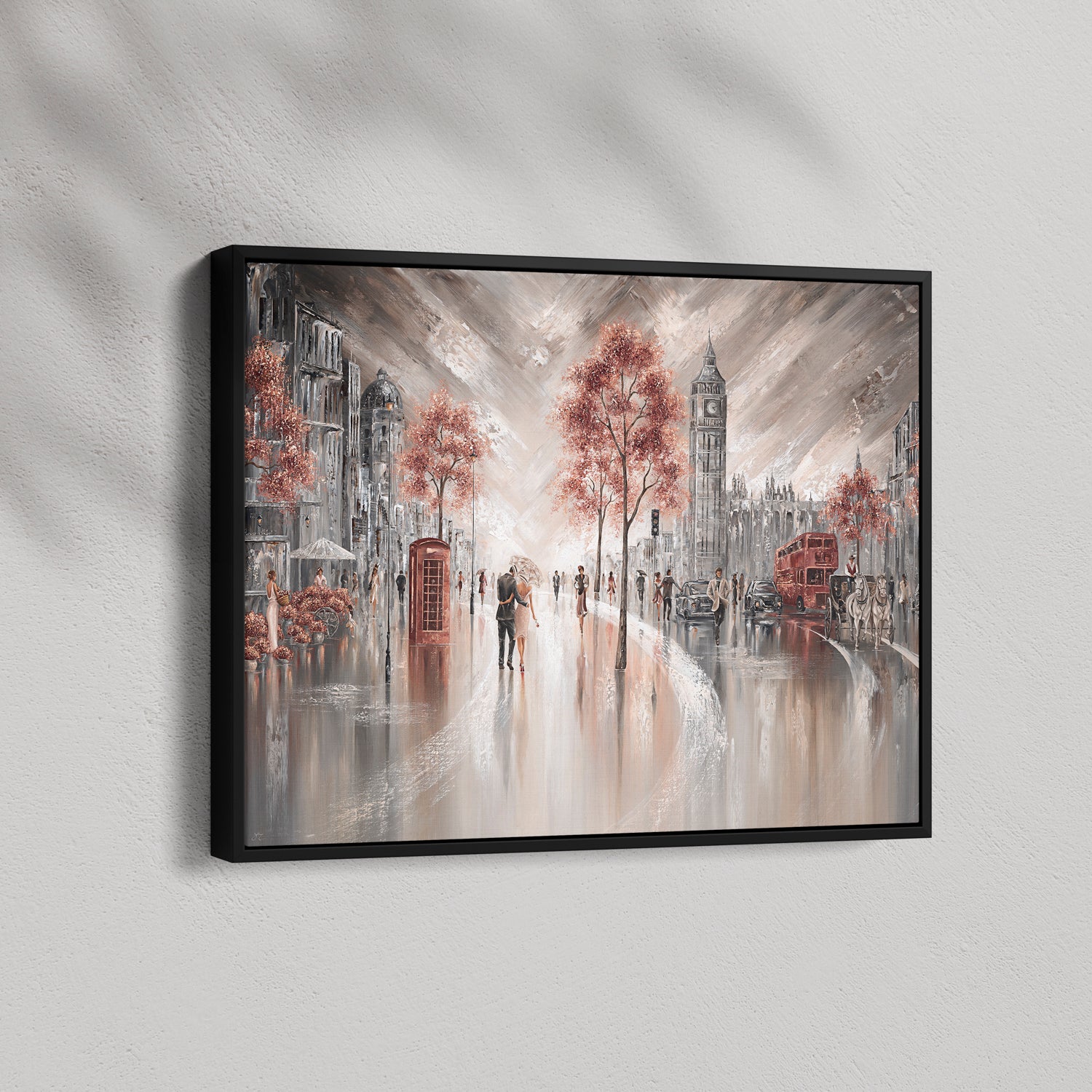 A quiet moment under one umbrella, right in the heart of London. The sound of red buses, distant chatter, and the soft glow of city lights reflecting off the pavement, this piece captures that feeling of being wrapped up in your own little world while the city hums around you. For anyone who's ever wandered these streets hand in hand, or dreamed of doing so, this is your memory on canvas.