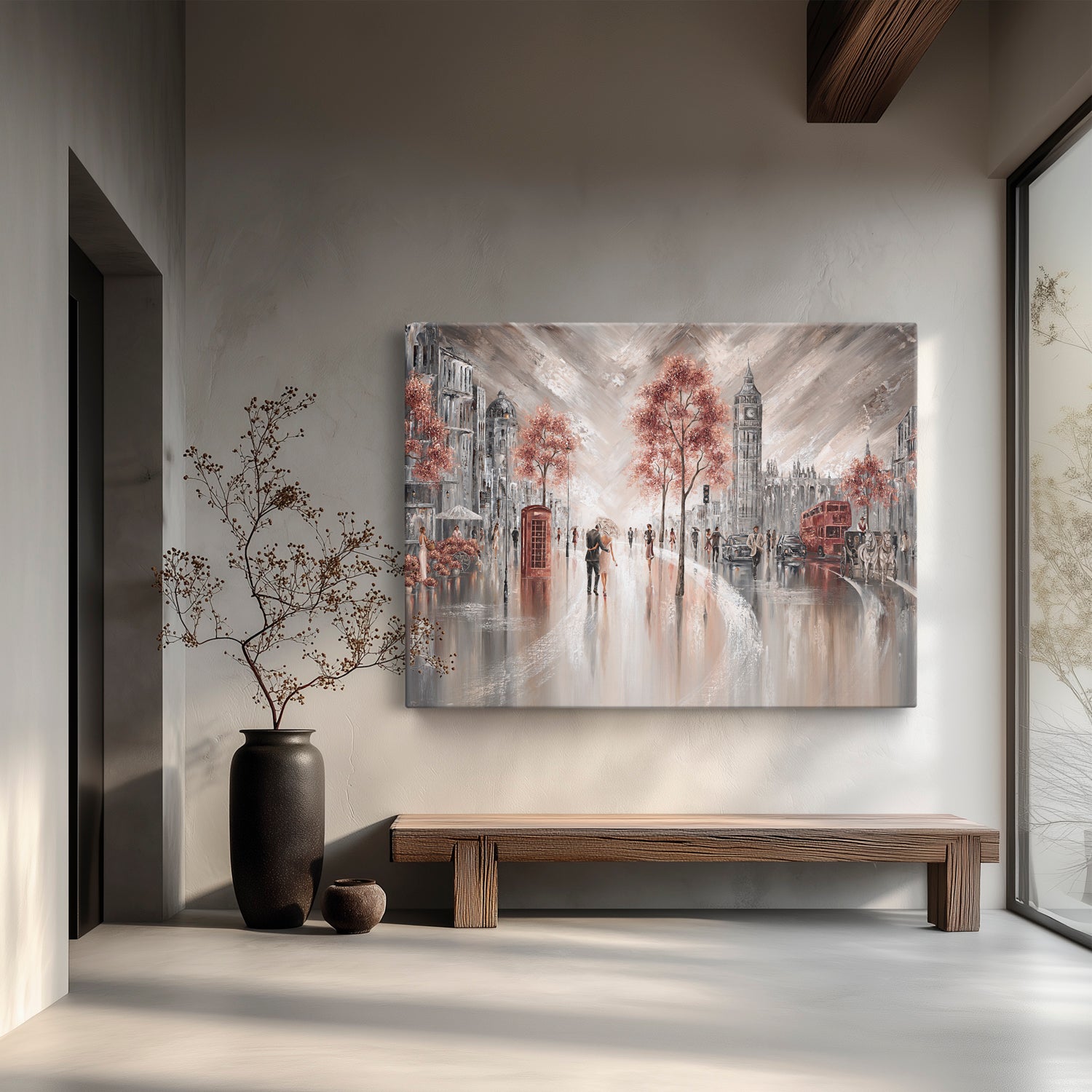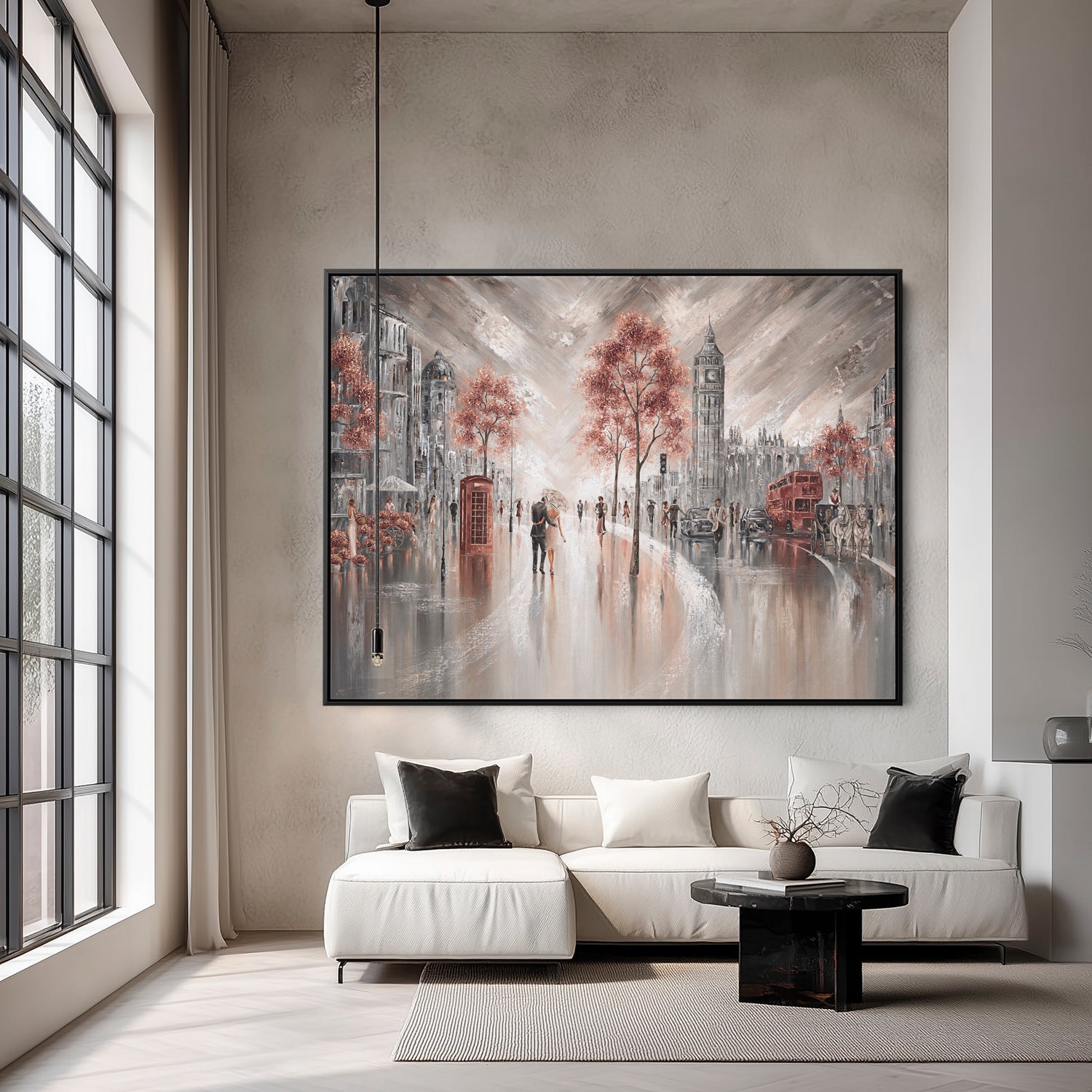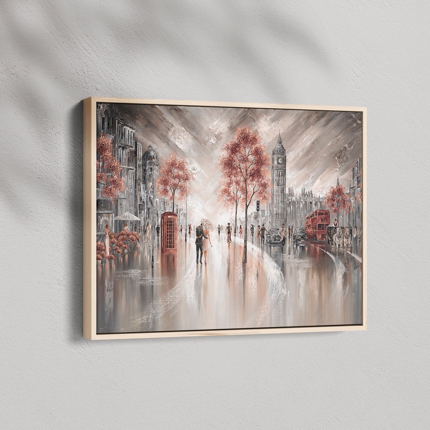 A quiet moment under one umbrella, right in the heart of London. The sound of red buses, distant chatter, and the soft glow of city lights reflecting off the pavement, this piece captures that feeling of being wrapped up in your own little world while the city hums around you. For anyone who's ever wandered these streets hand in hand, or dreamed of doing so, this is your memory on canvas.