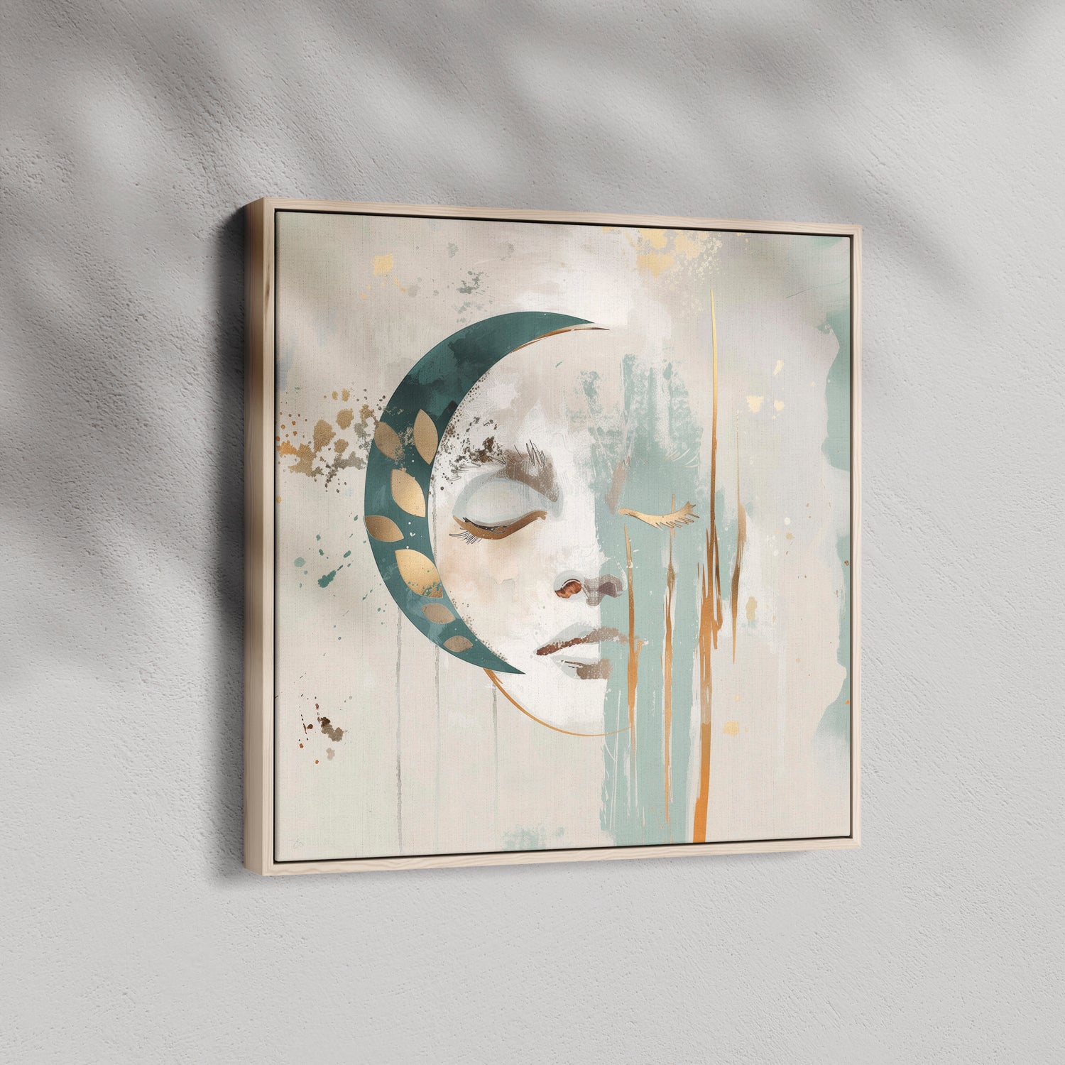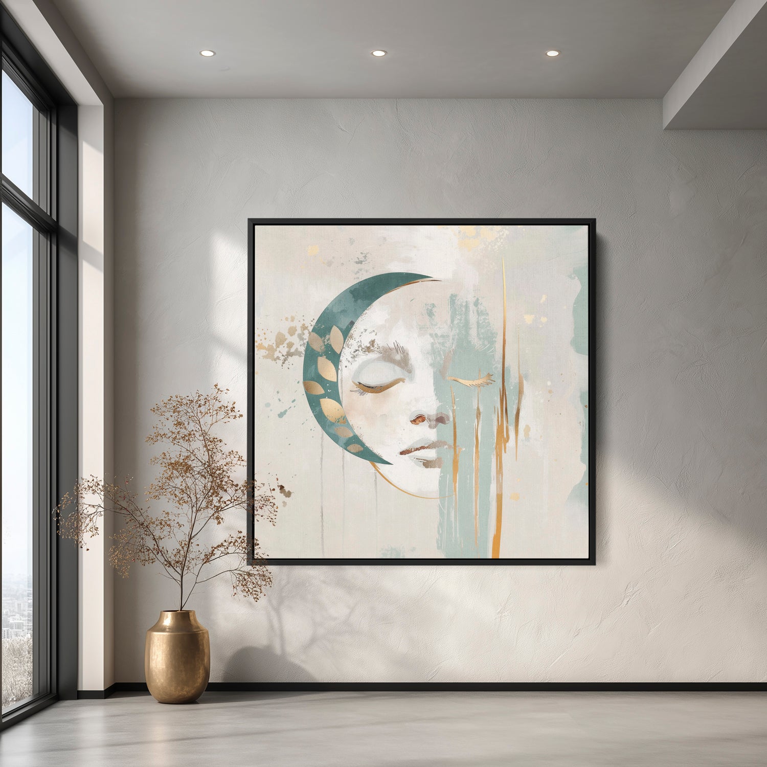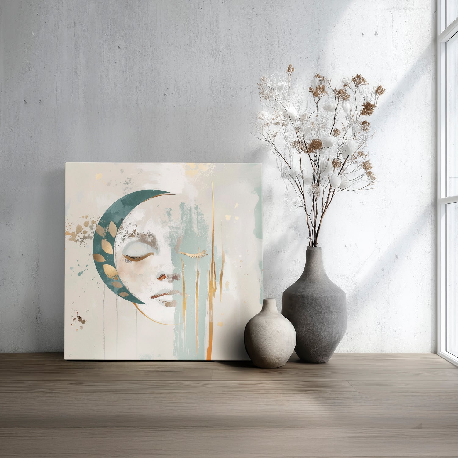 Luna Aurelia is an ethereal presence suspended between dream and dawn. Her face emerges like a whisper through soft washes of sage and gold, crowned by a crescent halo kissed with delicate leaves.