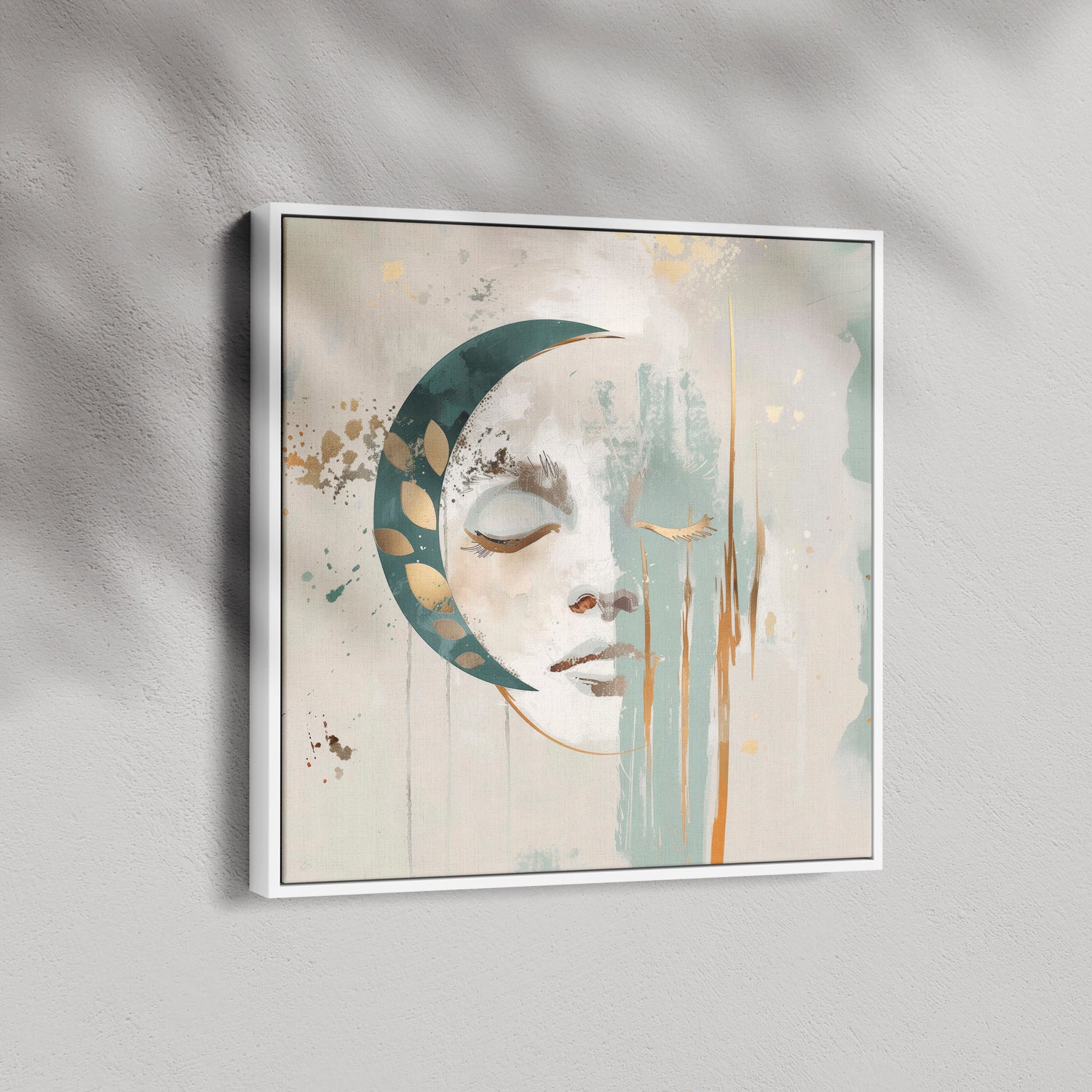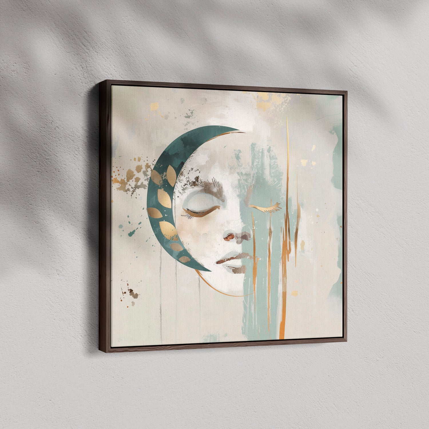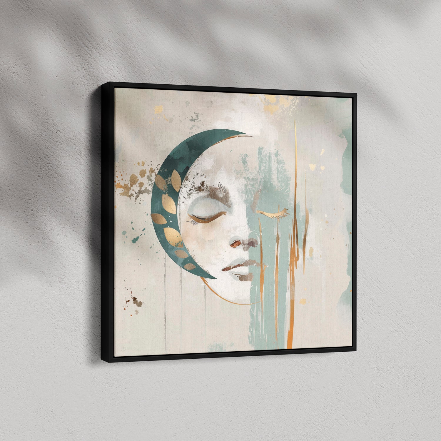 Luna Aurelia is an ethereal presence suspended between dream and dawn. Her face emerges like a whisper through soft washes of sage and gold, crowned by a crescent halo kissed with delicate leaves.
