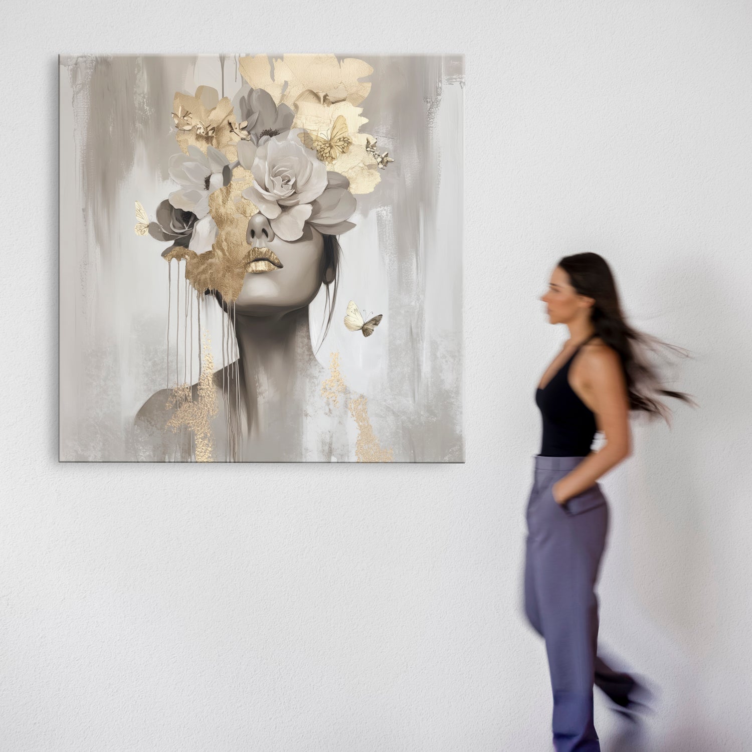 Petaldrip is like a dream dissolving into gold. Her lips gleam in silence, her gaze hidden beneath cascading florals and molten petals. Each golden drip carries emotion, each bloom a whisper from the unseen.
