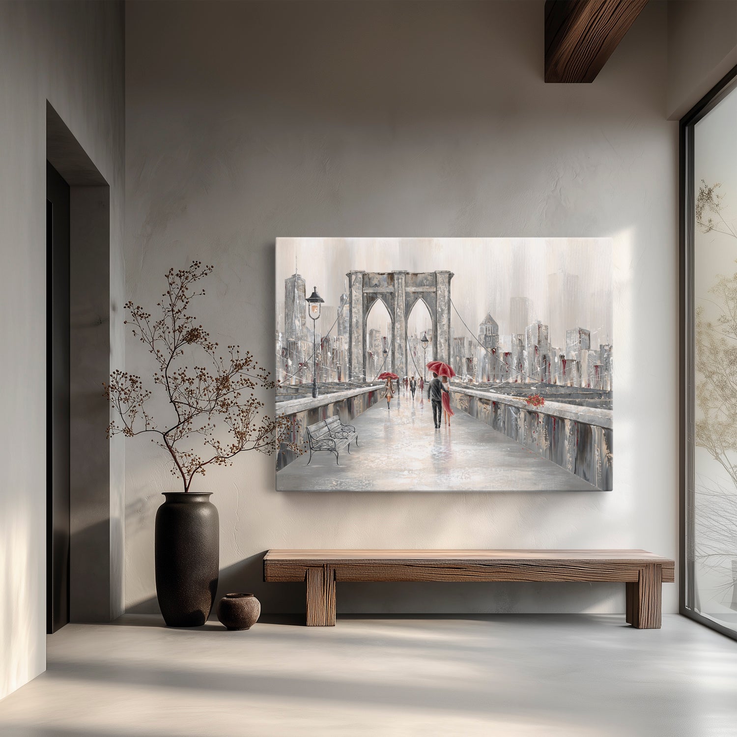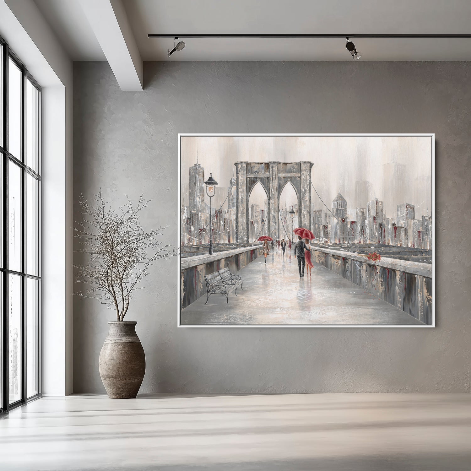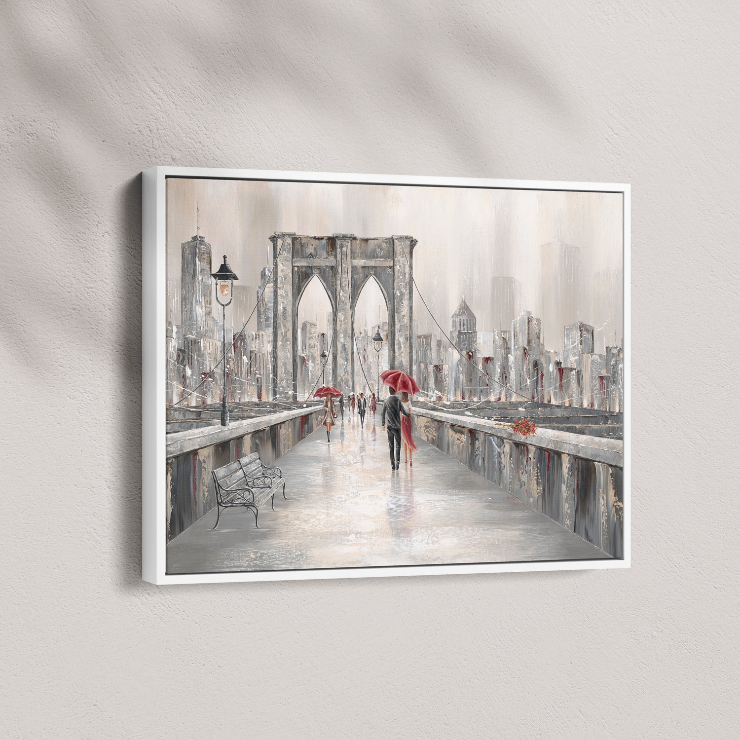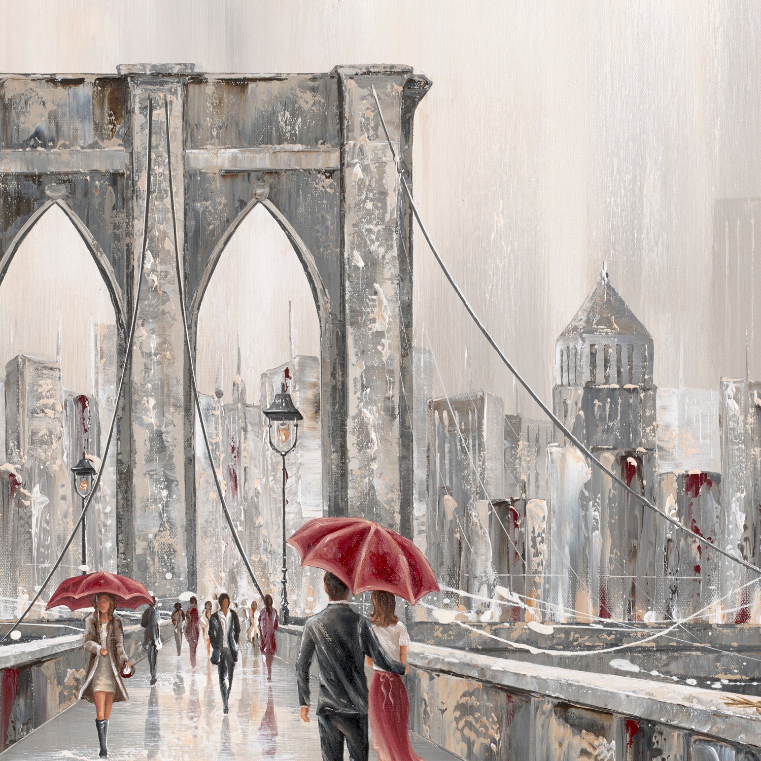 Roses, Brooklyn Bridge is a monochromatic painting which features hints of striking red throughout. This painting leaves an enchanting story behind depicted by the bunch of Roses left on the Bridge's rail. Perhaps a story of love, or even a story of loss or sorrow, the interpretation is in the eye of the beholder…