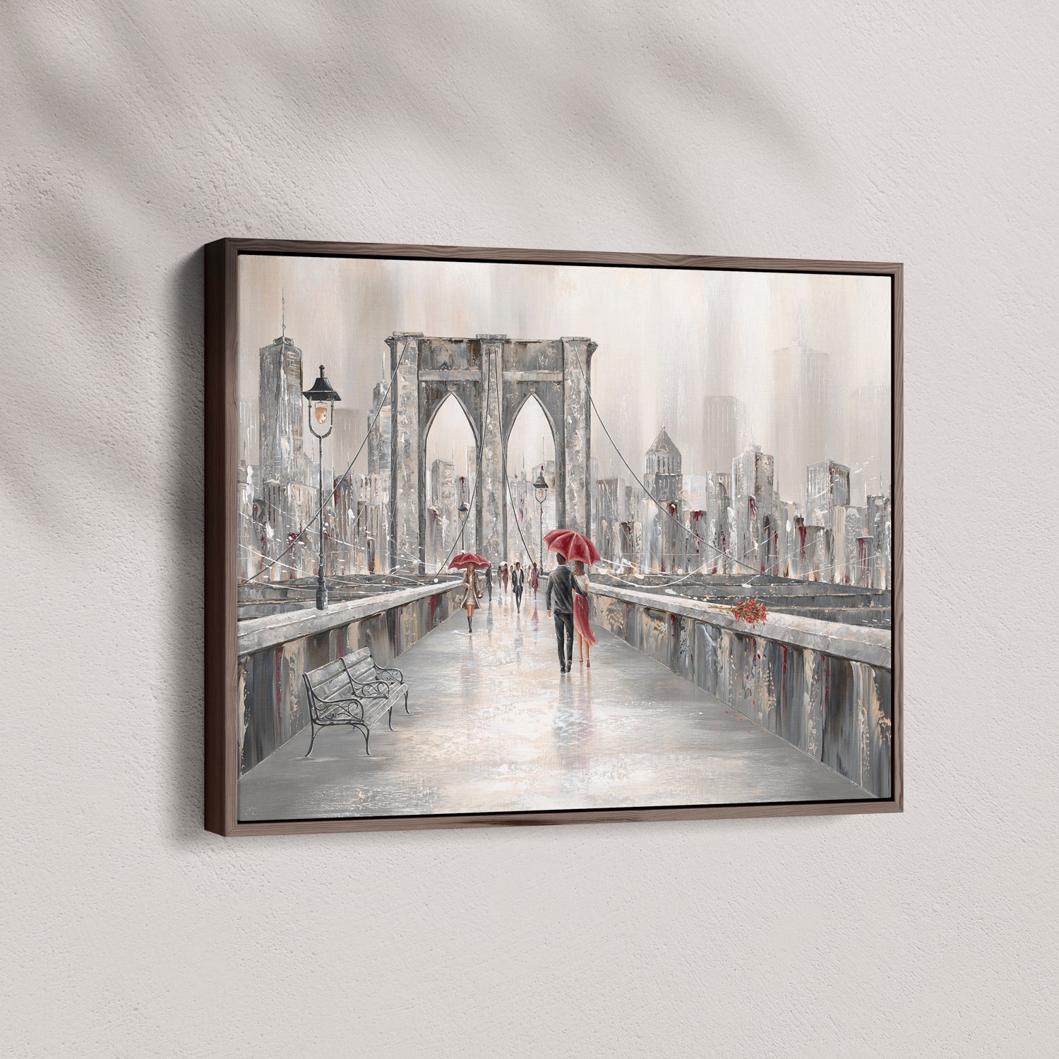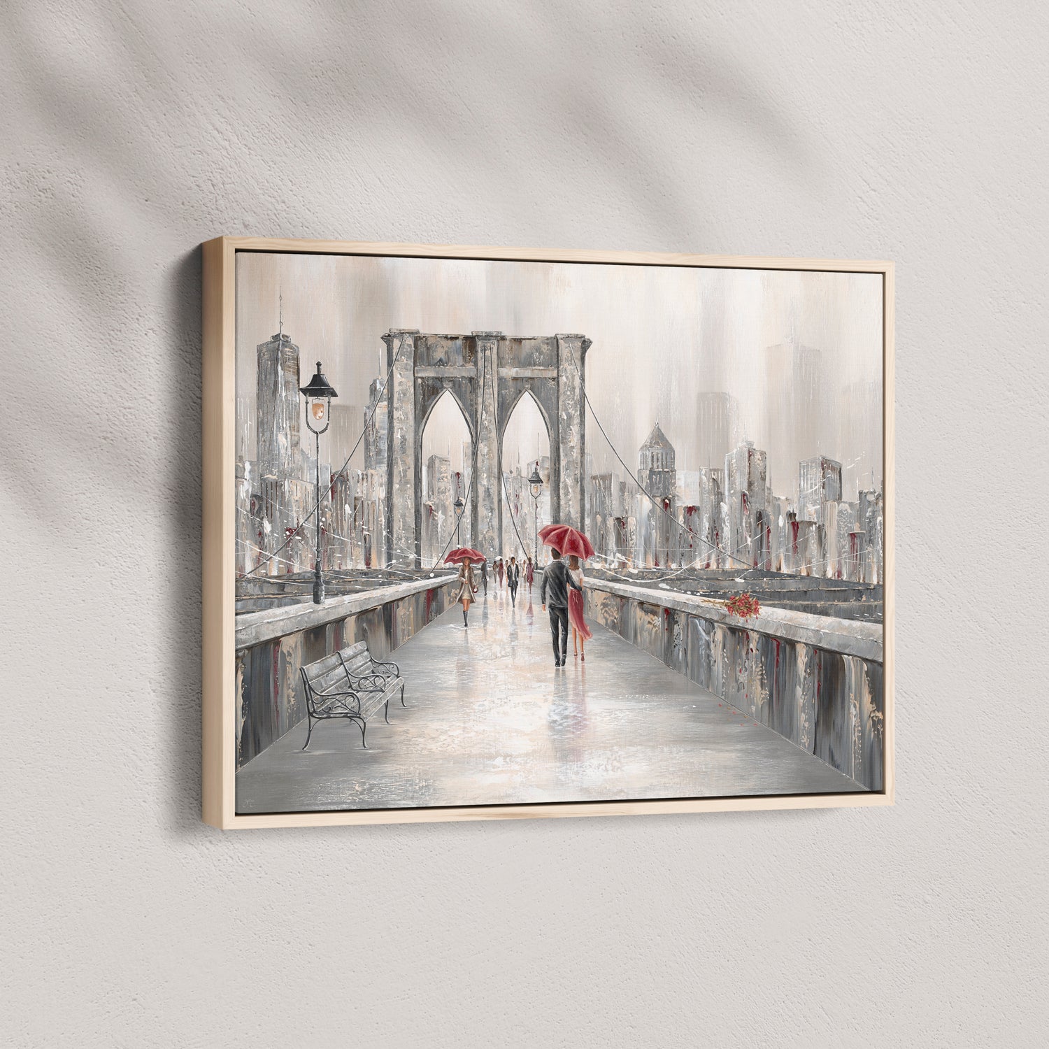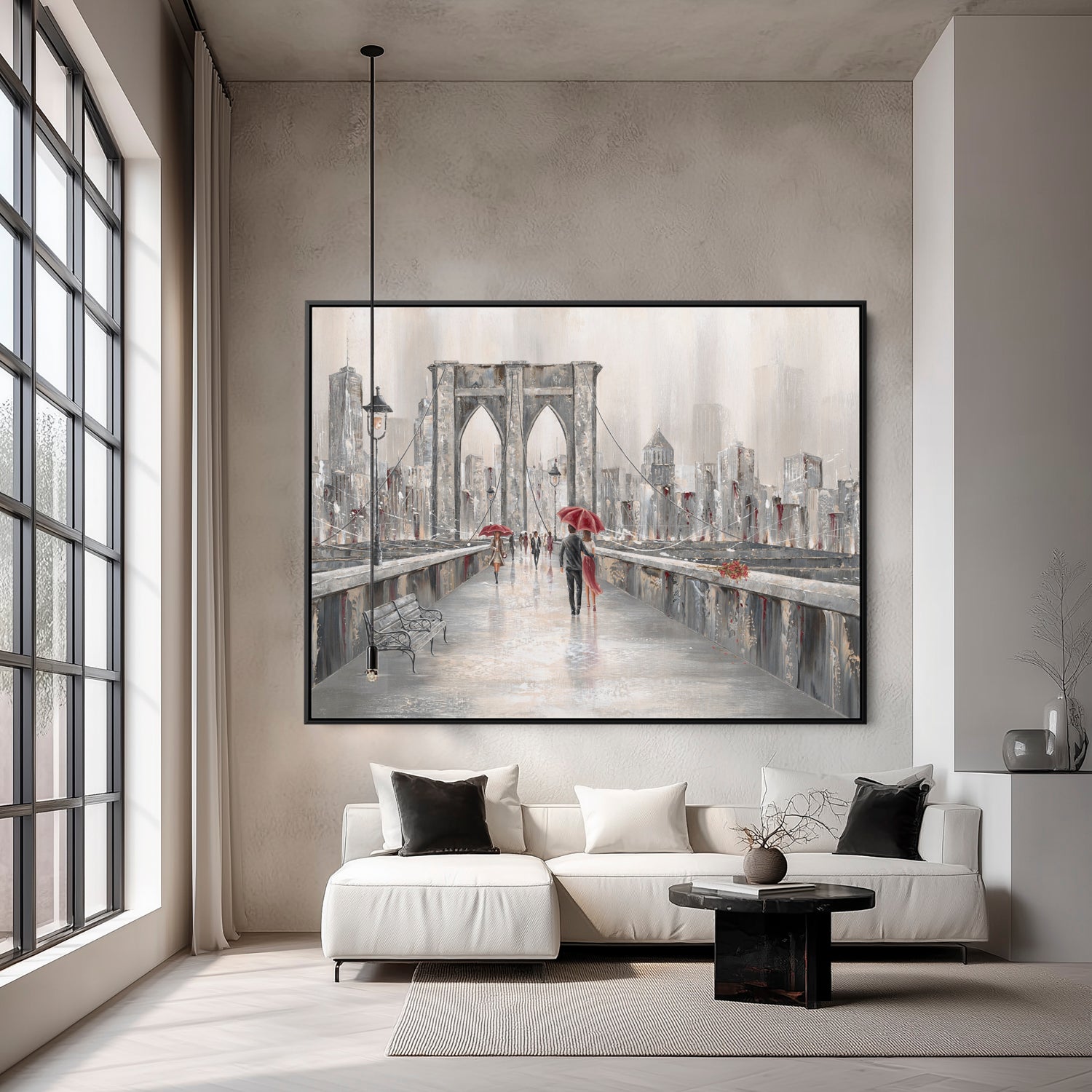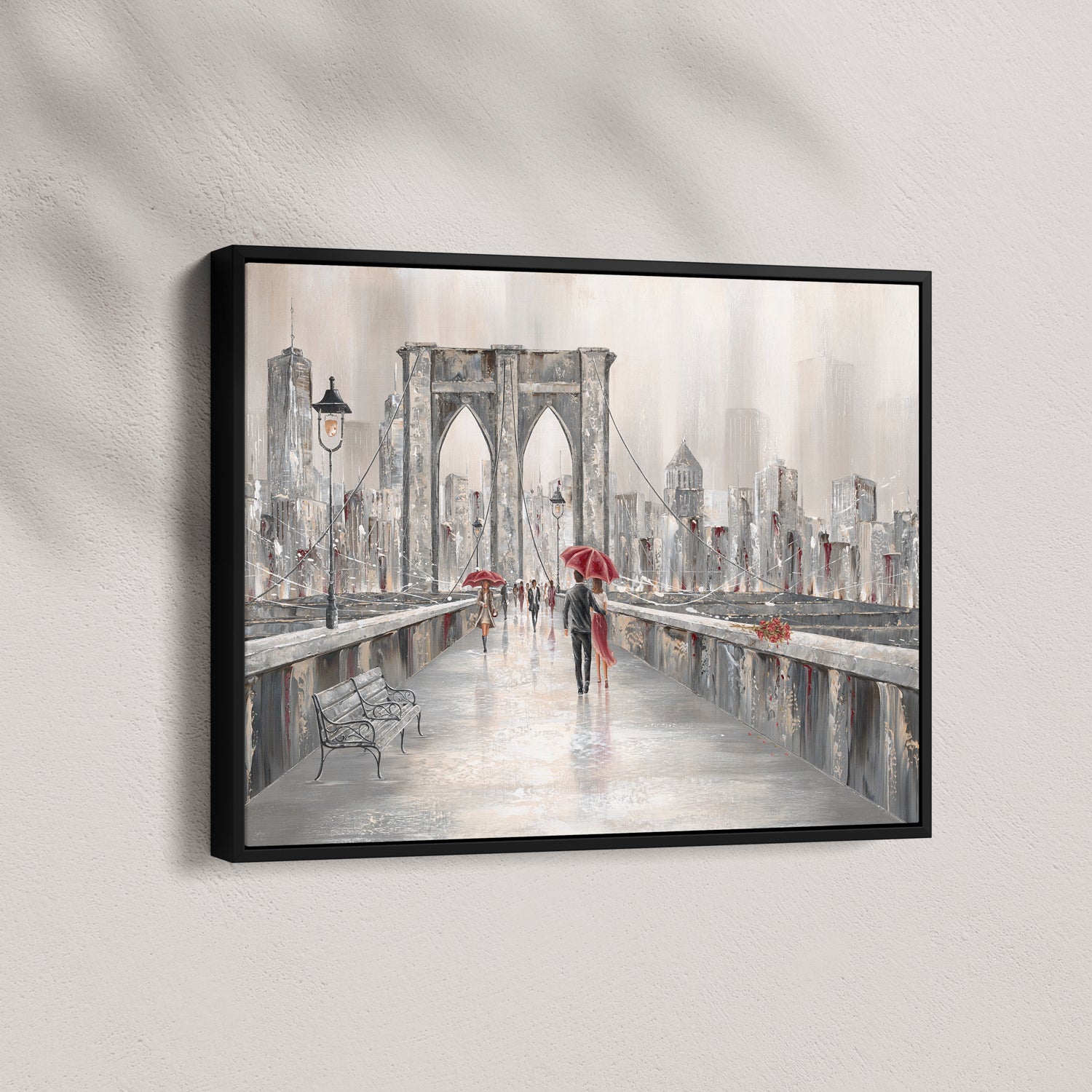 Roses, Brooklyn Bridge is a monochromatic painting which features hints of striking red throughout. This painting leaves an enchanting story behind depicted by the bunch of Roses left on the Bridge's rail. Perhaps a story of love, or even a story of loss or sorrow, the interpretation is in the eye of the beholder…