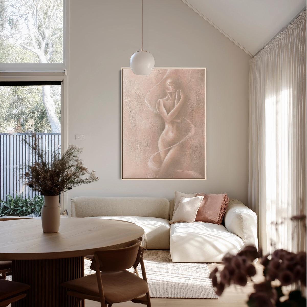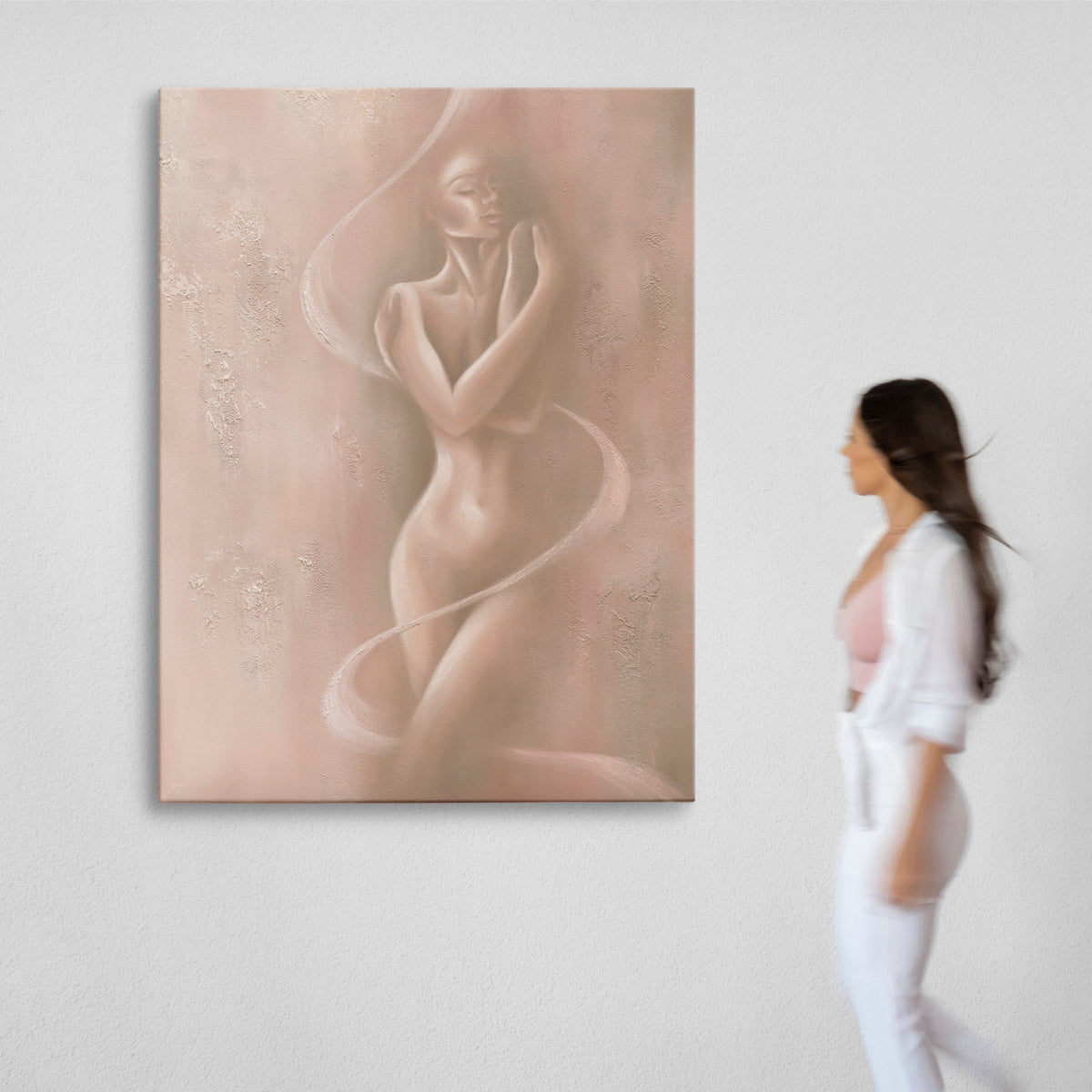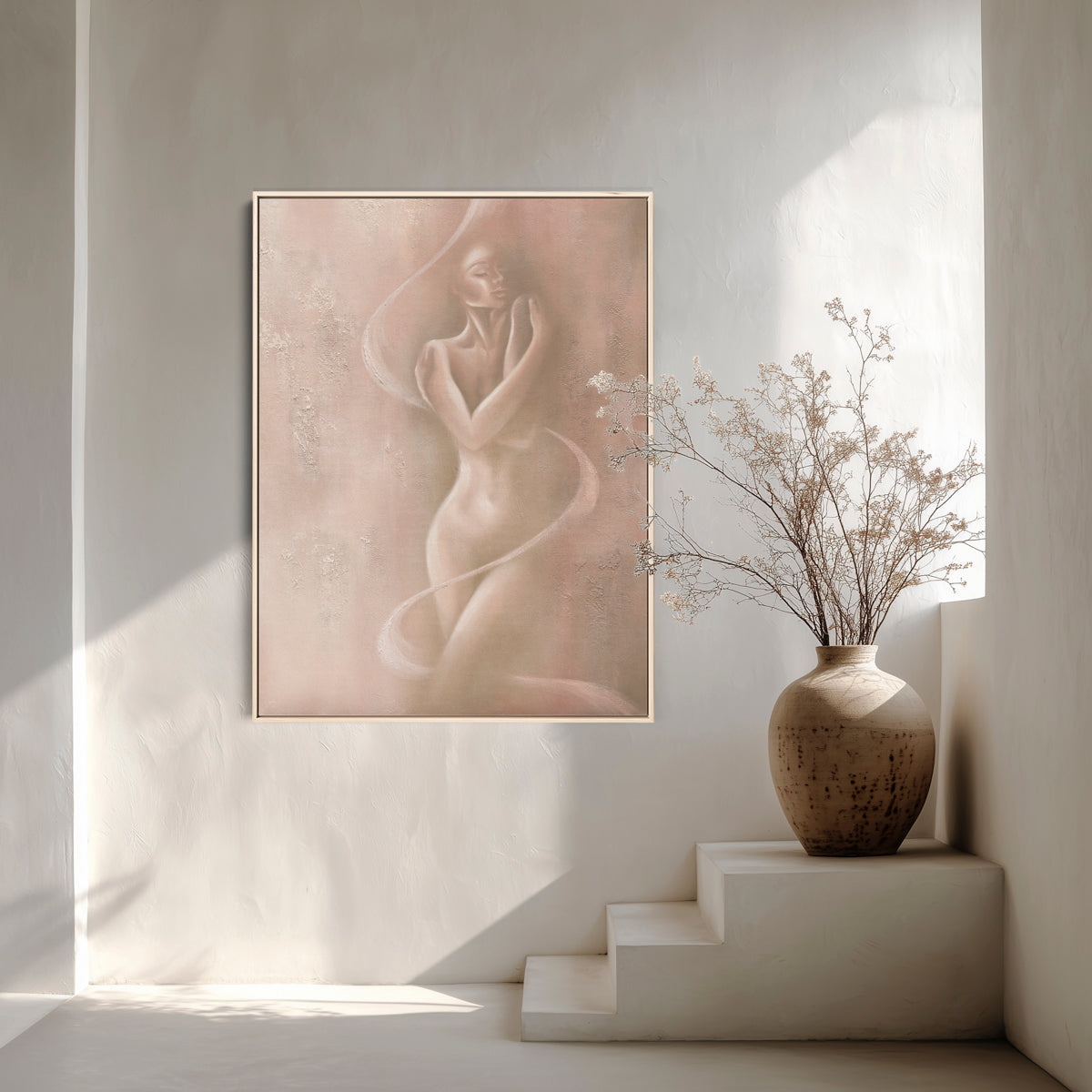 Self Love is a tender portrayal of a woman embracing herself, enveloped in a soft, pink glow that radiates warmth and affection. The artwork invites viewers to reflect on the importance of nurturing love for oneself, capturing the serene and powerful journey of self-discovery and the embracing of one's own being with kindness and grace.