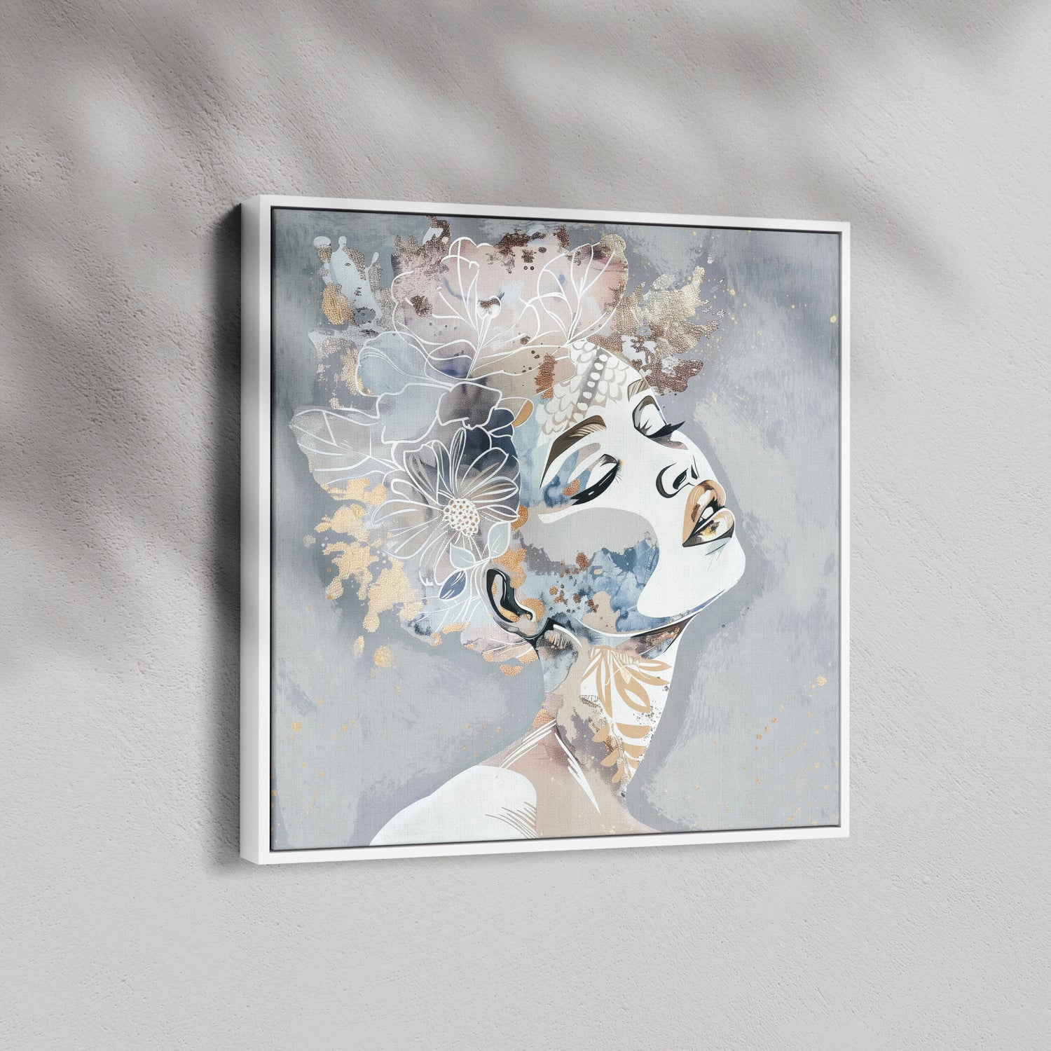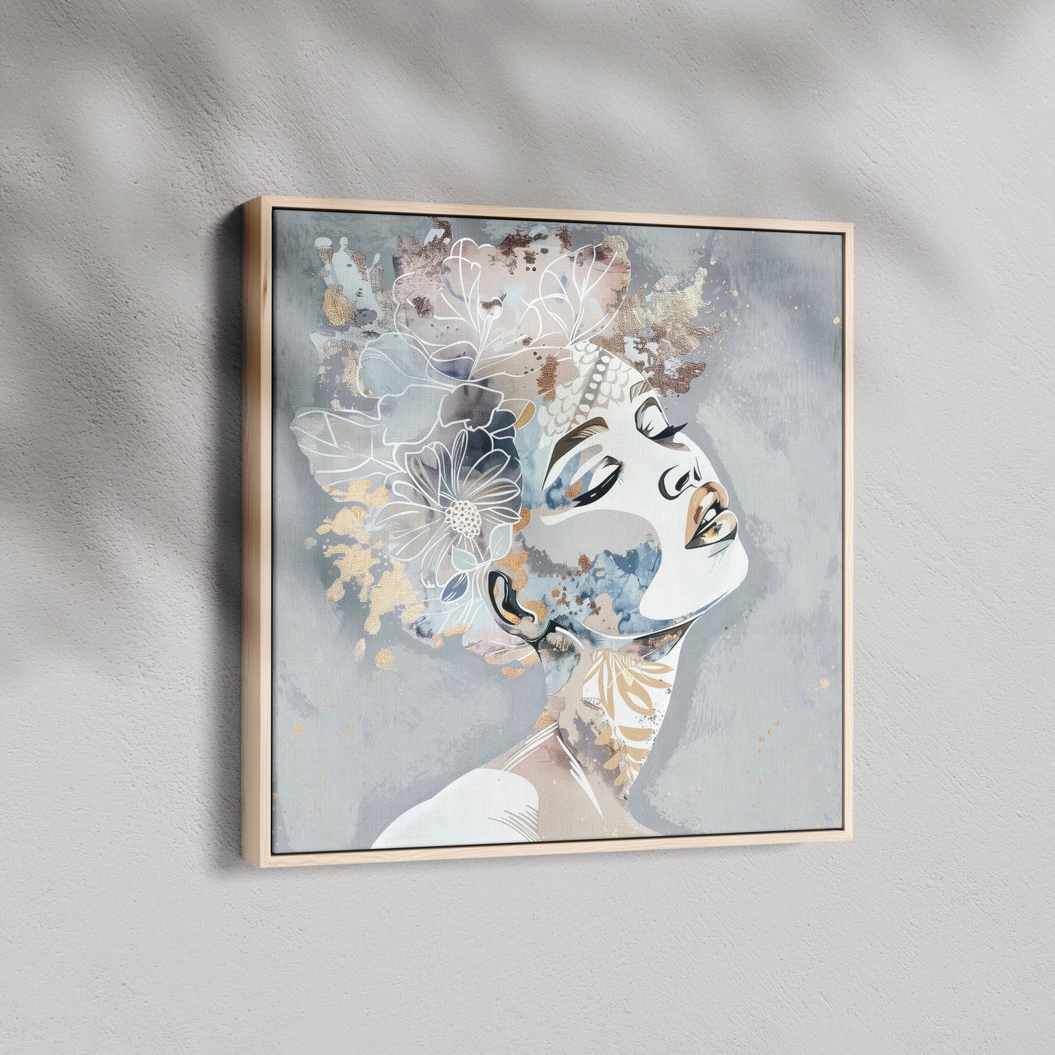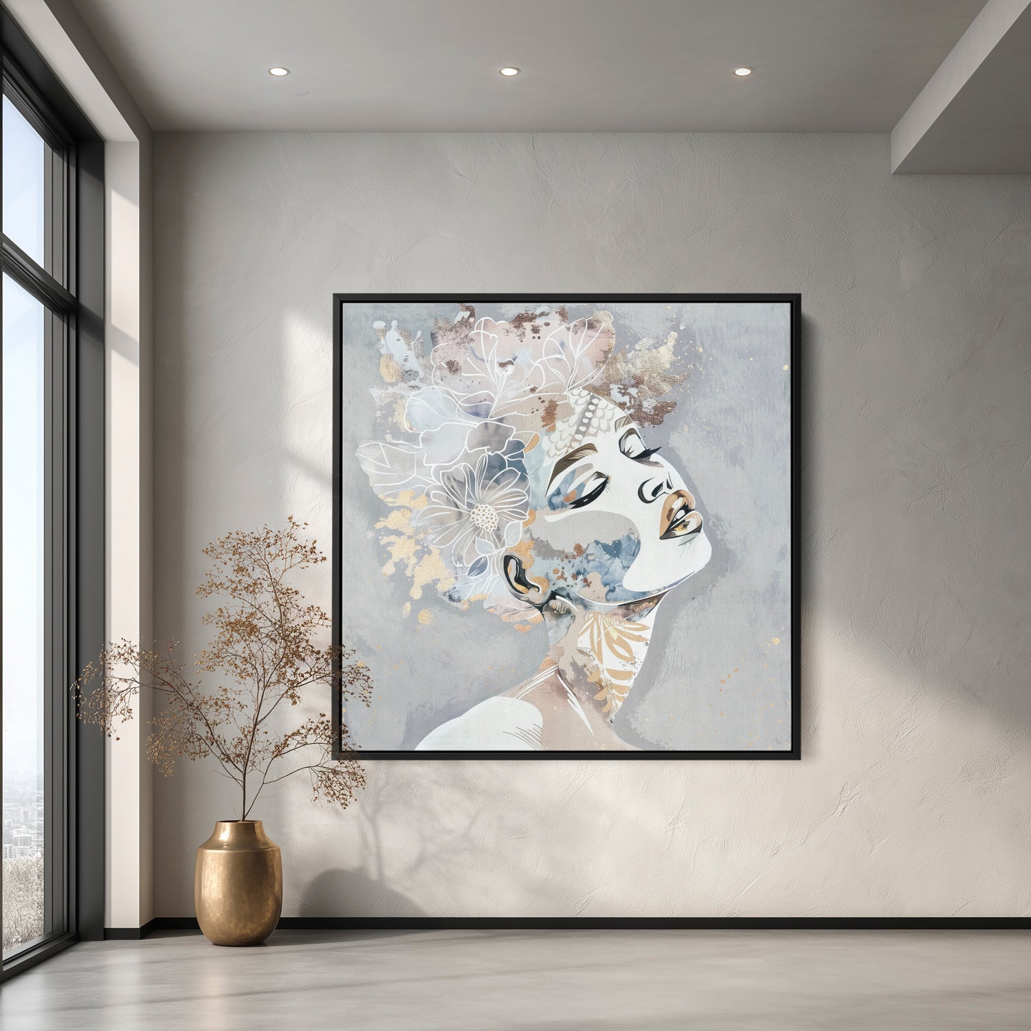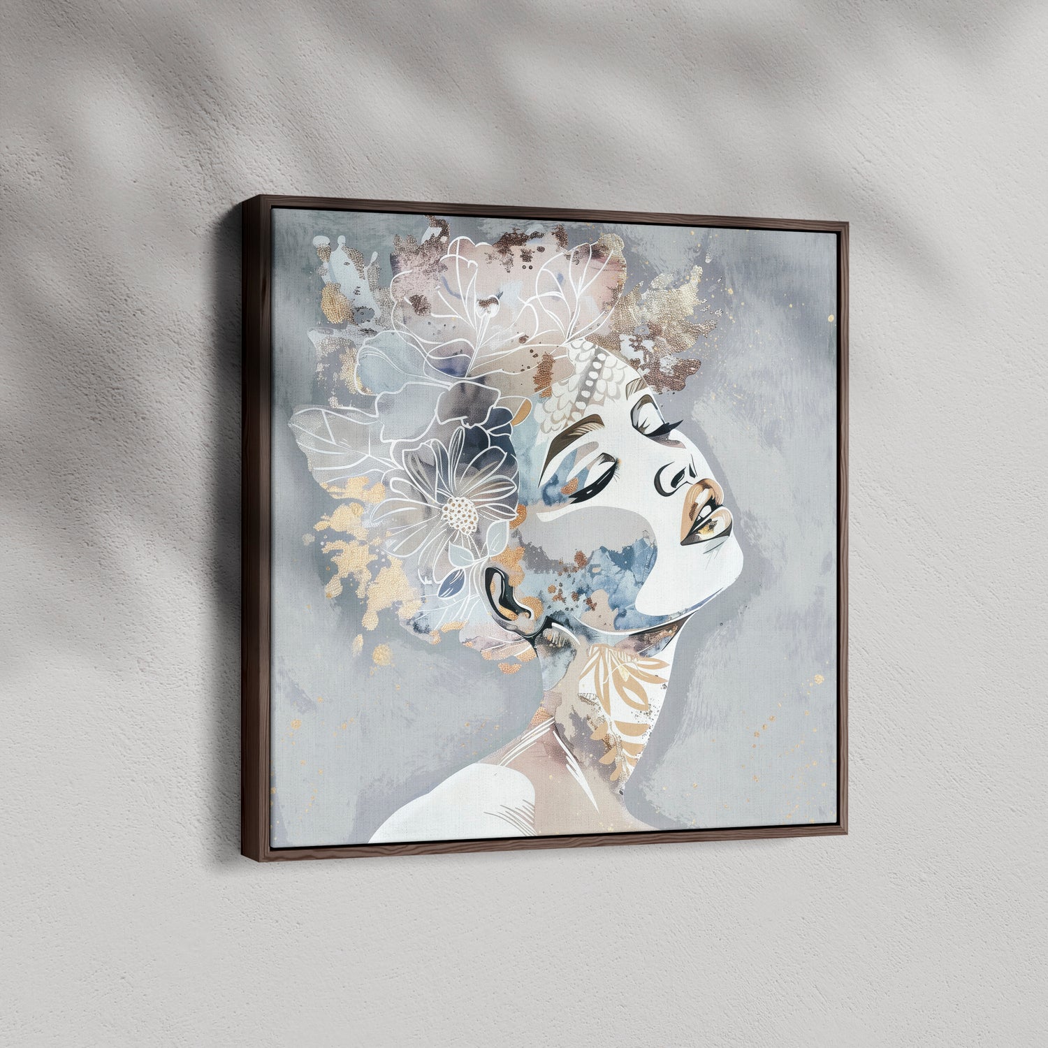 A delicate fusion of cosmos and soul, her presence feels like silence just before a wish. Light traces her silhouette with celestial dust, while soft florals echo in muted metallics. Every shade whispers serenity, every curve is an testament to the divine feminine. The glints of copper and gold feel both modern and ancient, like she belongs in every era.