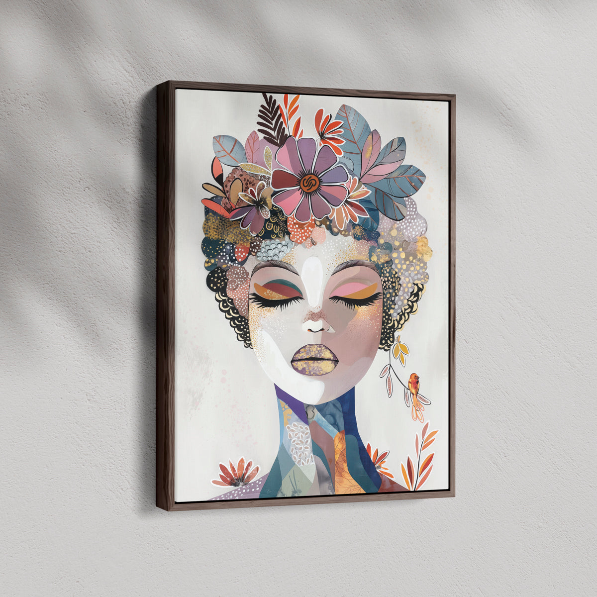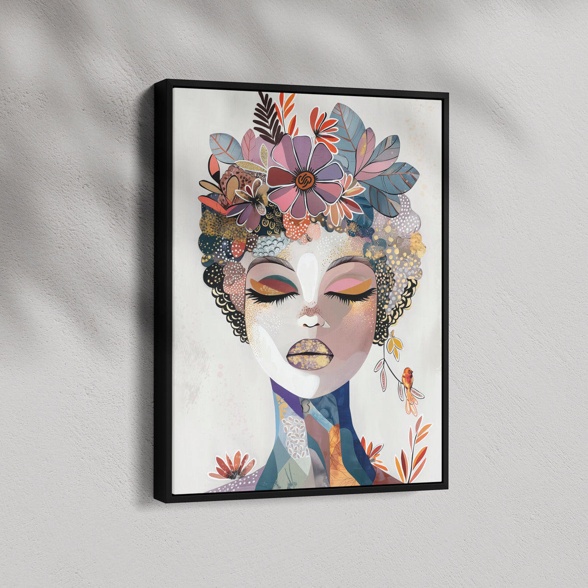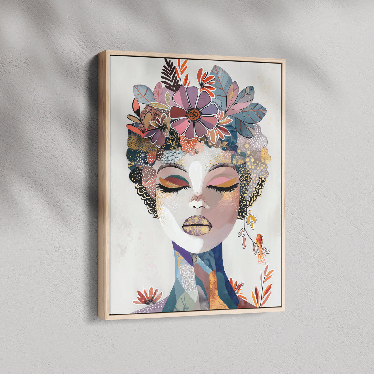 Crowned in bold blooms and painted with the colours of dusk and dawn, she radiates a strength that feels both joyful and regal. Her skin glows beneath playful bursts of orange, pink, and gold, while tiny details tell stories of life, rhythm, and soul.