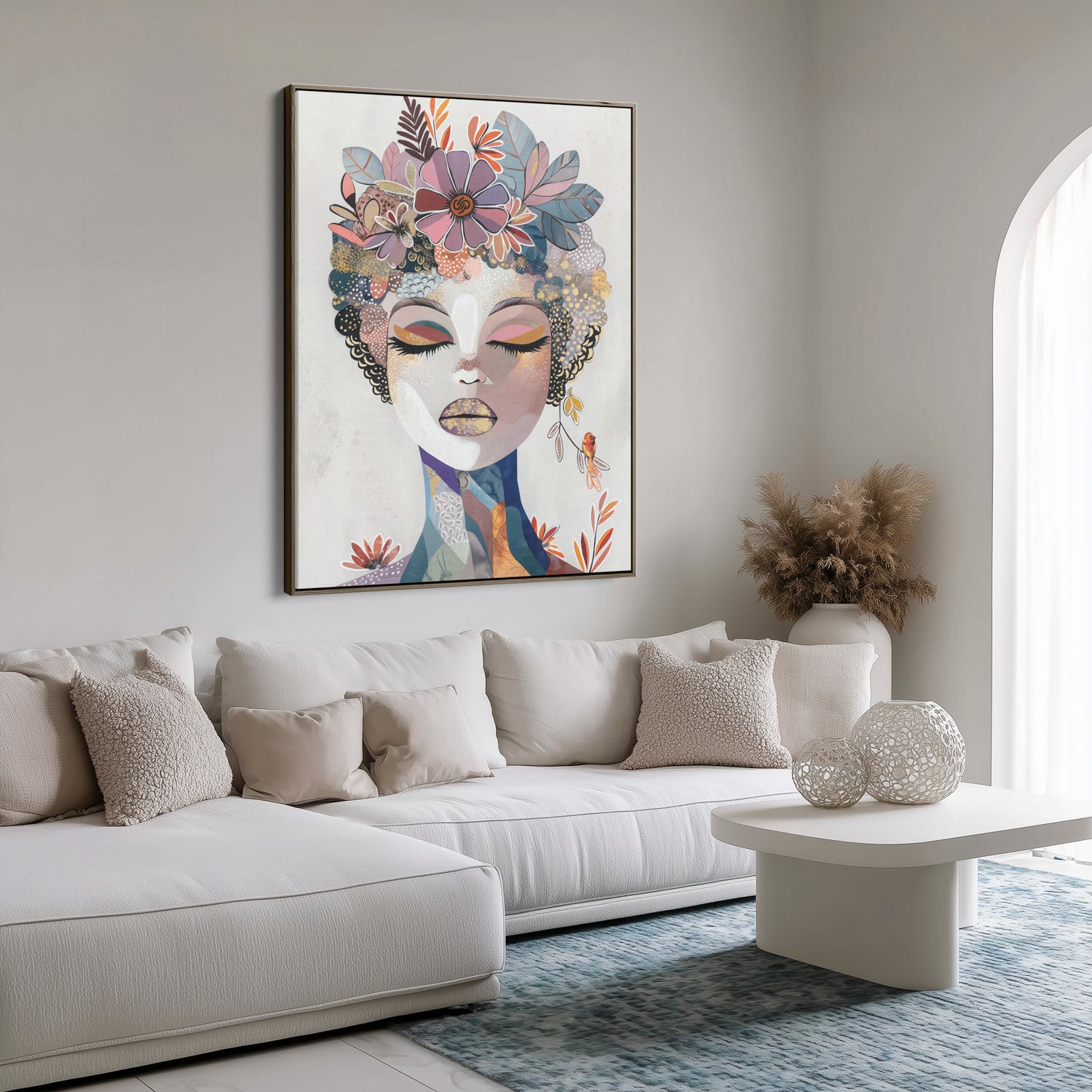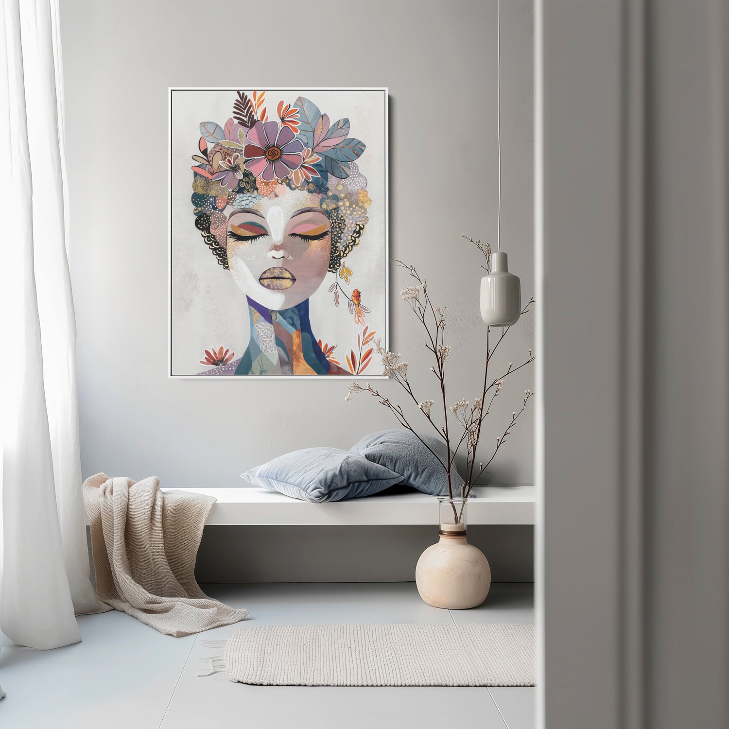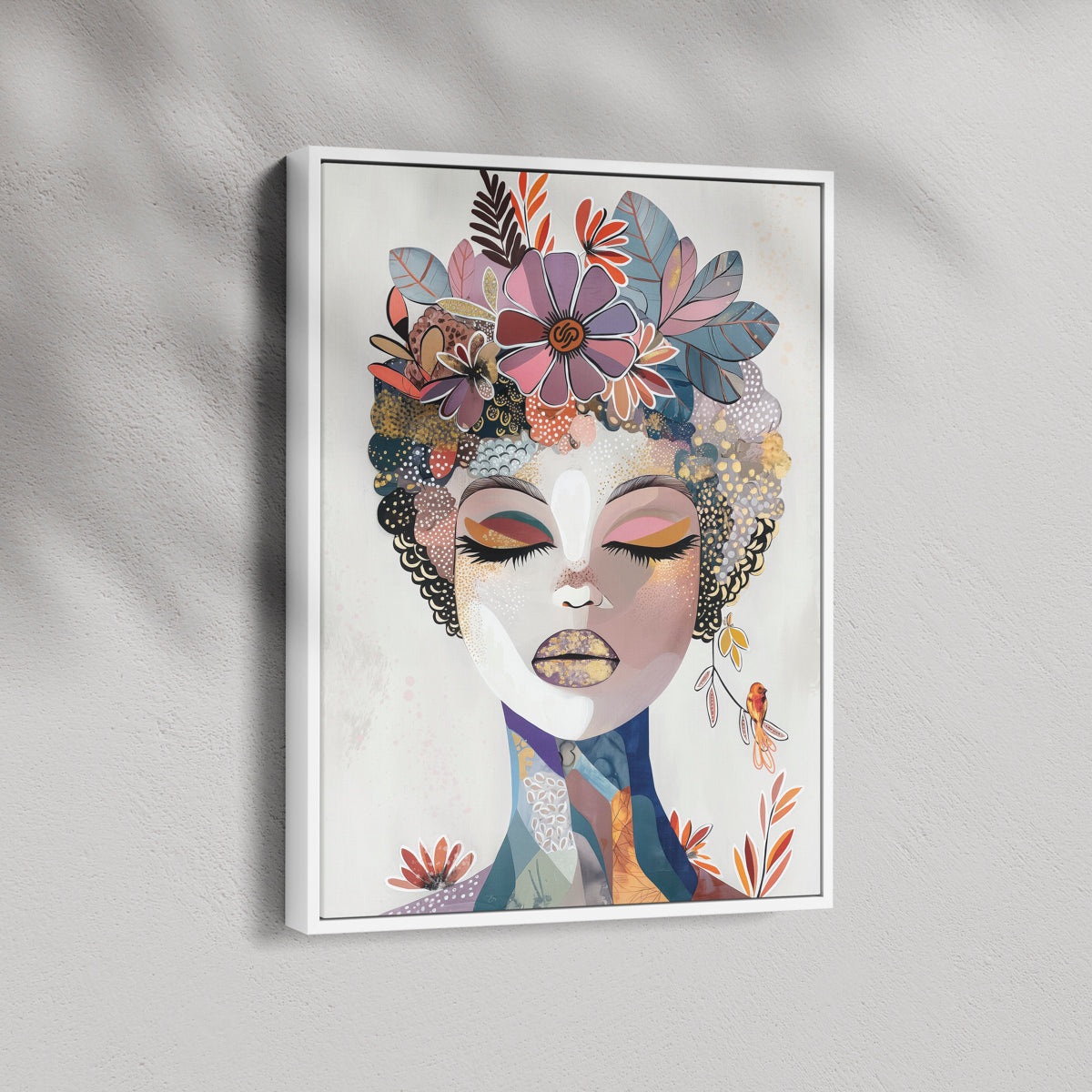 Crowned in bold blooms and painted with the colours of dusk and dawn, she radiates a strength that feels both joyful and regal. Her skin glows beneath playful bursts of orange, pink, and gold, while tiny details tell stories of life, rhythm, and soul.